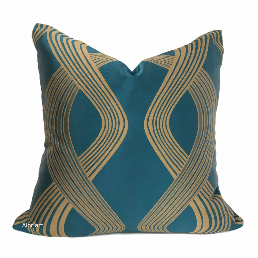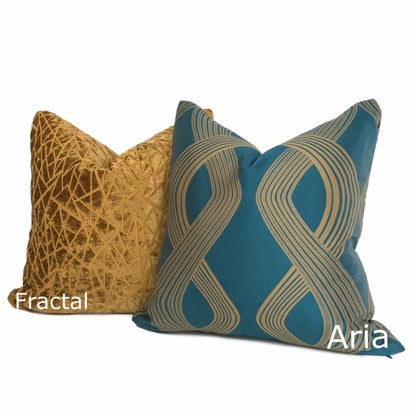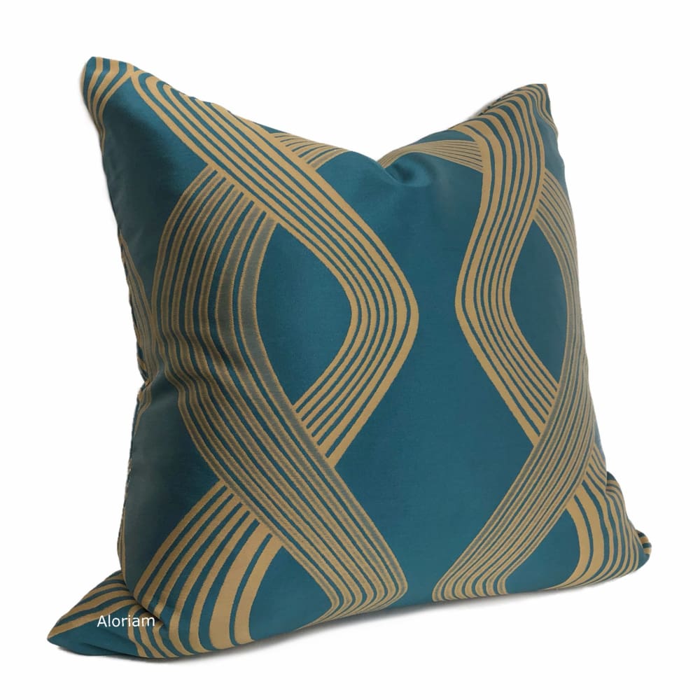 The Aria pillow cover features a captivating modern design of twisting ribbon stripes woven in tan brown on a teal green background. Pattern fabric is a lustrous jacquard woven drapery weight polyester fabric, and is used on both sides. Photographed on 19x19 cover (filled with 20x20 insert).