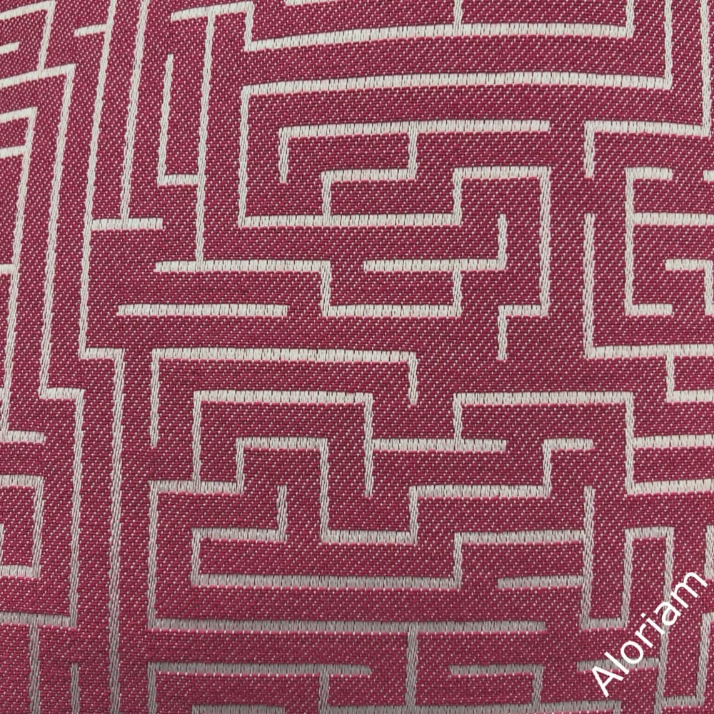 The Ariadne pillow cover features a geometric maze design woven in pink and grayish off-white.