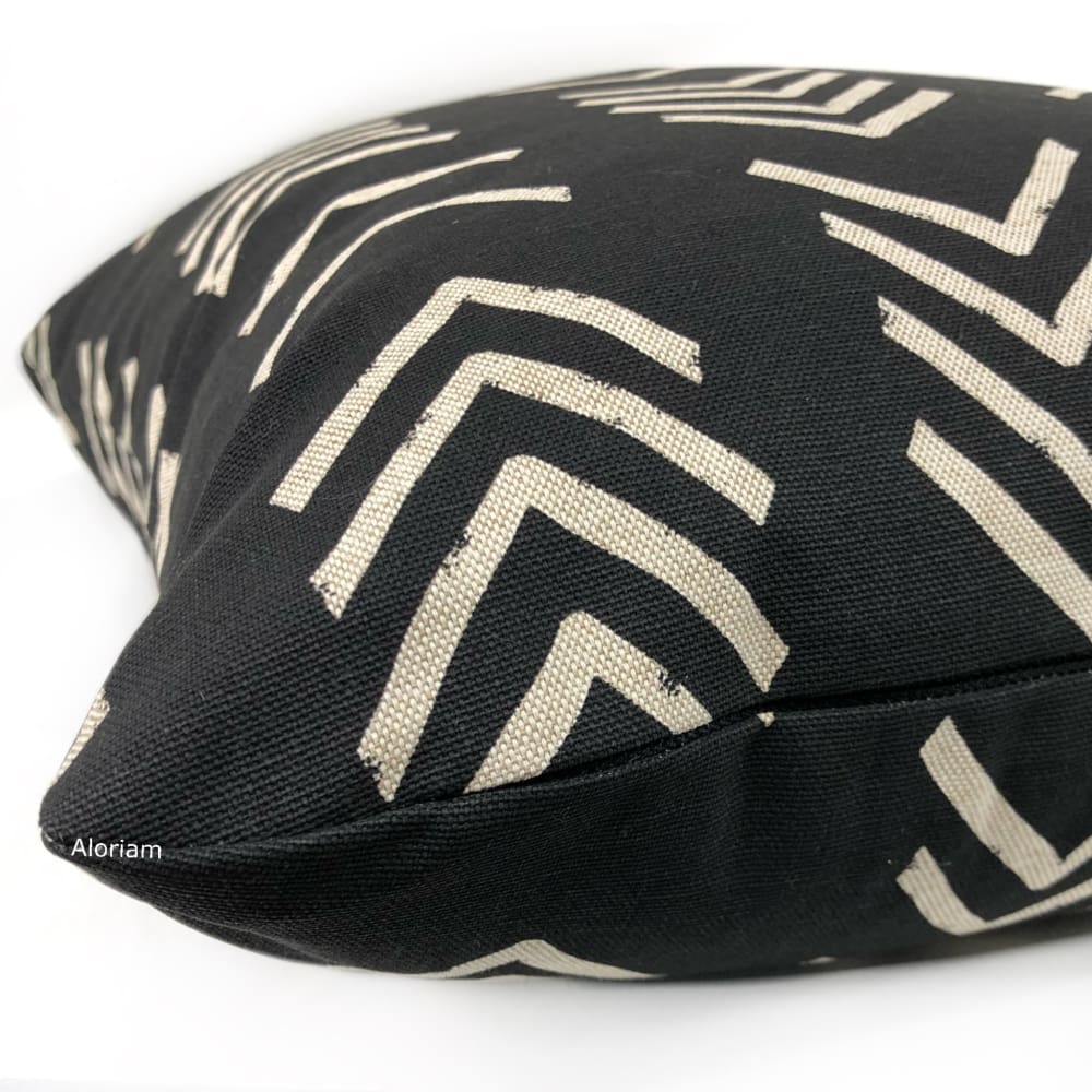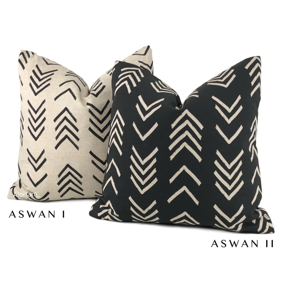 Aswan II is a tribal style pillow cover featuring a beige arrow pattern printed on a black background.