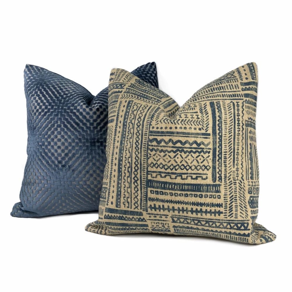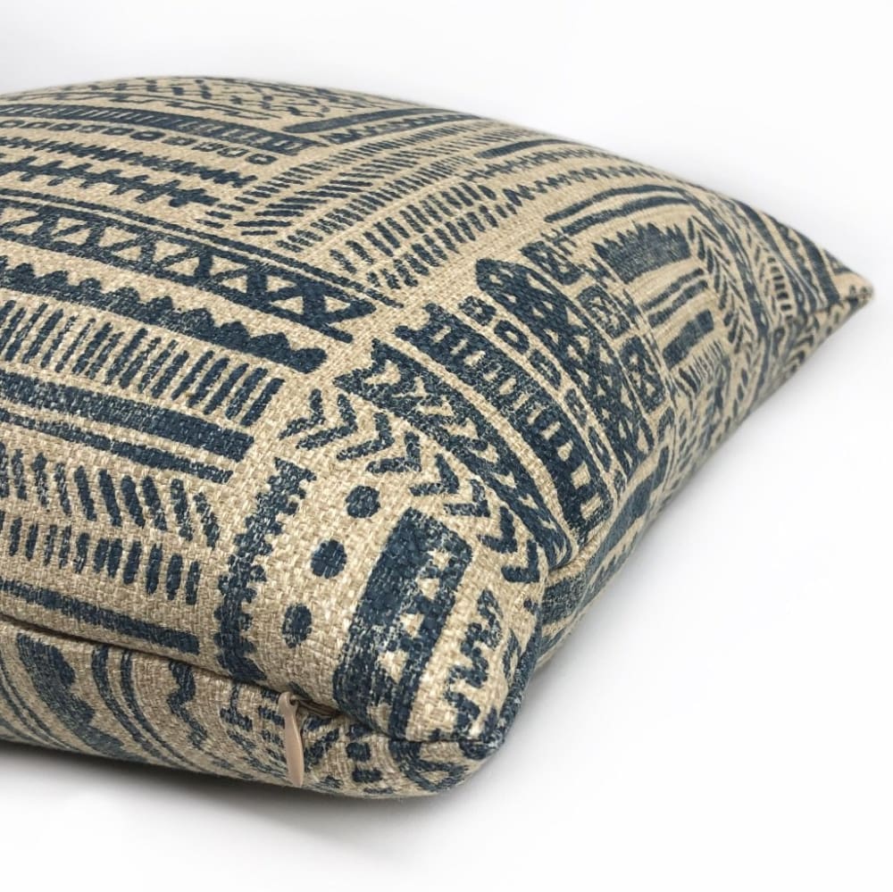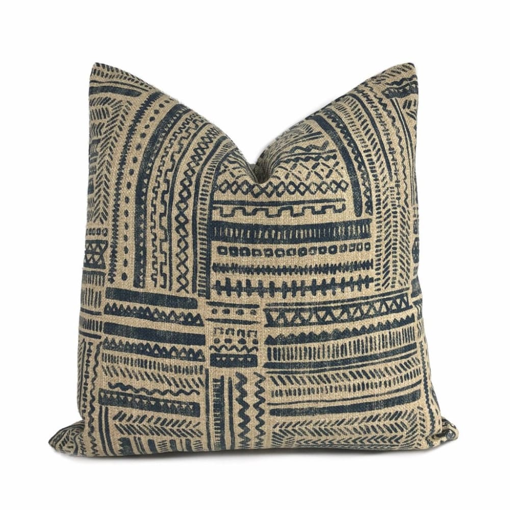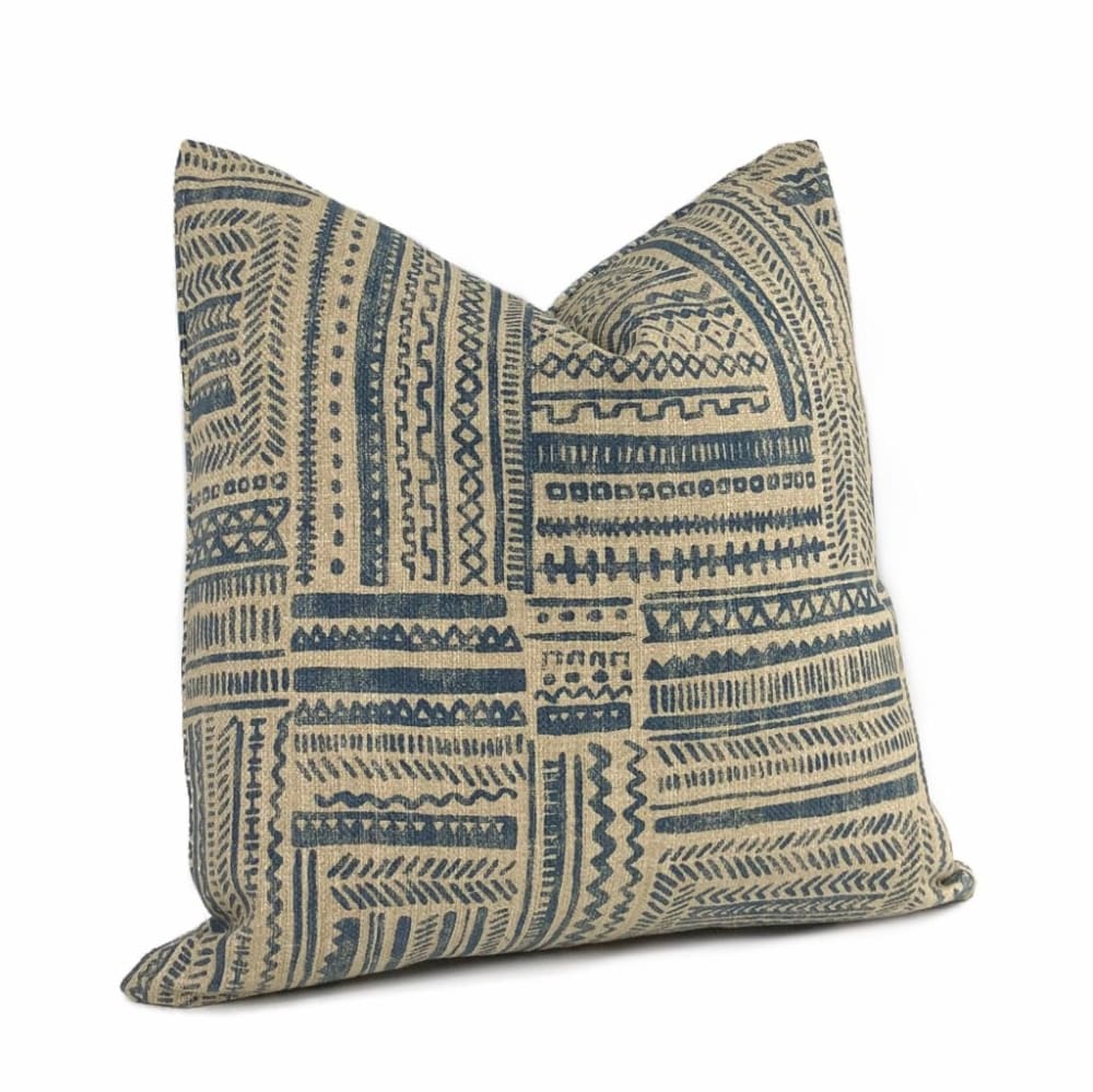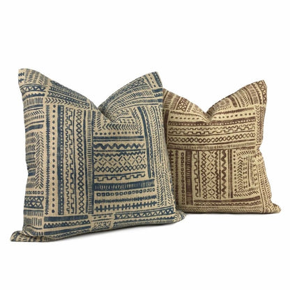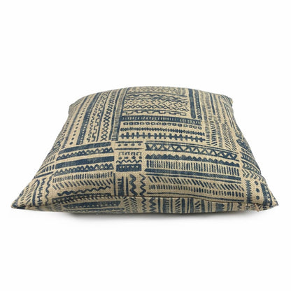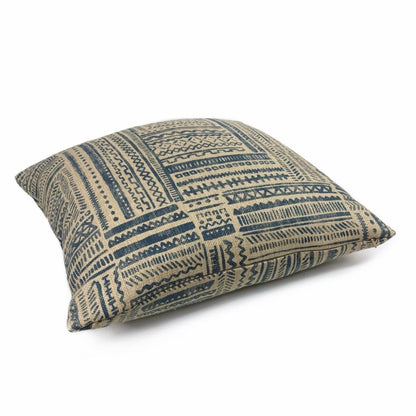 Banba is a limited edition ethnic pillow cover featuring an African mudcloth inspired design. Tribal patterns are printed on heavyweight basketweave cotton in colors of blue and tan.