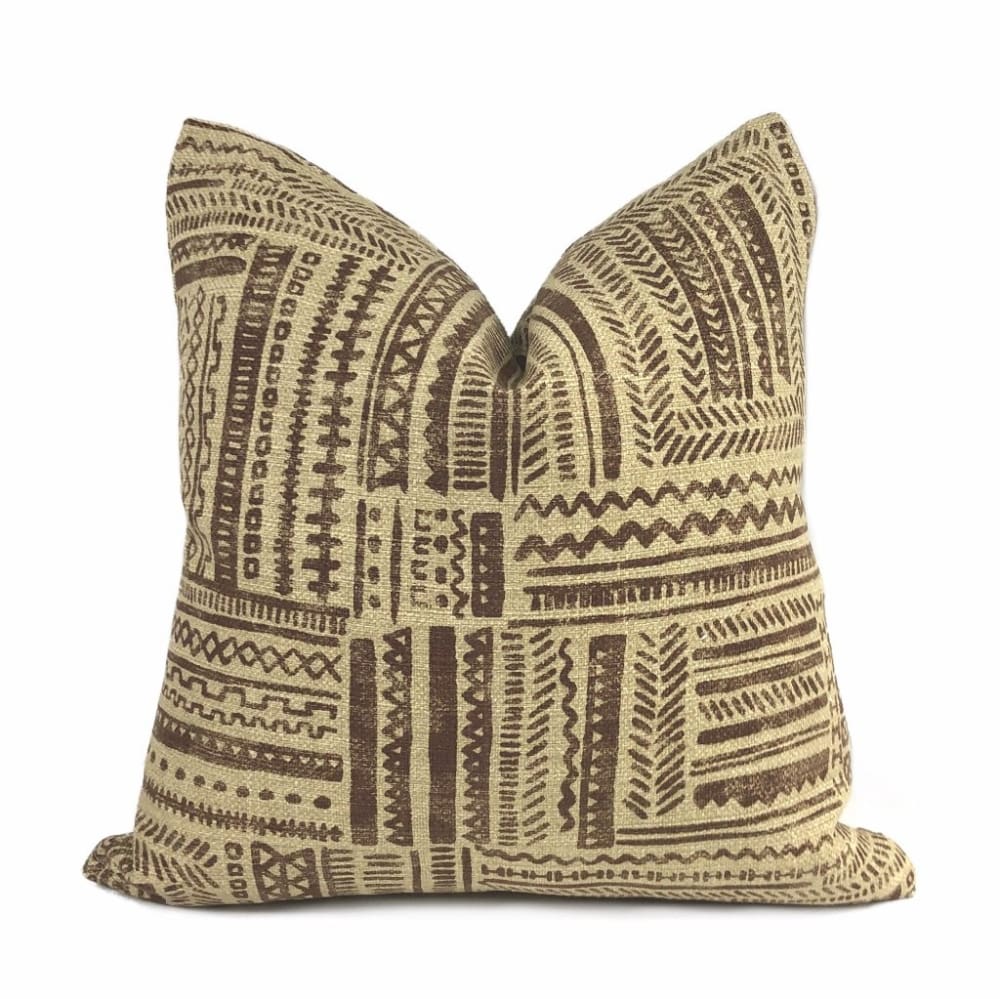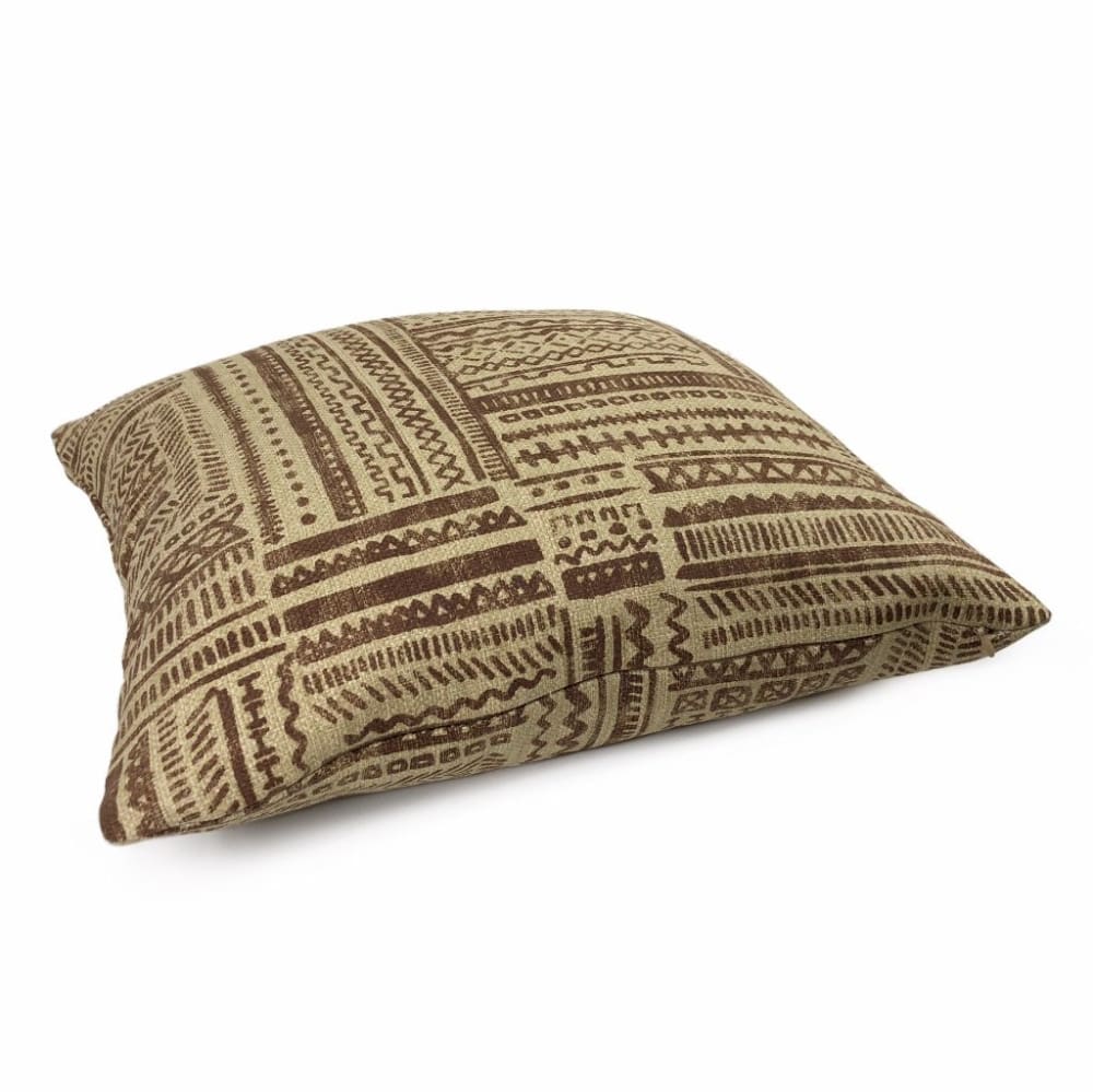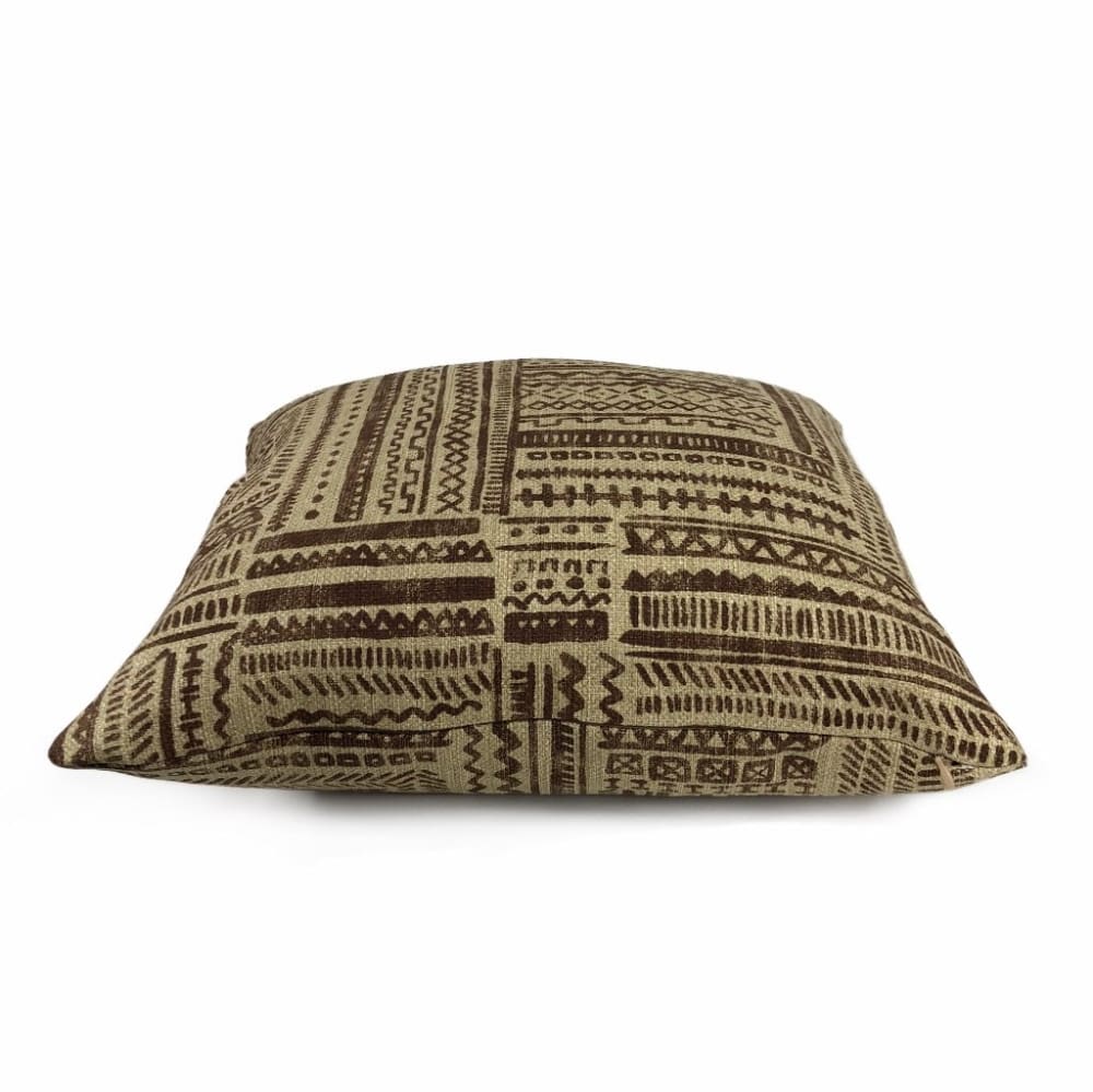 Banba is a limited edition ethnic pillow cover featuring an African mudcloth inspired design. Tribal patterns are printed on heavyweight basketweave cotton in colors of brown and tan.