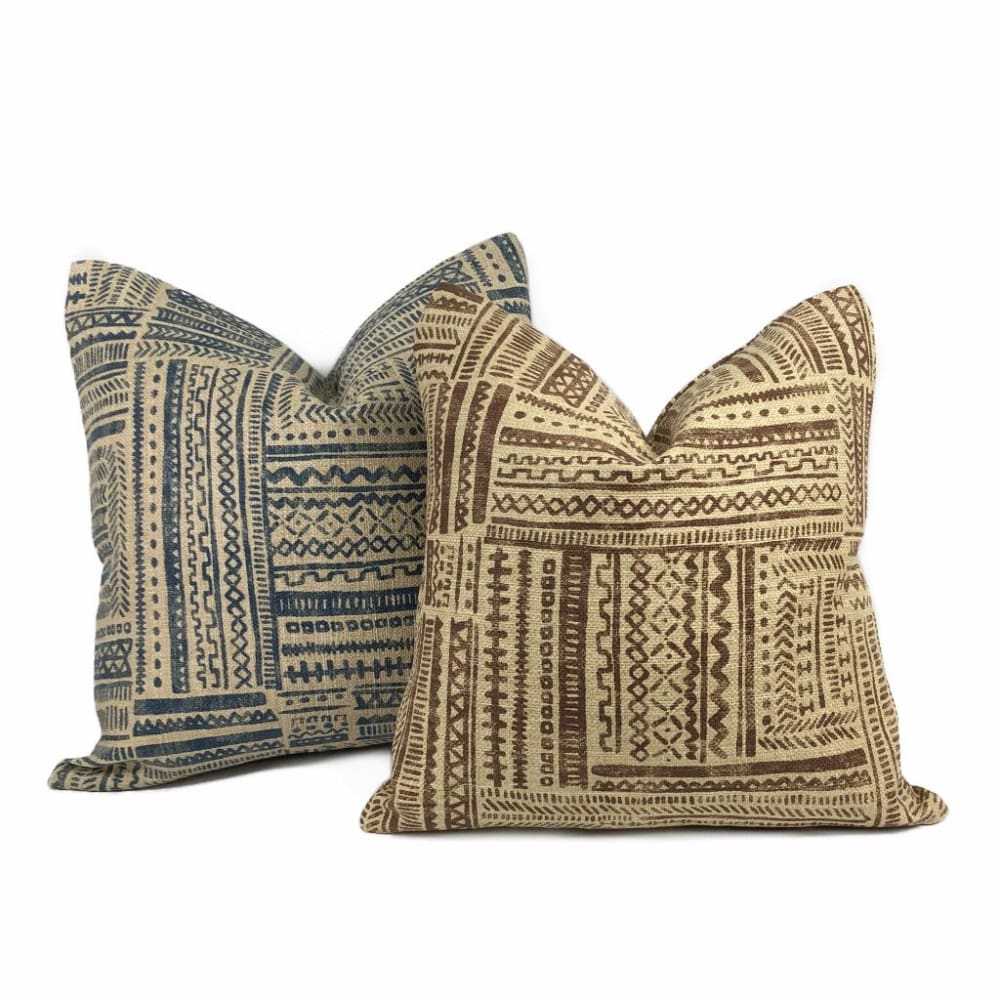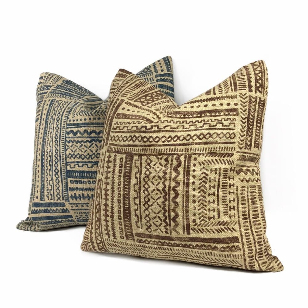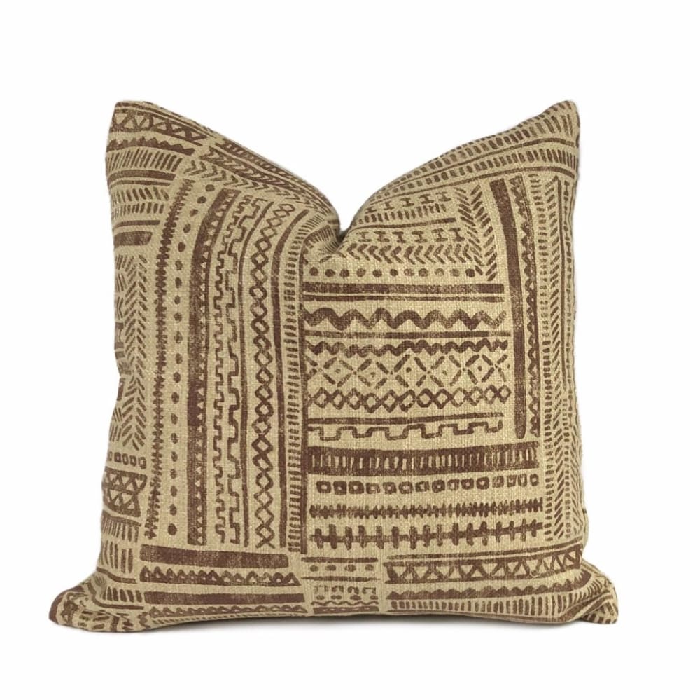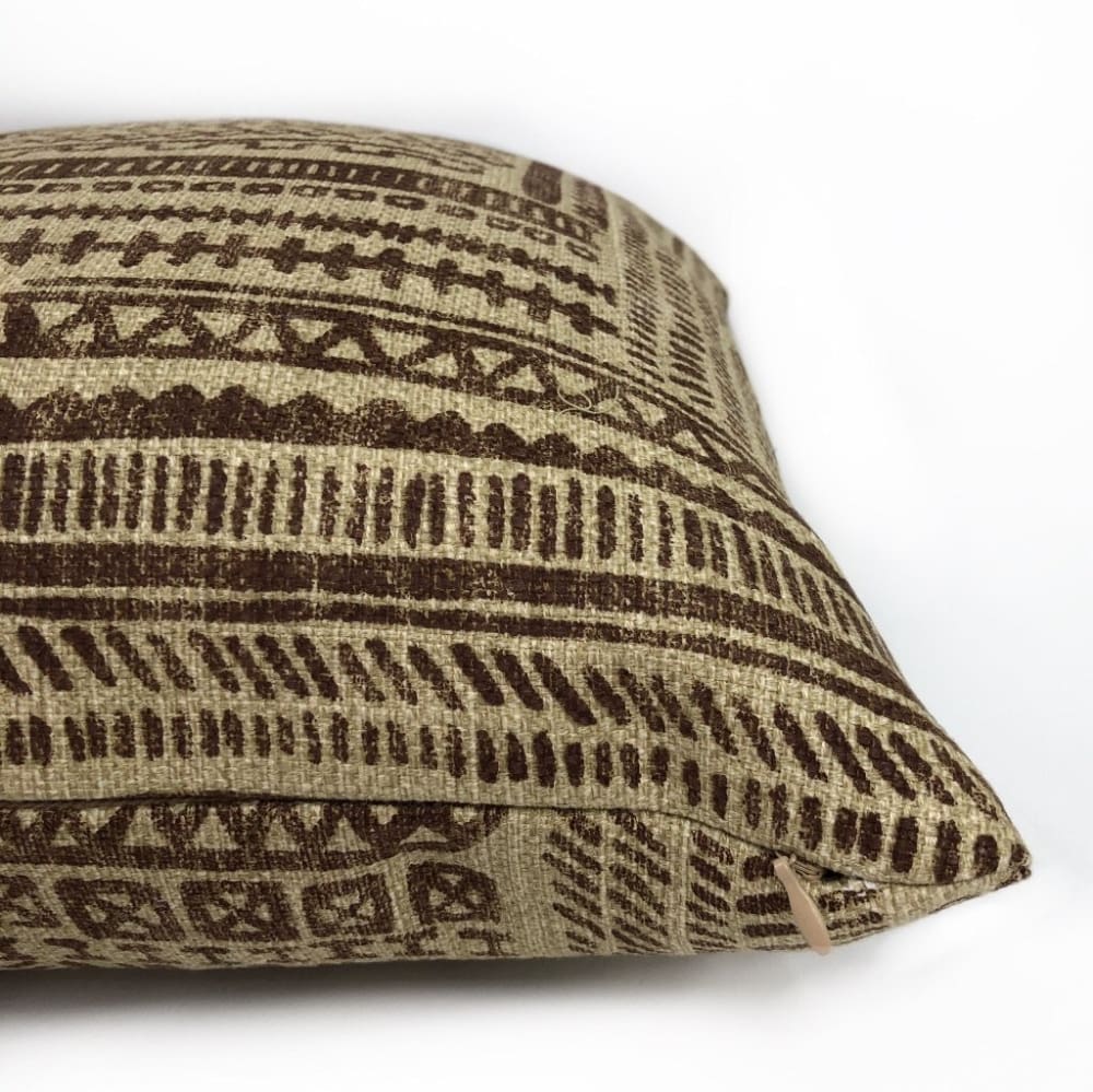 Banba is a limited edition ethnic pillow cover featuring an African mudcloth inspired design. Tribal patterns are printed on heavyweight basketweave cotton in colors of brown and tan.