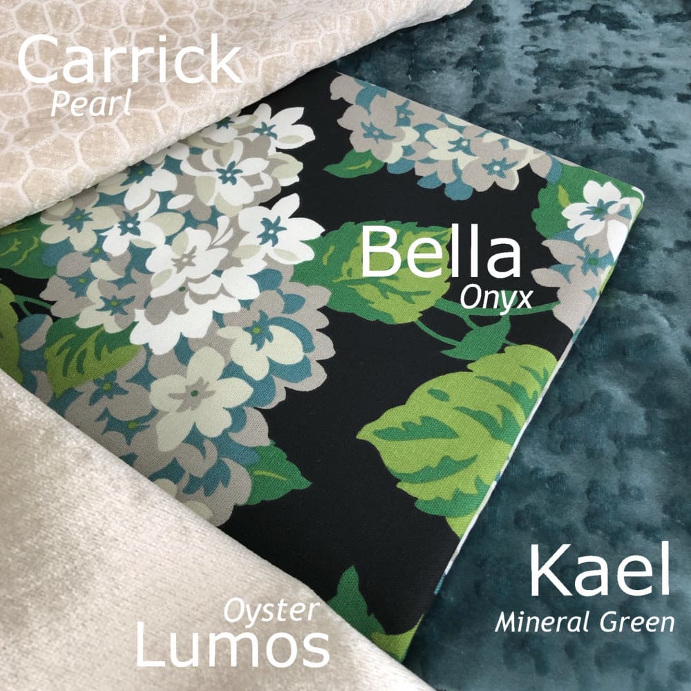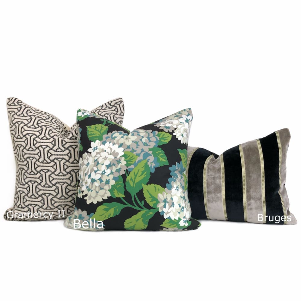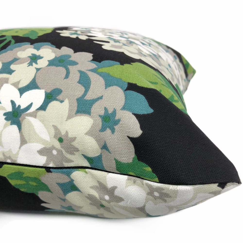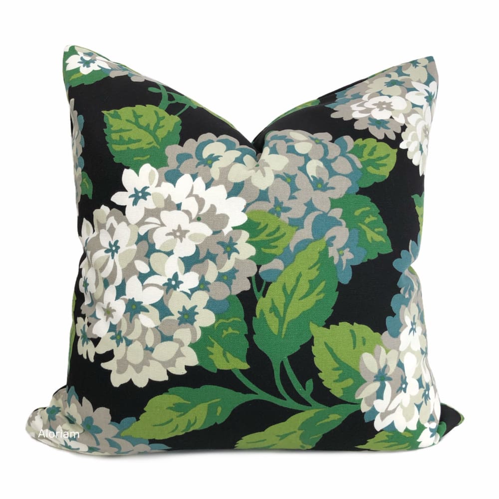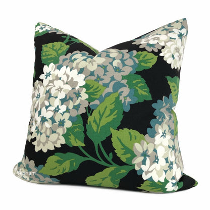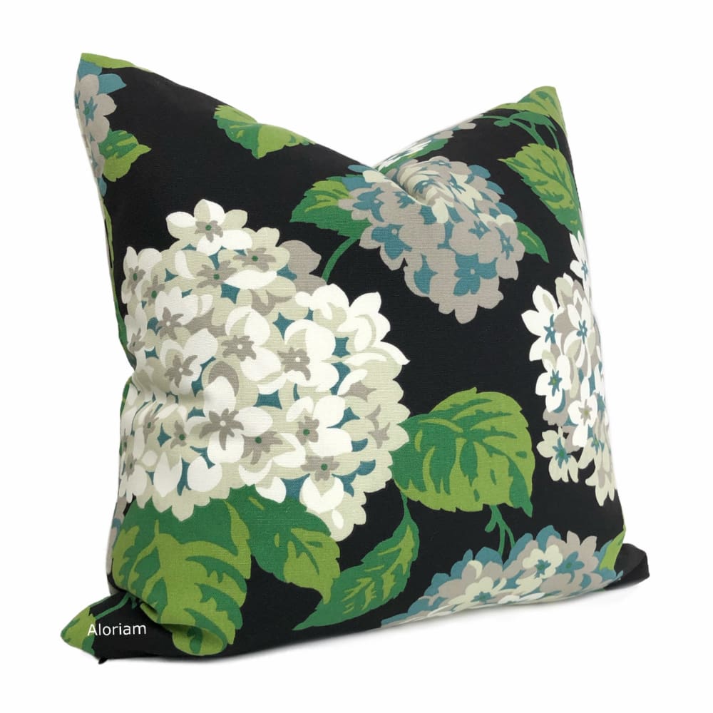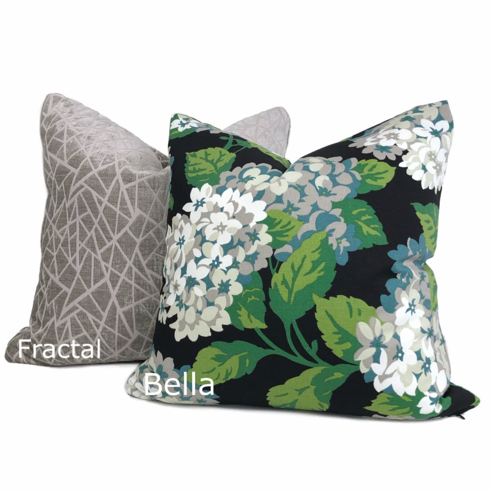 Bella is a beautiful floral pillow cover featuring hydrangea blooms printed in warm gray and cream with teal accents. Surrounded by lush green leaves, the flowers are contrasted against an onyx black background that really makes them pop! Pattern home decor cotton fabric on both sides. Photographed on 18x18 inserts.