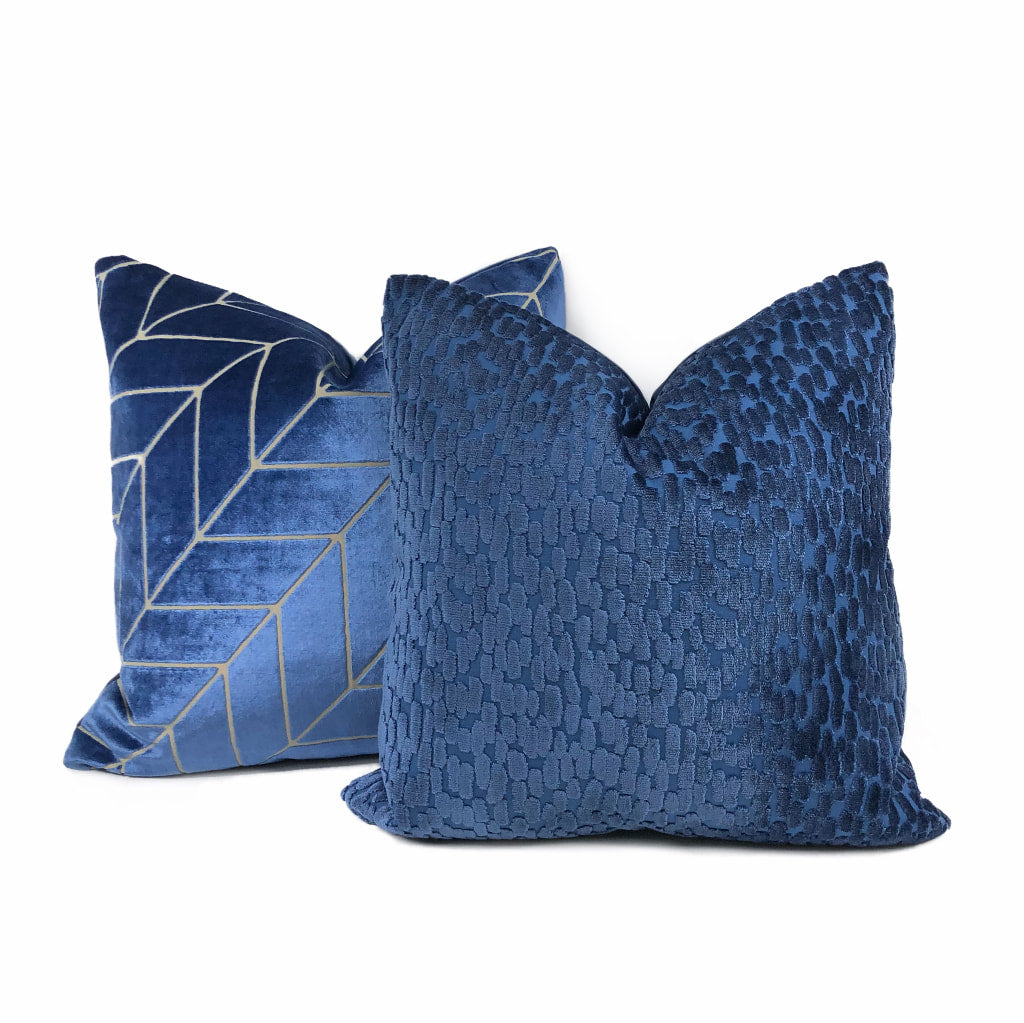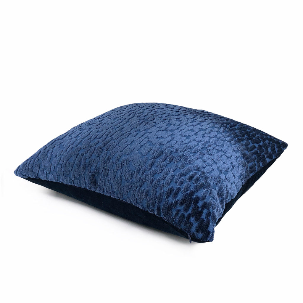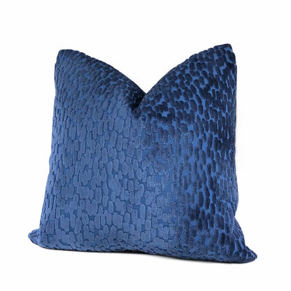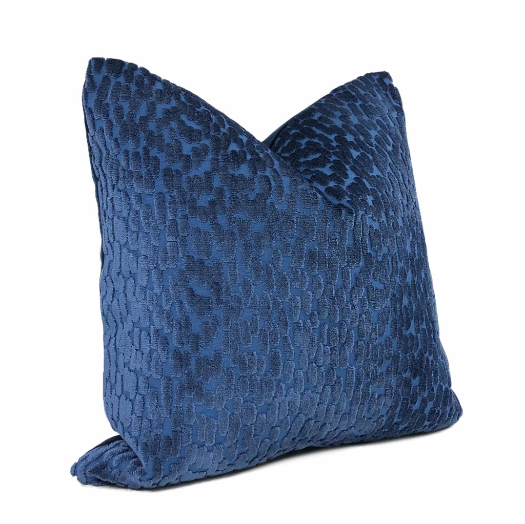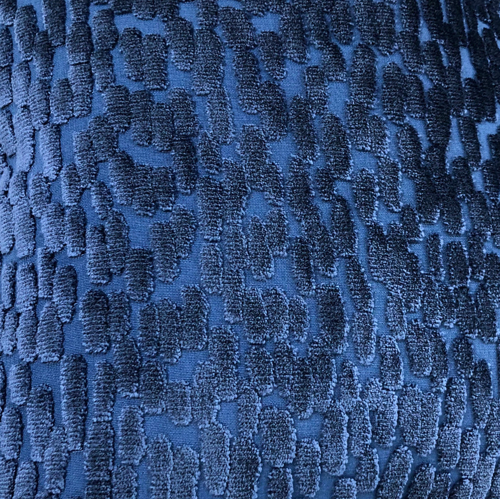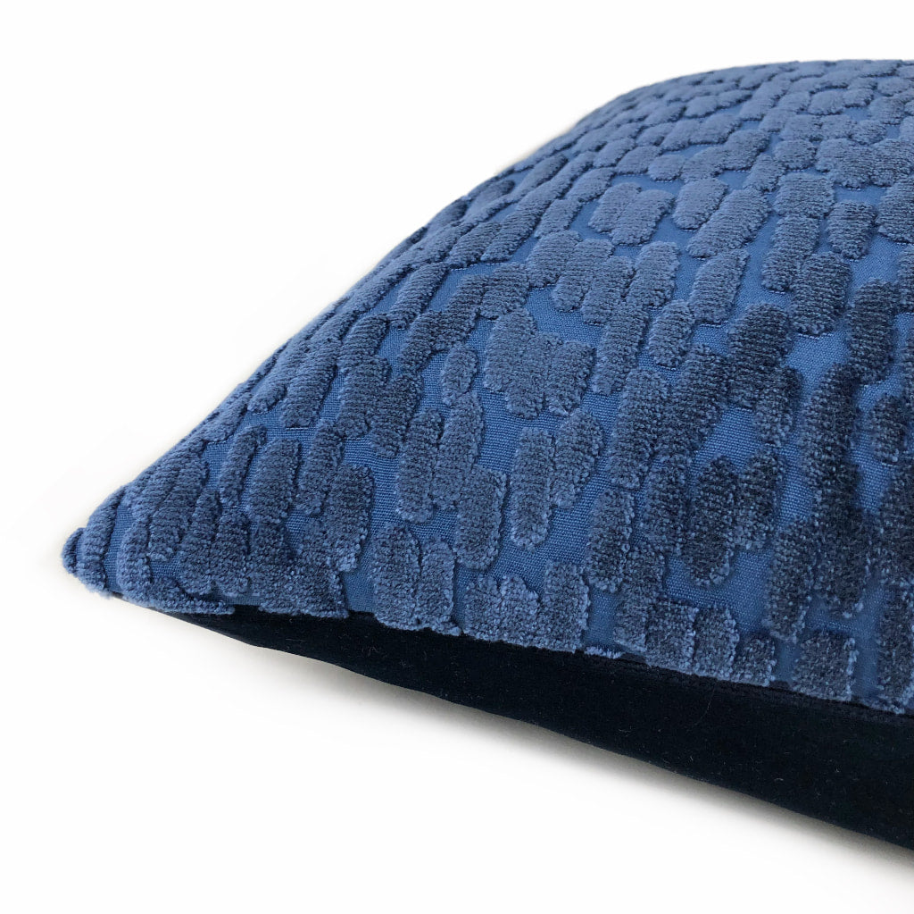 Almost sold out! This designer cut velvet pillow features a small scale modern abstract pattern woven in a tone on tone dark blue velvet. The pattern fabric is heavy upholstery weight and has the pattern woven into the fabric (not screenprinted) for extra durability. Photographed on 19x19 cover (filled with 20x20 insert).
