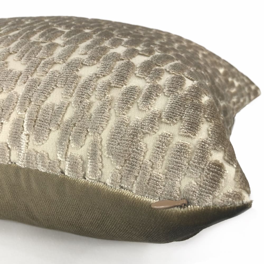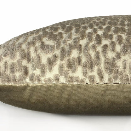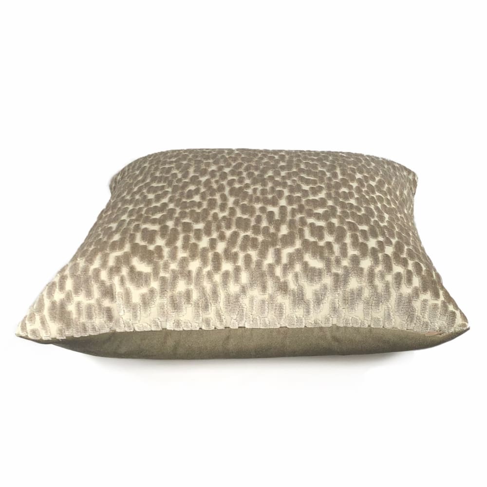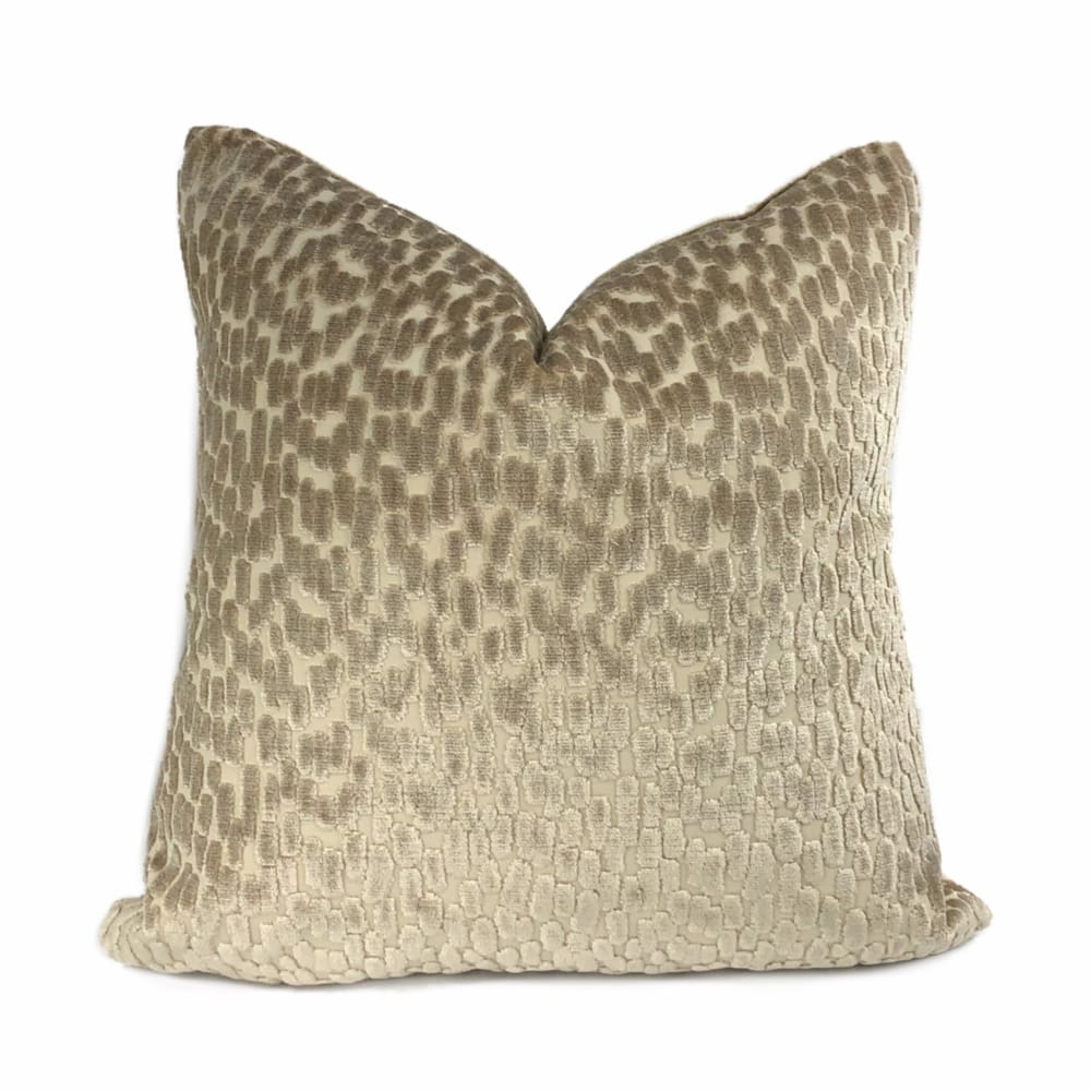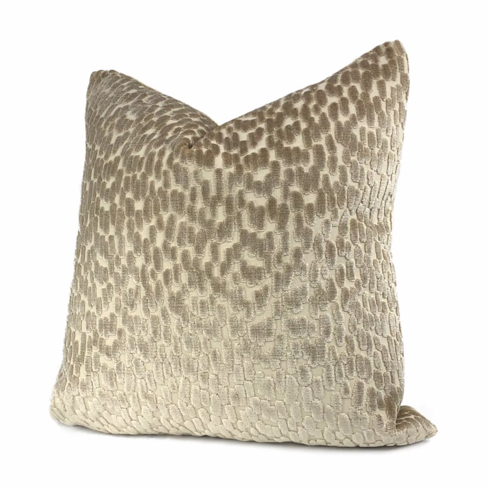 This designer cut velvet pillow features an abstract dot pattern woven in sand colored velvet. The pattern fabric is heavy upholstery weight and has the pattern woven into the fabric (not screenprinted) for extra durability.