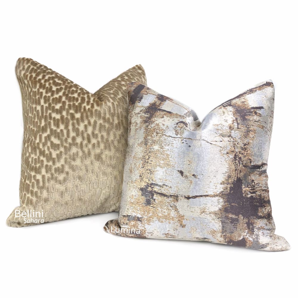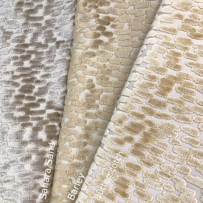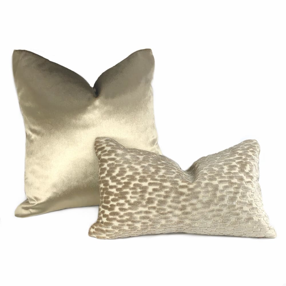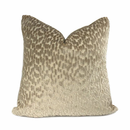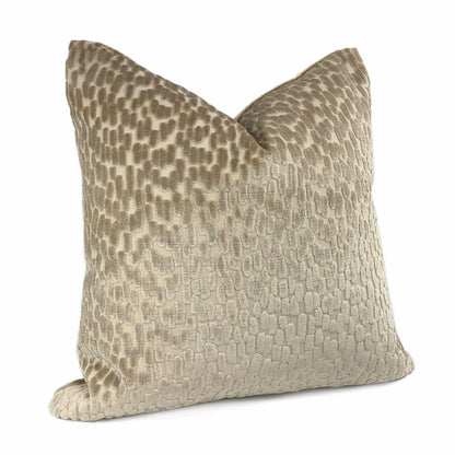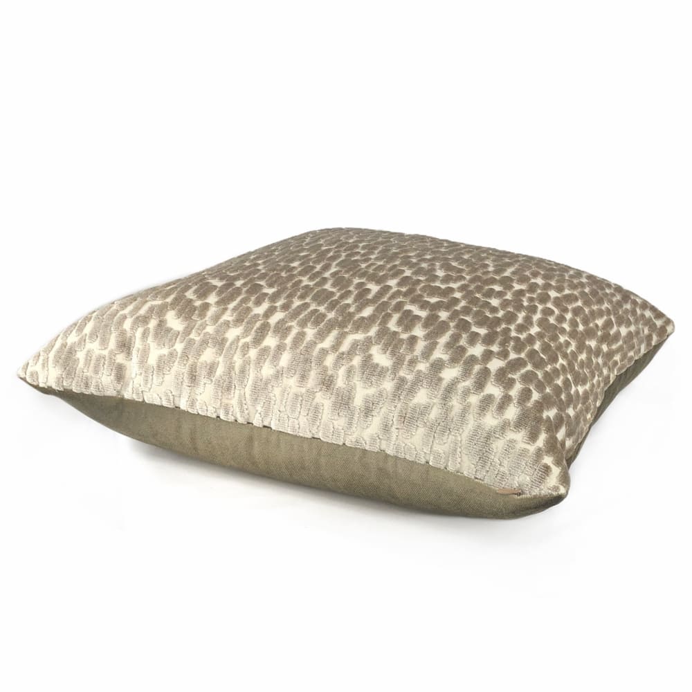 This designer cut velvet pillow features an abstract dot pattern woven in sand colored velvet. The pattern fabric is heavy upholstery weight and has the pattern woven into the fabric (not screenprinted) for extra durability.