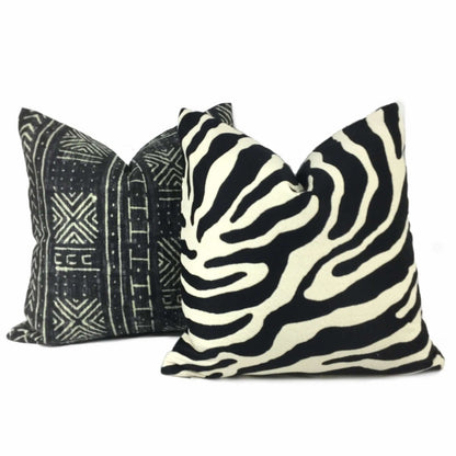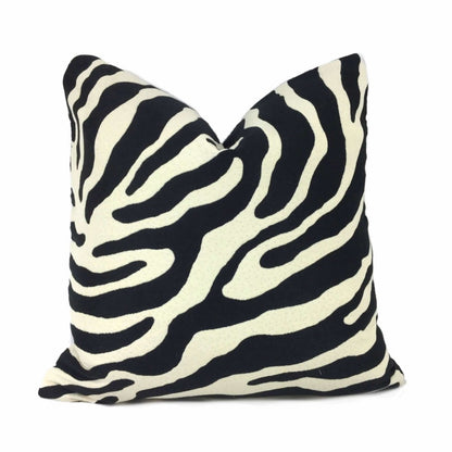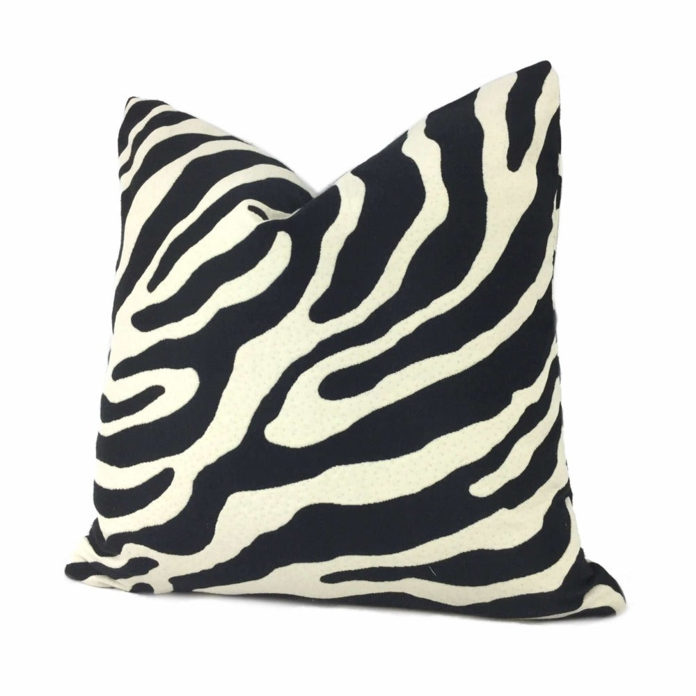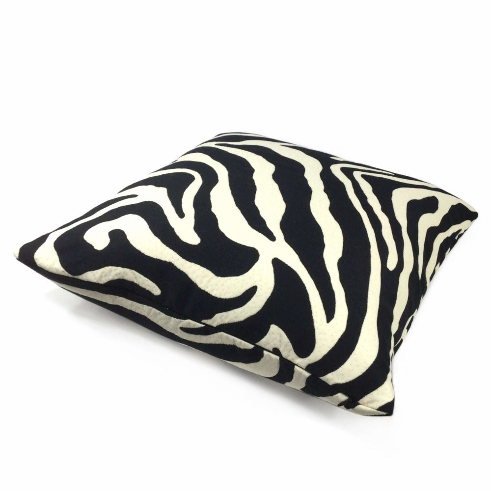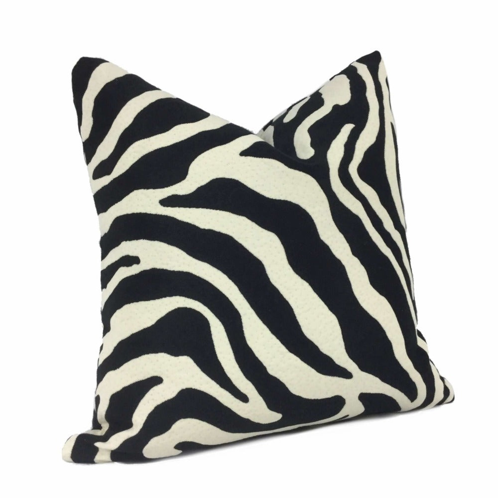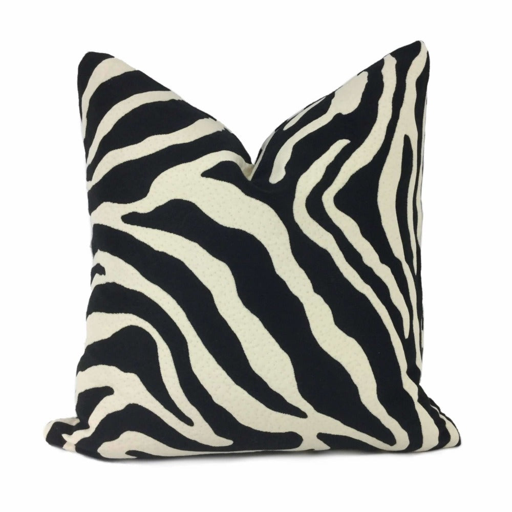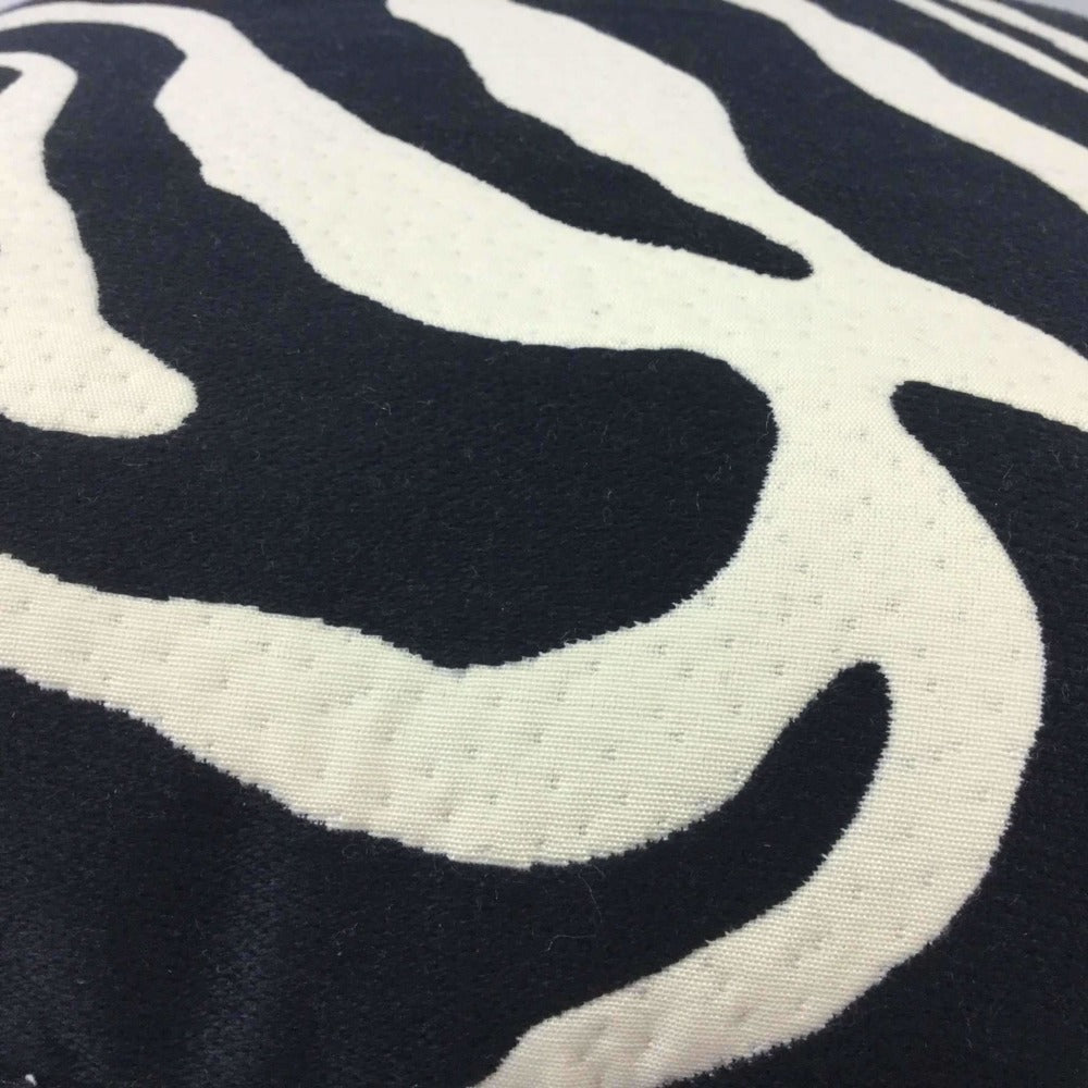 Wide zebra stripes woven in black and cream adorn this upholstery weight pillow cover. The cream areas of this pattern have a plush quilted texture, contrasting with the black woven areas. This zebra pillow cover blends well with many different patterns.