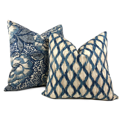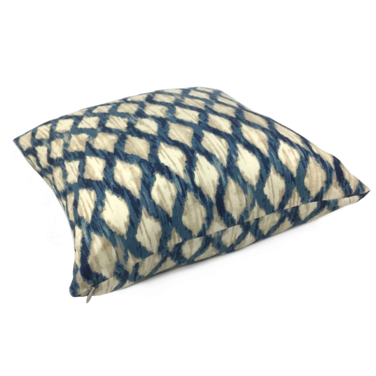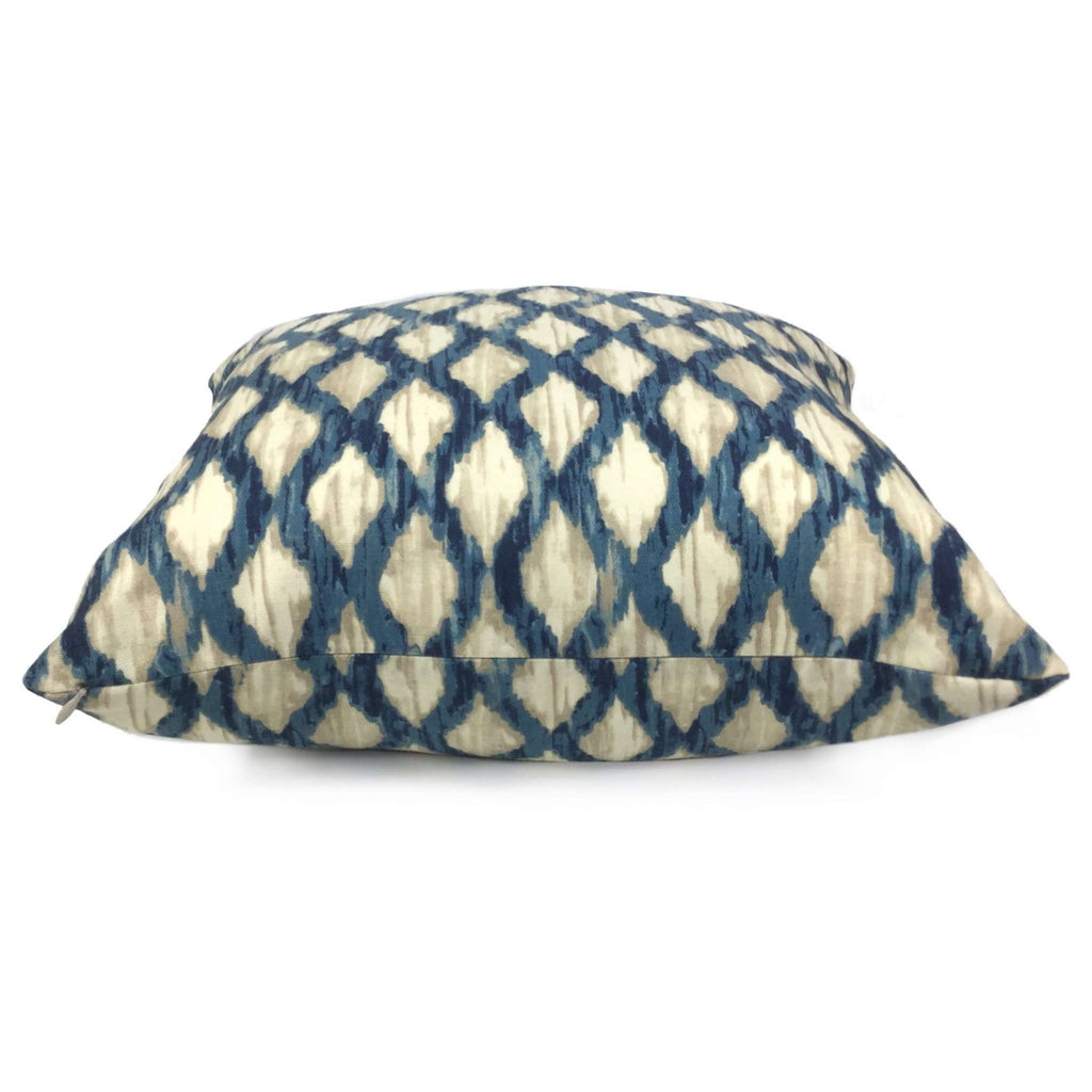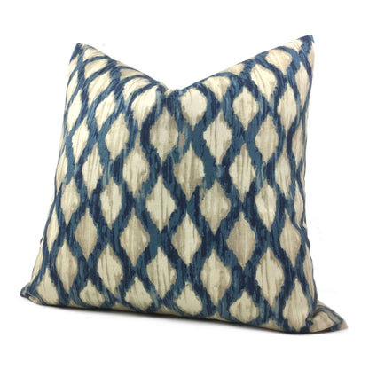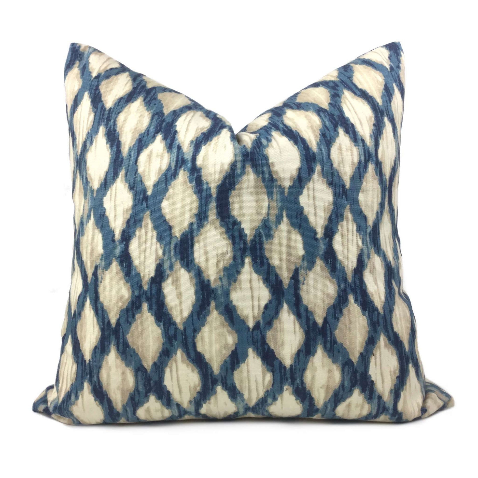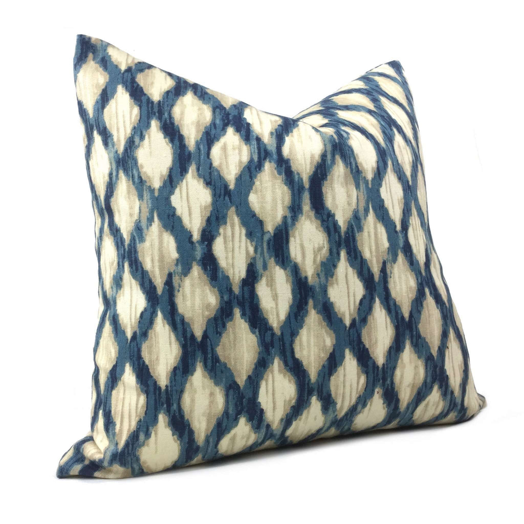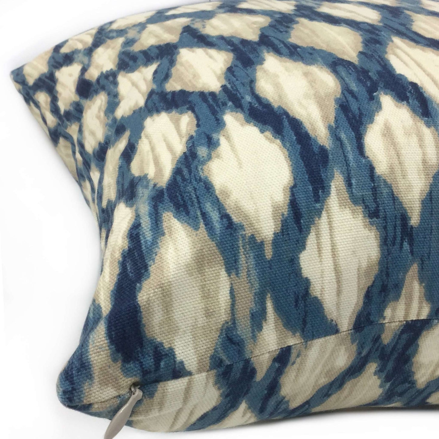 This blue and beige pillow cover features an ikat-style geometric trellis design. The pattern fabric is a screenprinted home decor cotton and is used on both sides of each pillow cover. Photographed on 17x17 cover (filled with 18x18 insert).