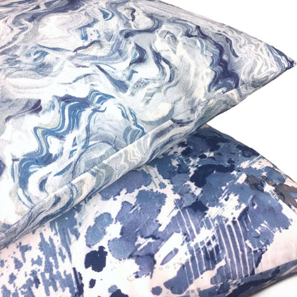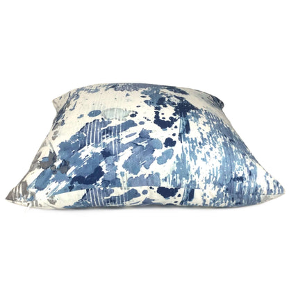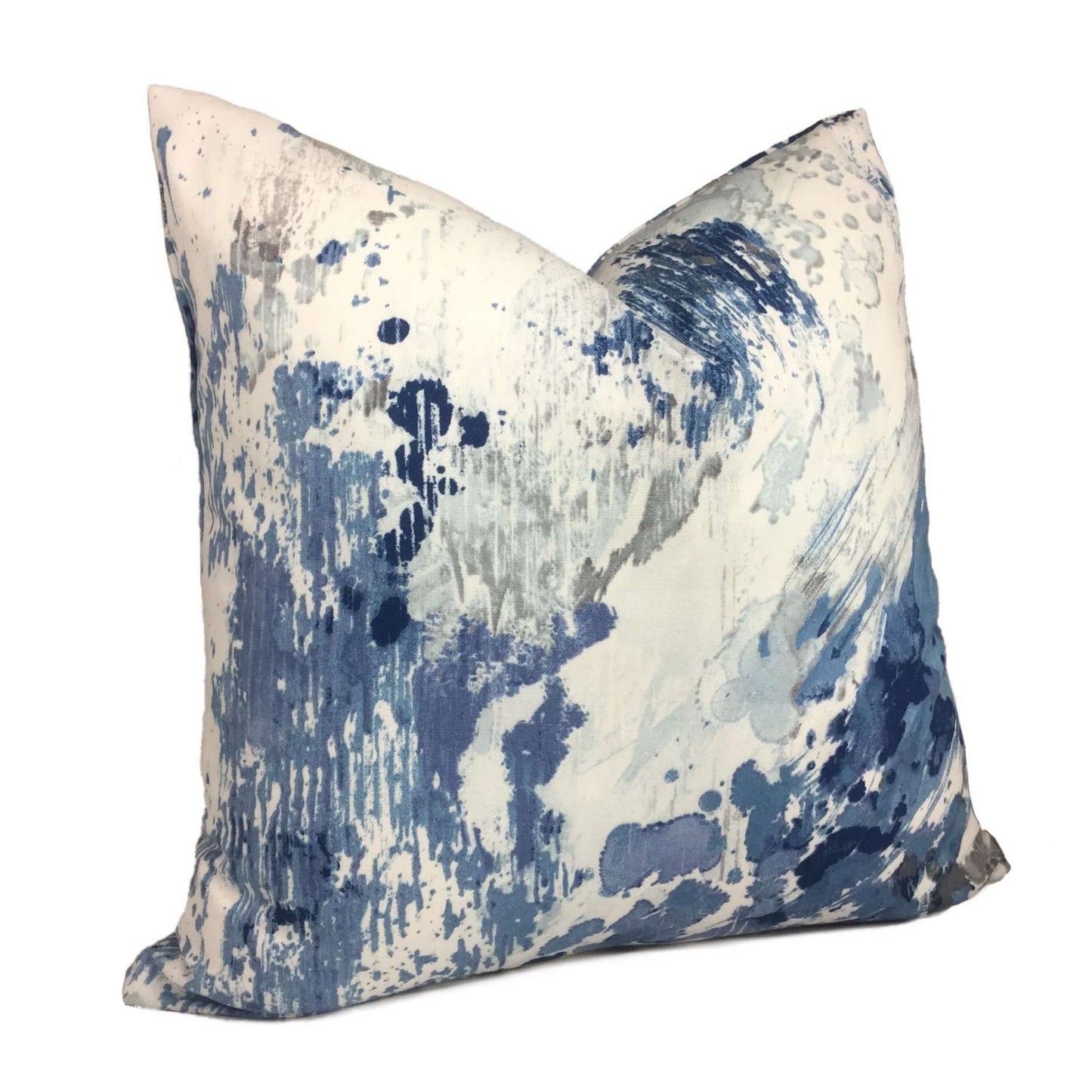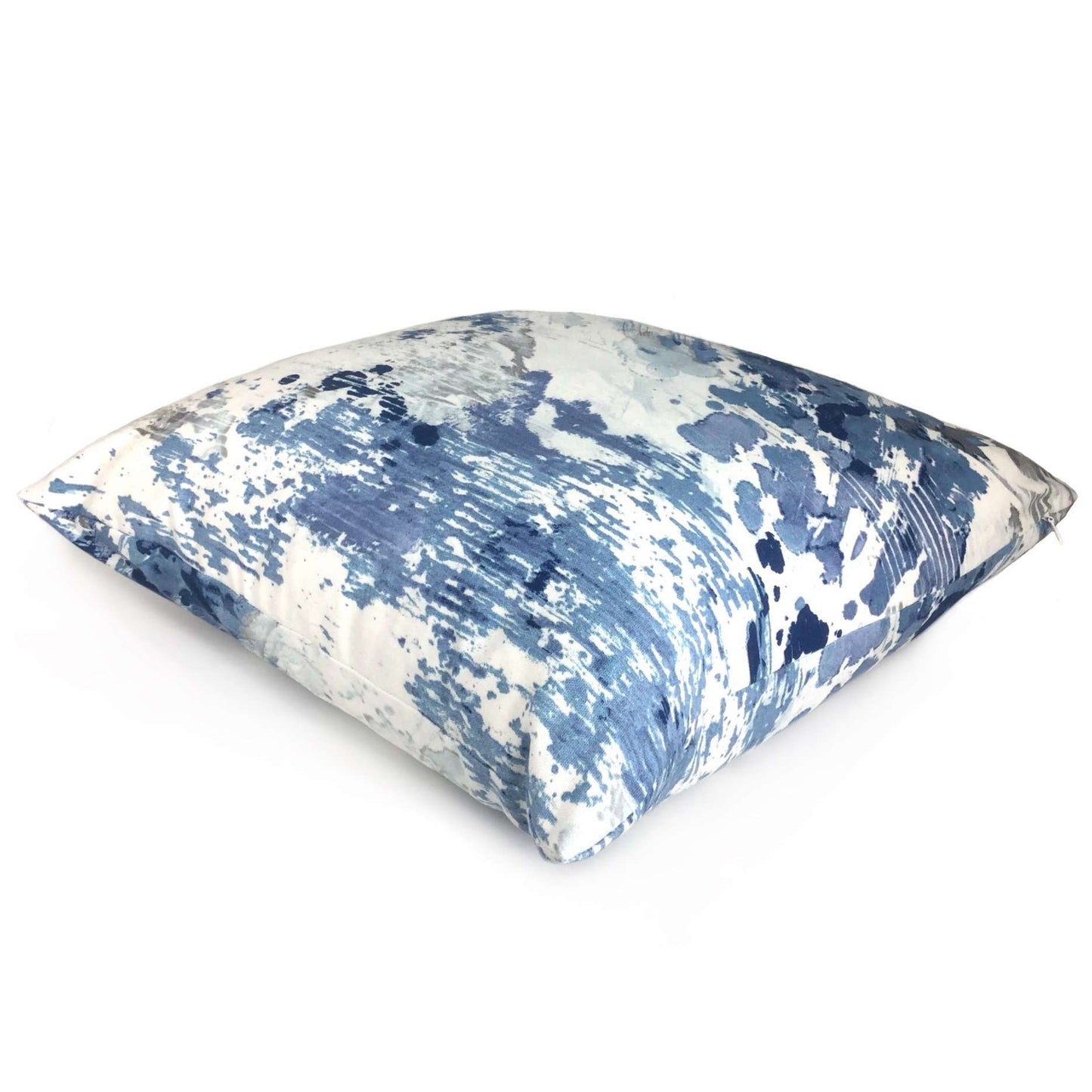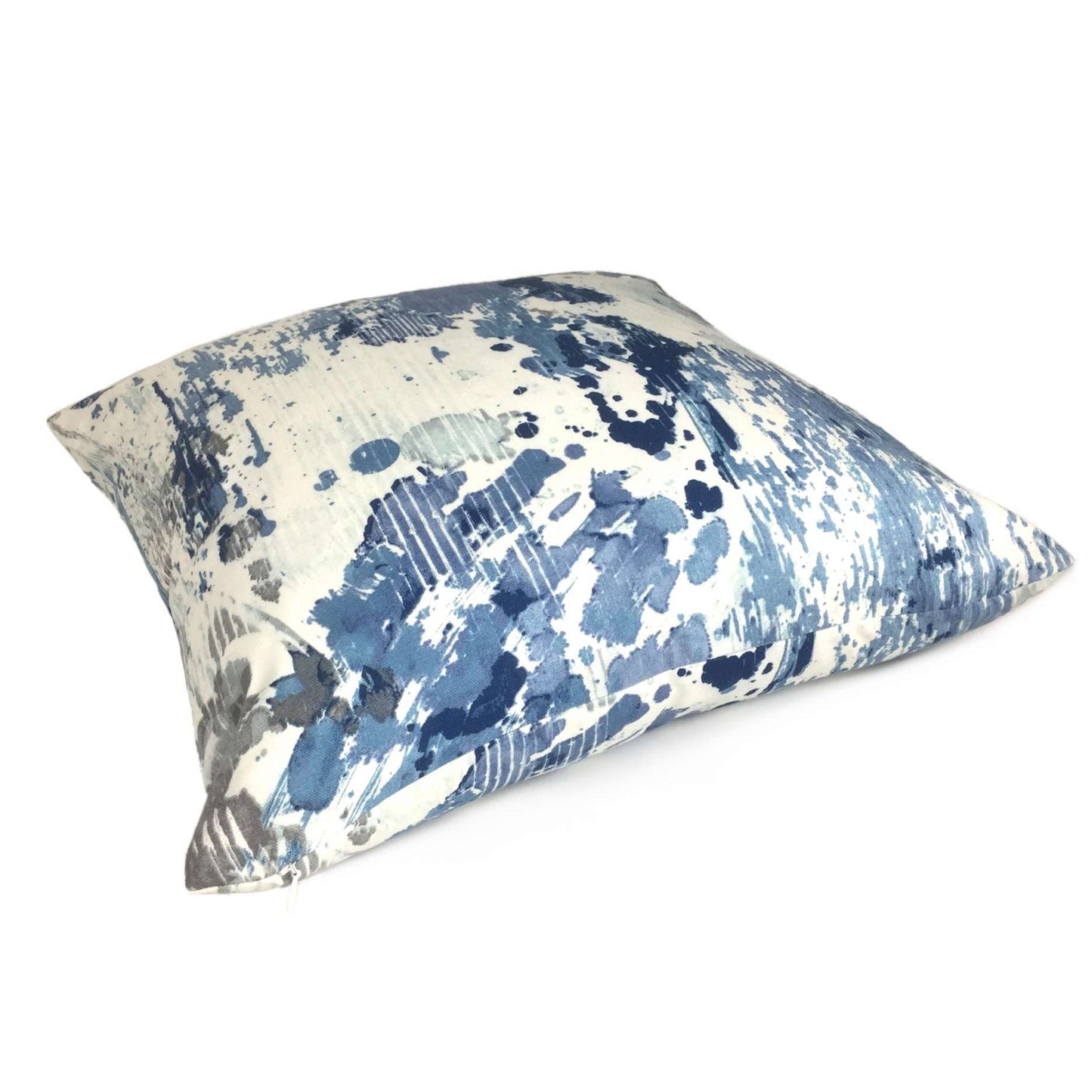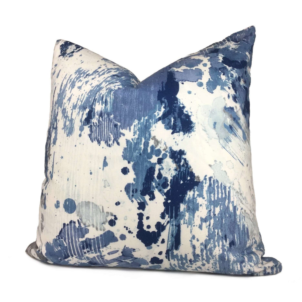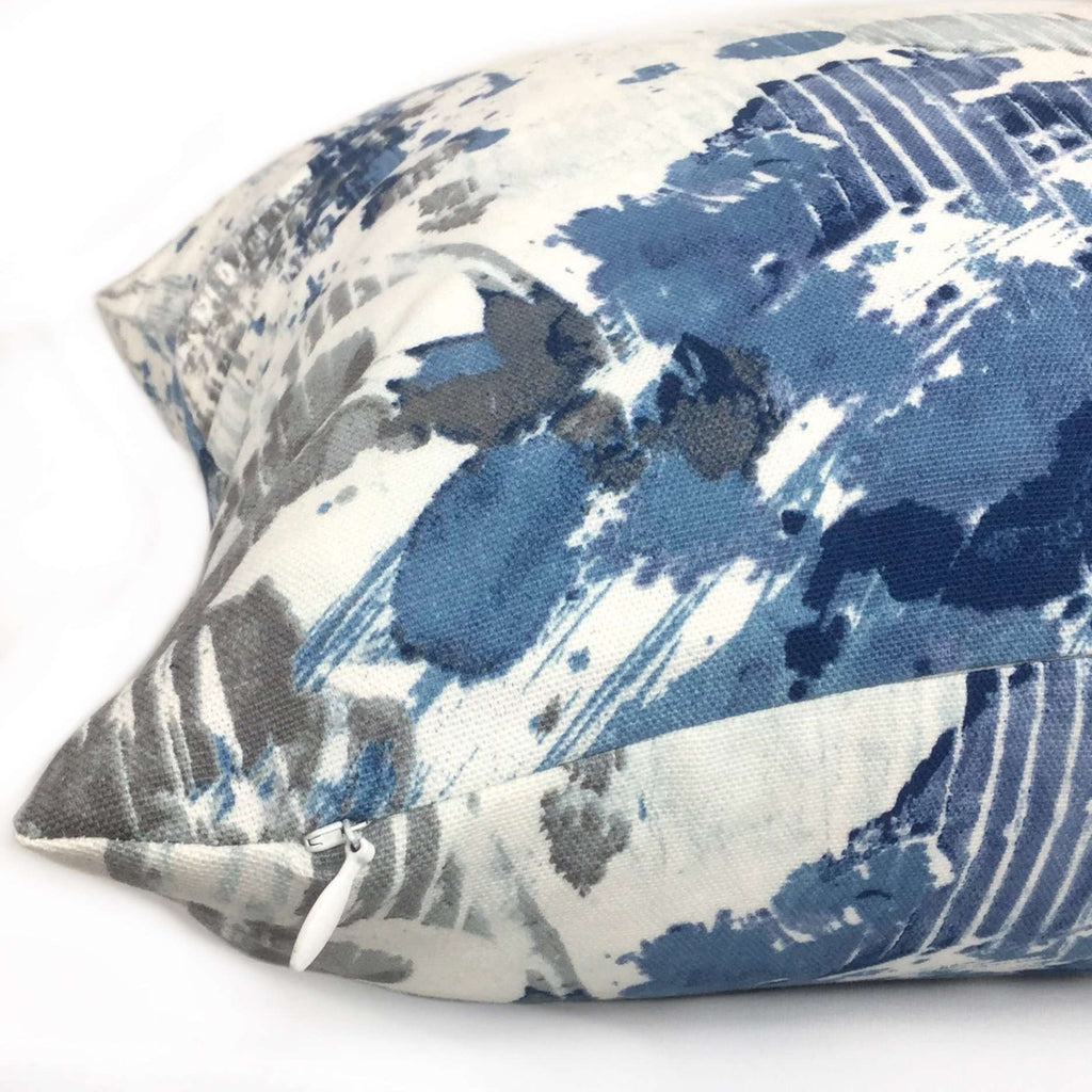 This modern art pillow cover features an abstract design printed in blue and gray on a white background.