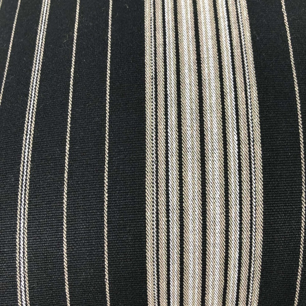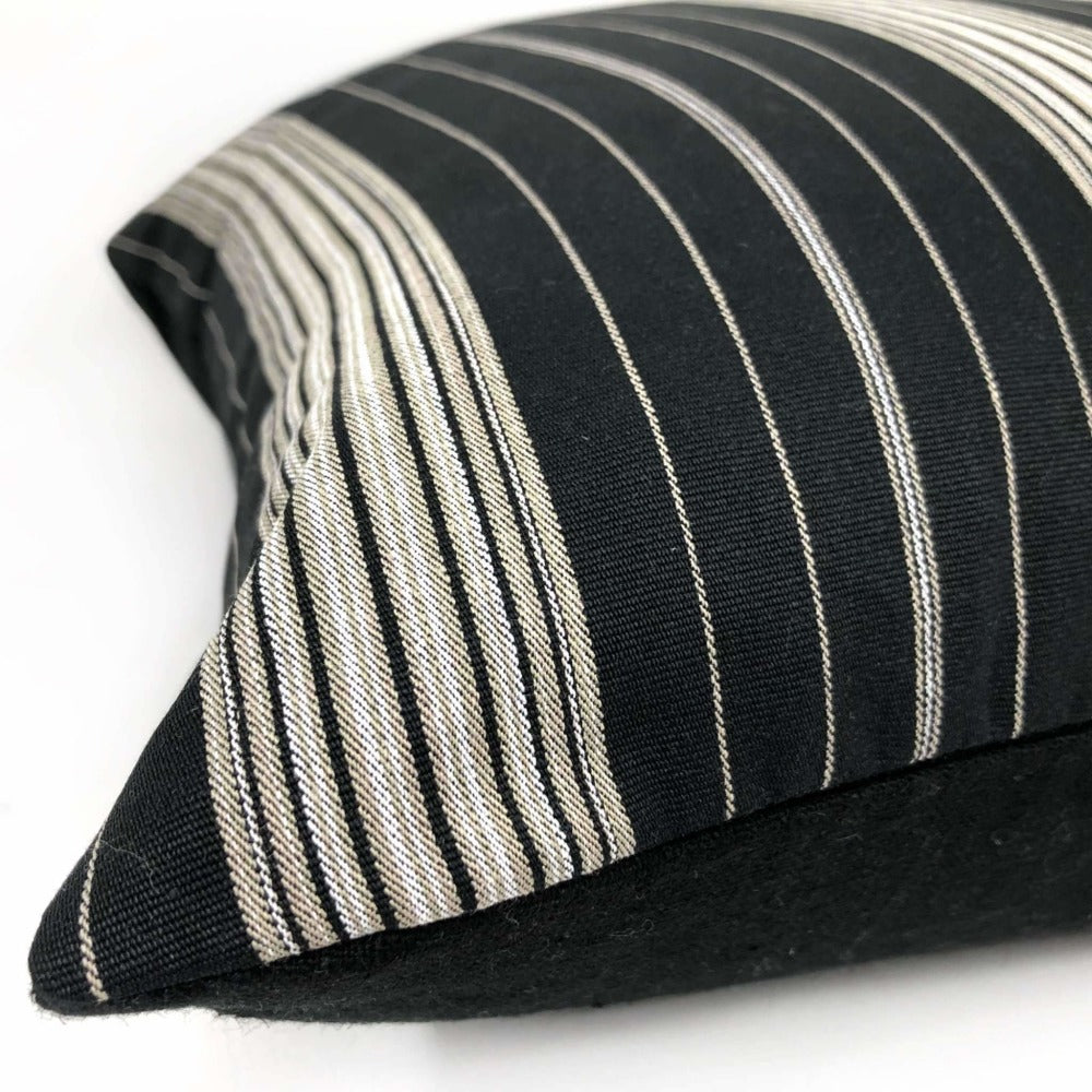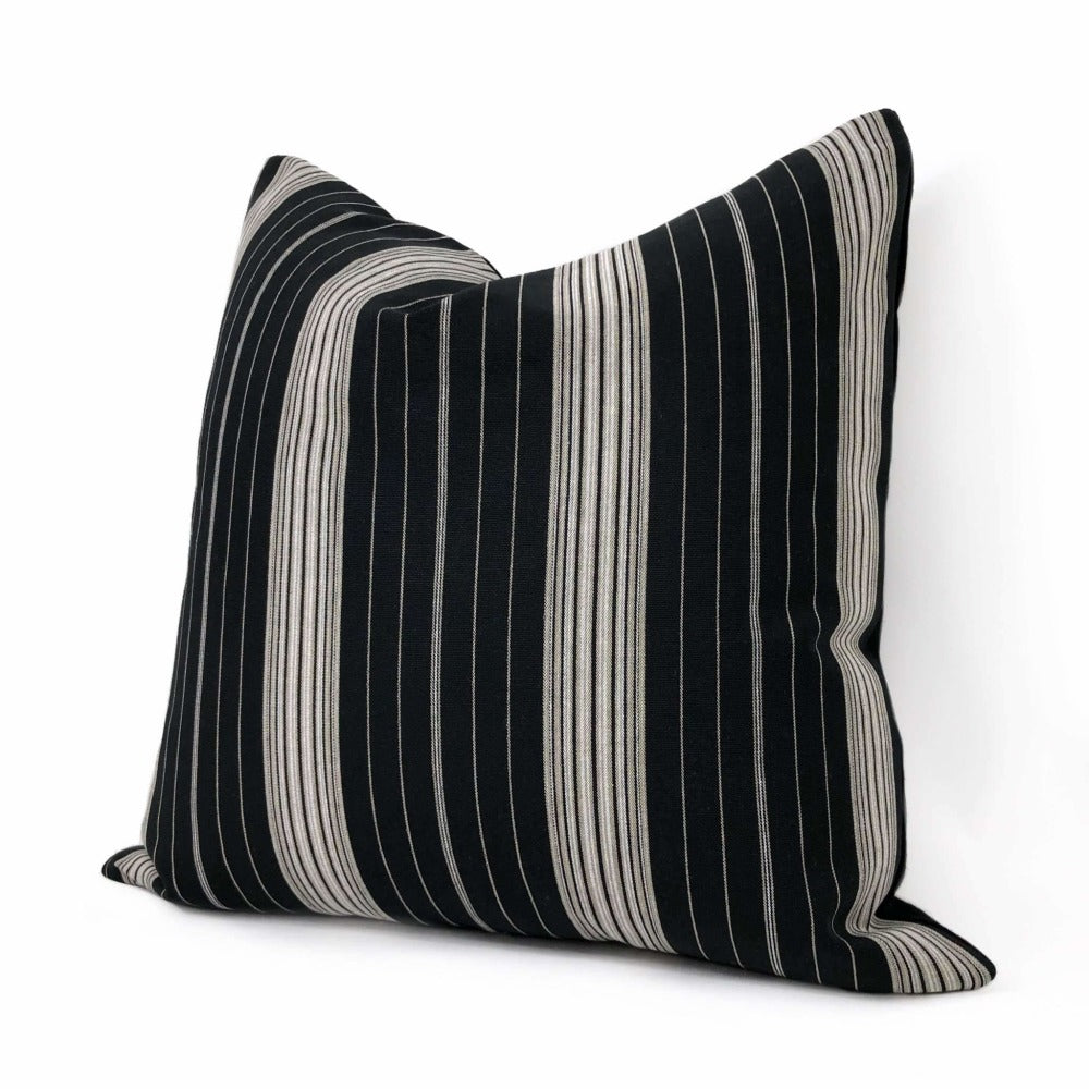 Almost sold out! This pinstripe pillow cover features vertical stripes woven in light gray and taupe against a black background. Equally at home in contemporary or traditional interiors, this pillow cover reverses to a solid black woven backside. 100% cotton fabric. Photographed on 17x17 cover (filled with 18x18 insert).