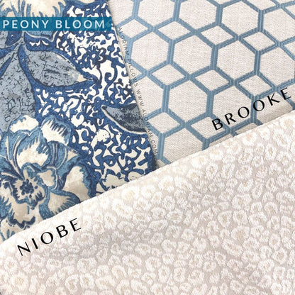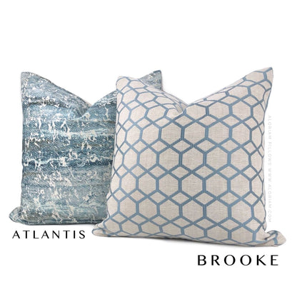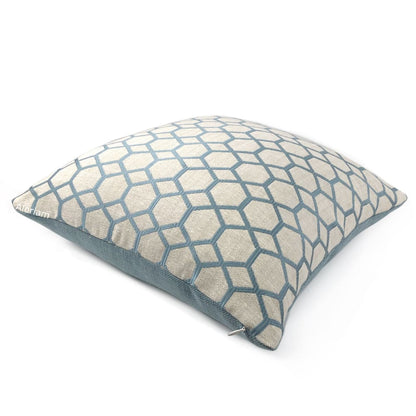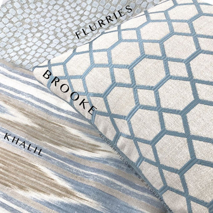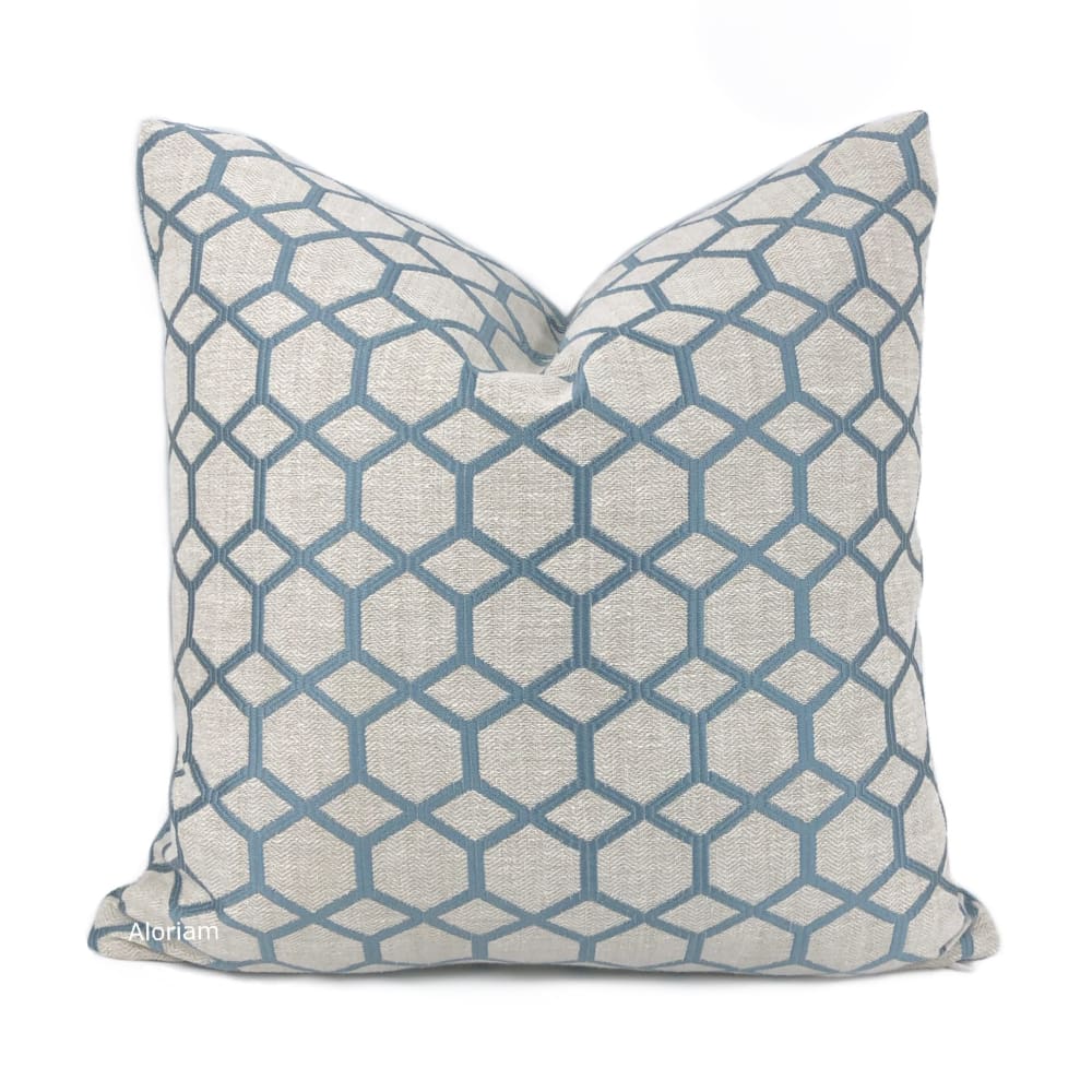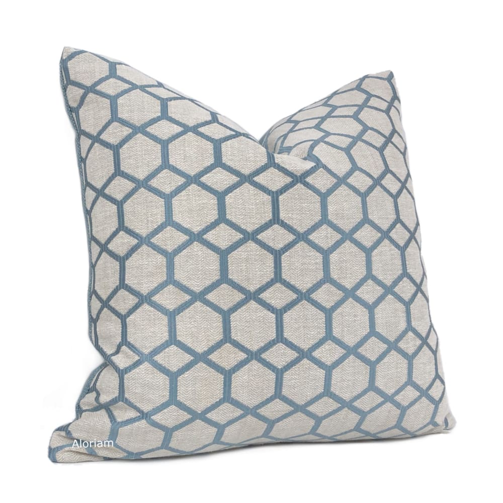The Brooke pillow cover features a classic interlocked hexagon geometric pattern. The lattice design is woven in blue on a gray-tinted off-white background. Pattern fabric front with our Curzon mineral blue solid fabric on the backside. Brooke is the perfect accompaniment to many other patterns! Check out photos 2, 3 and 5 for some ideas. Photographed on 17x17 cover (filled with 18x18 insert).