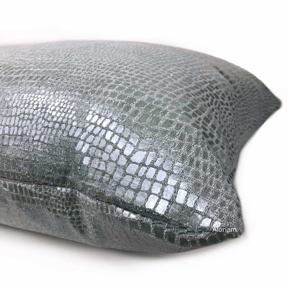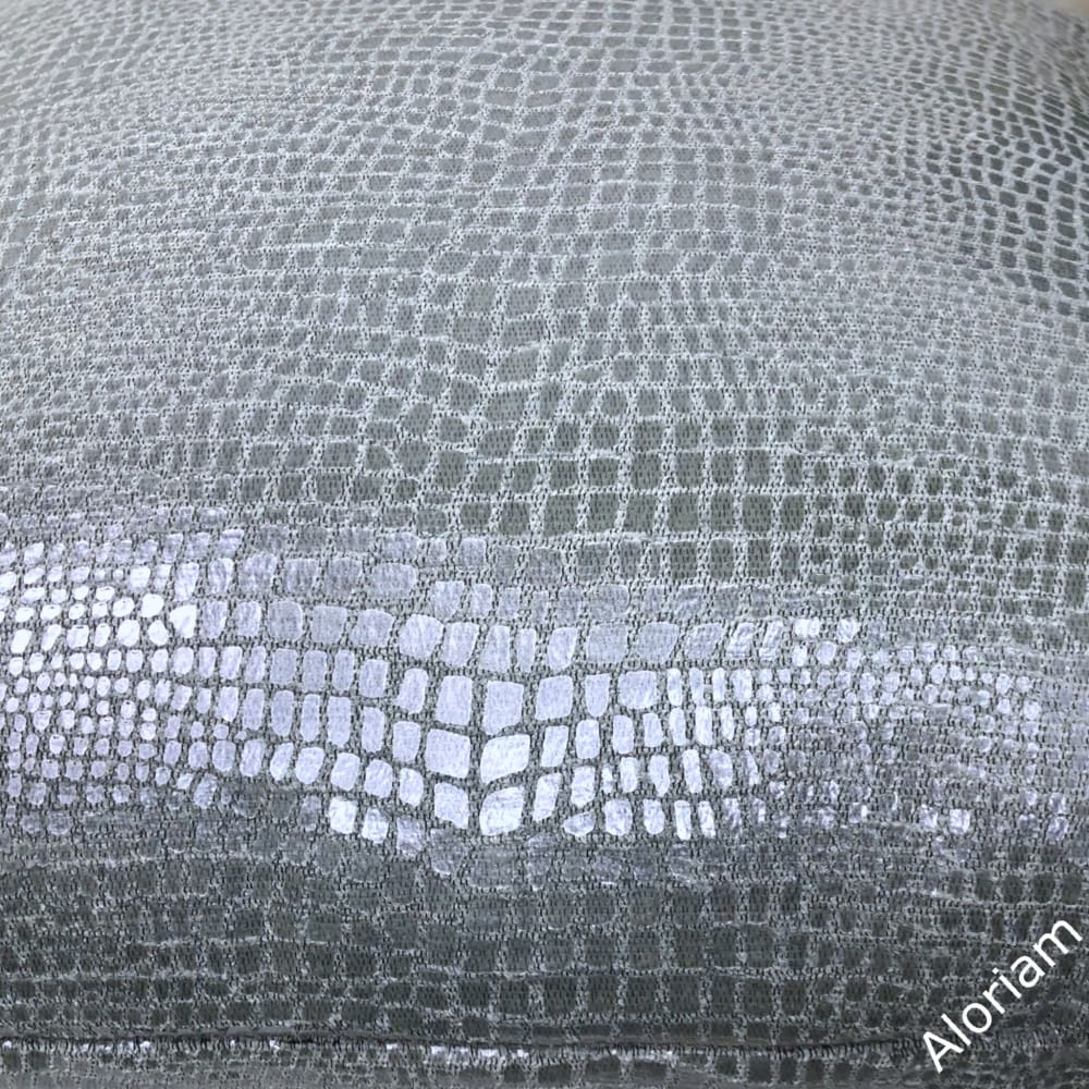 Almost sold out! The Caiman pillow cover dazzles with a silvery metallic crocodile scale pattern over a pale grayish blue background.