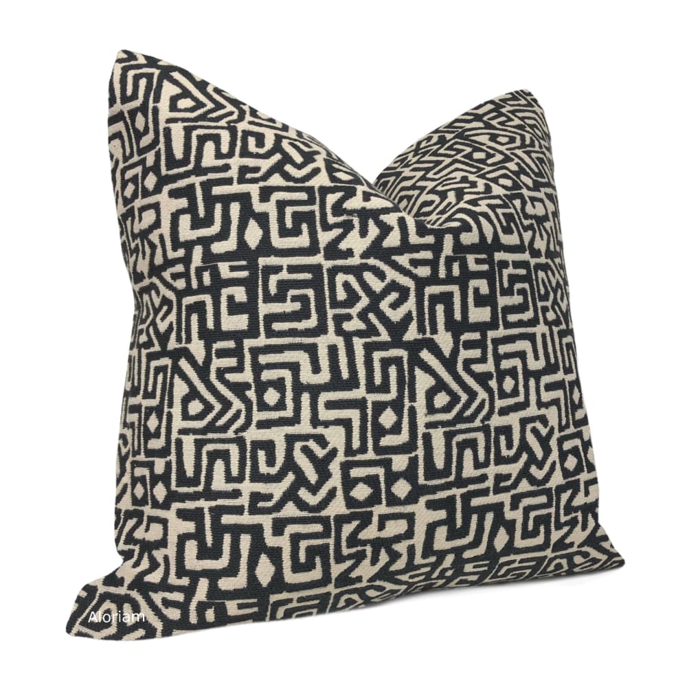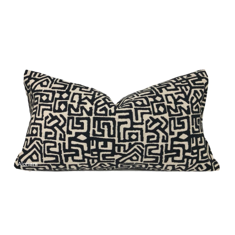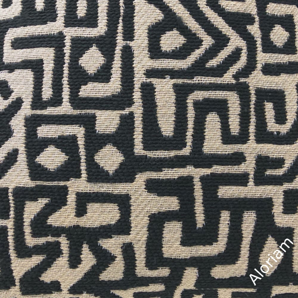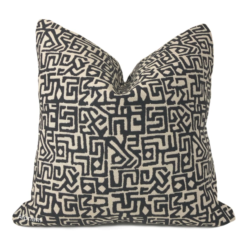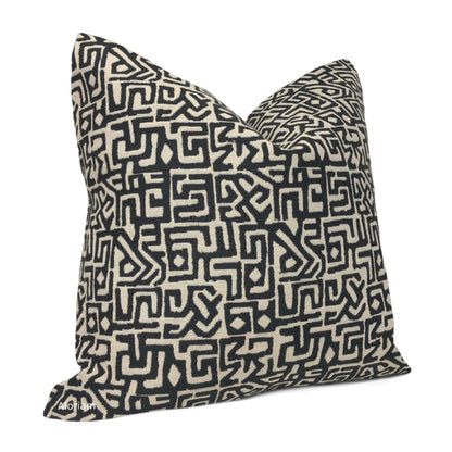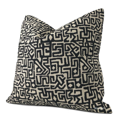 The Cairo pillow cover features an abstract design reminiscent of ethnic glyphs woven in black and beige.