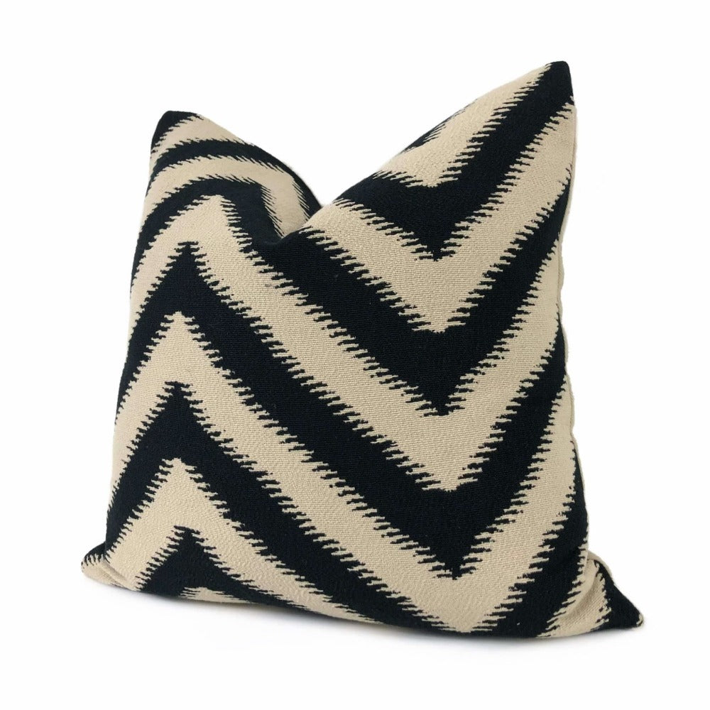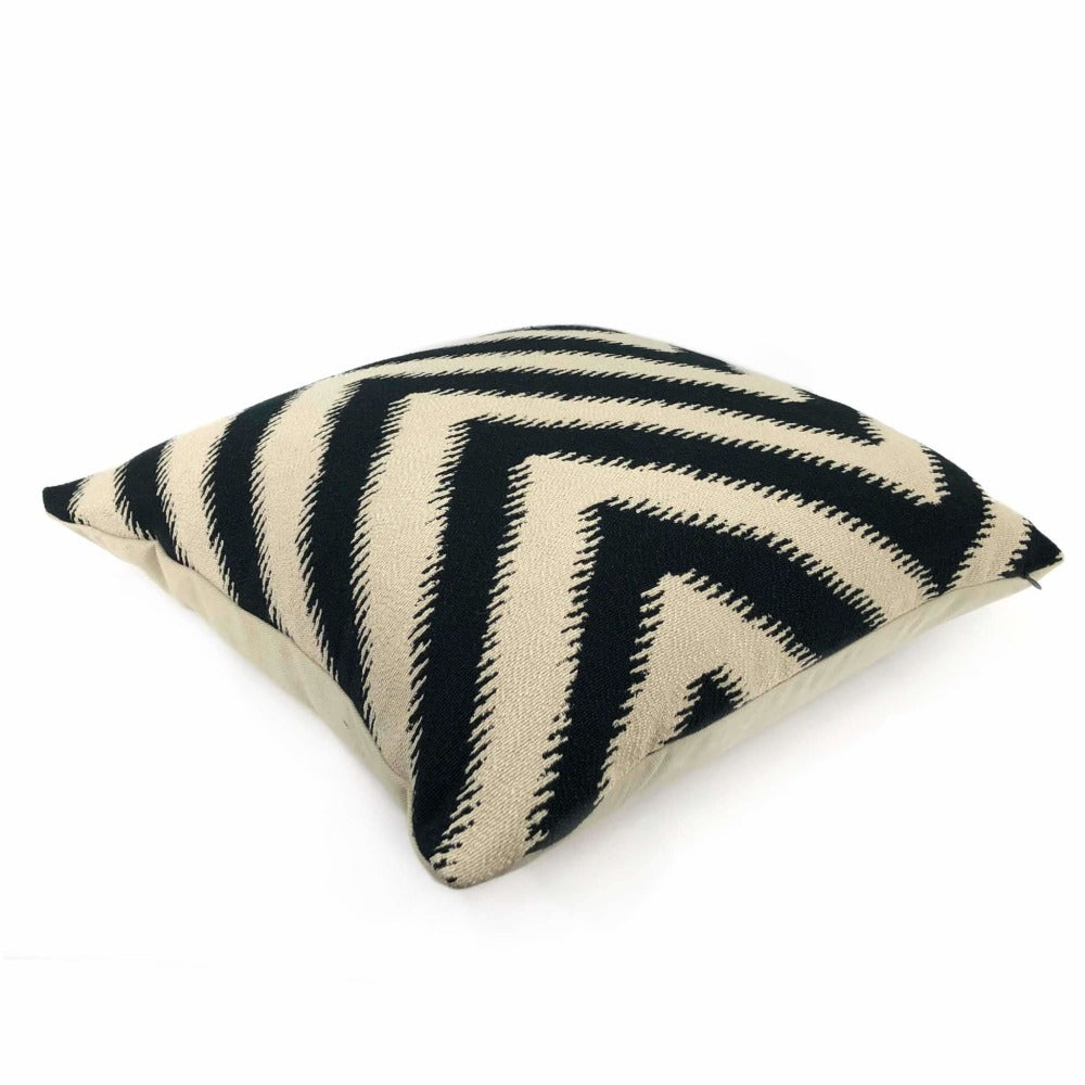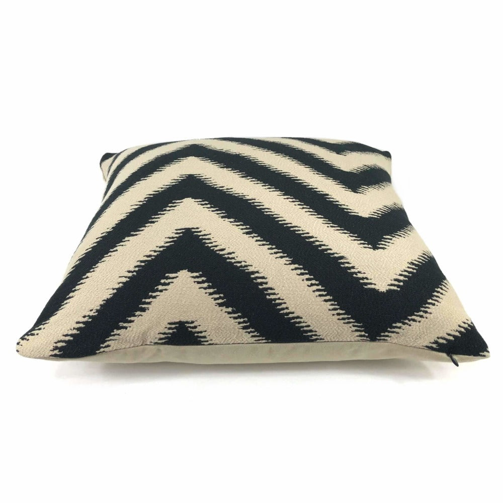 Last chance! Bold serrated chevron stripes woven in black on a beige background make this pillow cover a strong choice to accompany many other patterns. Your choice of the pattern fabric on front side with a coordinating solid beige backside or the pattern fabric used on both sides.