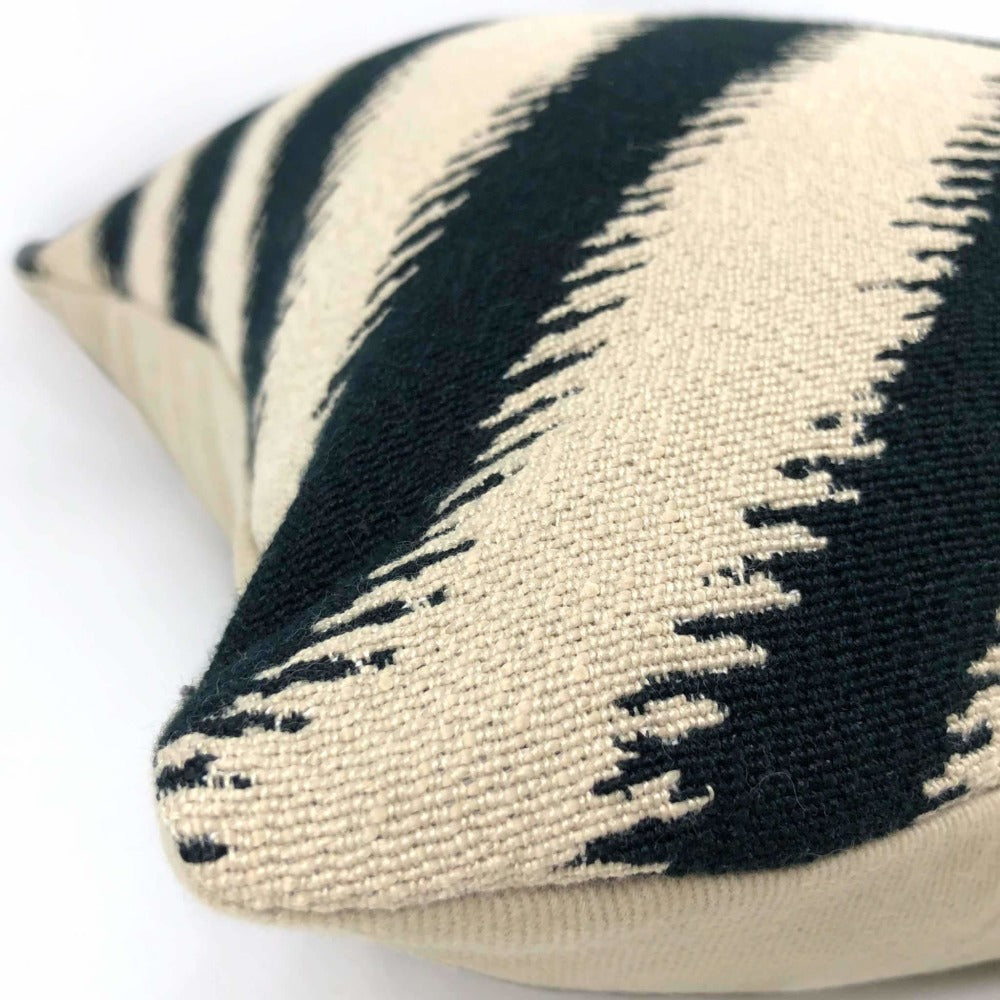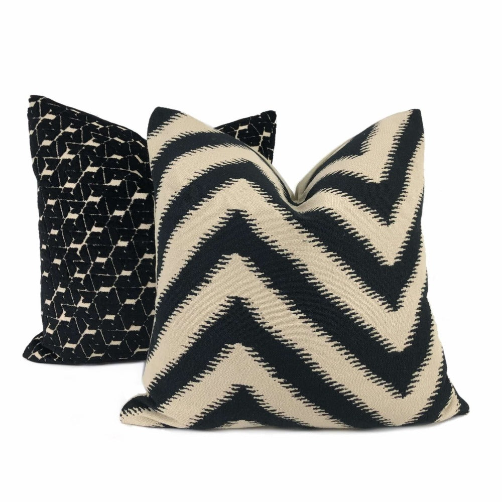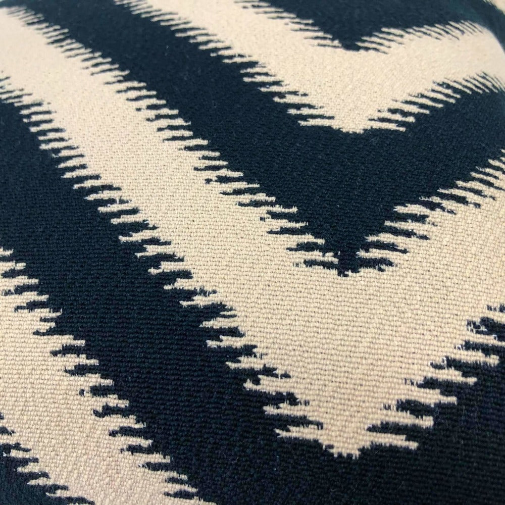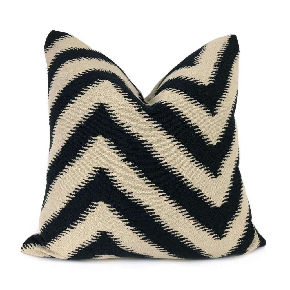 Last chance! Bold serrated chevron stripes woven in black on a beige background make this pillow cover a strong choice to accompany many other patterns. Your choice of the pattern fabric on front side with a coordinating solid beige backside or the pattern fabric used on both sides.