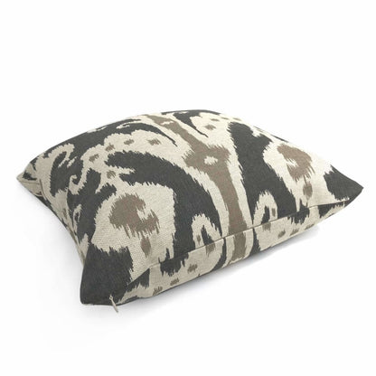 This pillow cover features a bold ethnic ikat design printed in dark charcoal brown-grey and taupe brown on a neutral beige background. Designer pattern fabric is used on both sides.