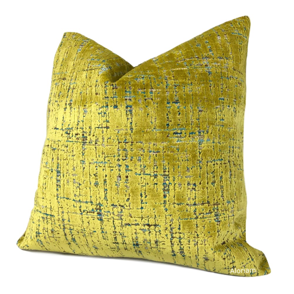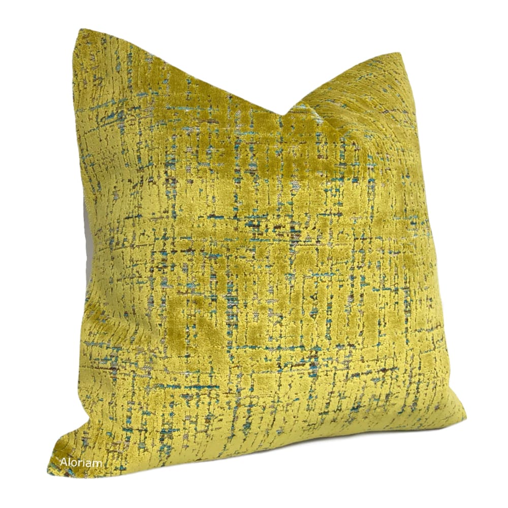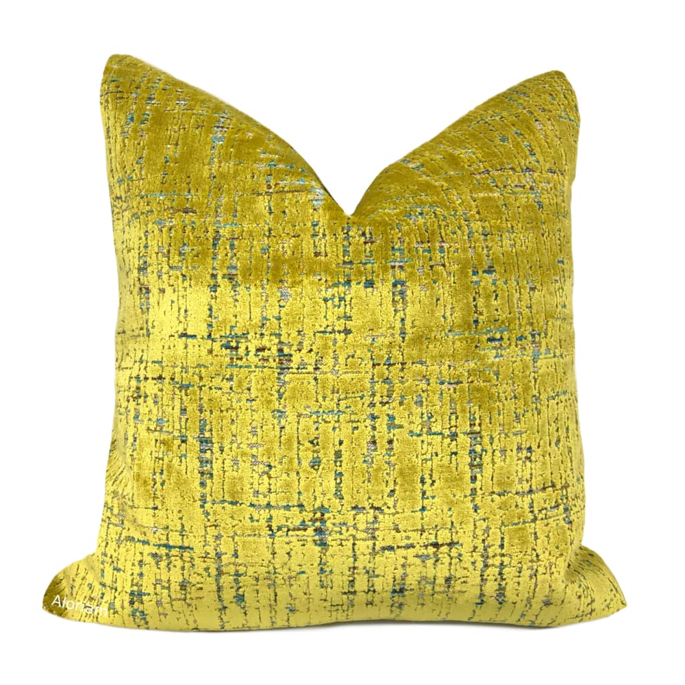 The Cassidy pillow cover weaves a brilliant yellow velvet into a tweedy base cloth with flecks of green, teal and brown. Awesomely textured with a luxe modern feel, the Cassidy pillow cover is a colorful addition to any home interior.