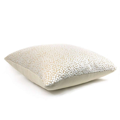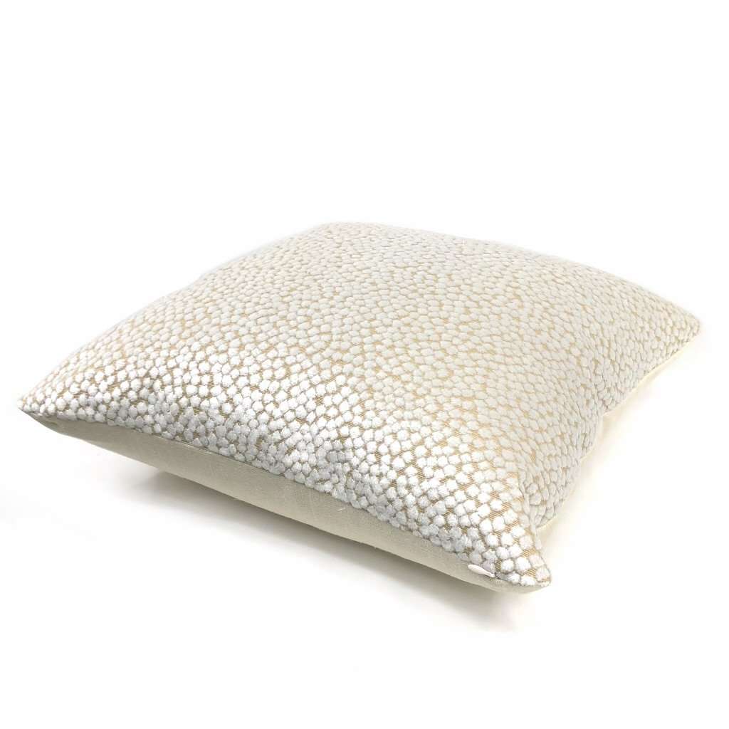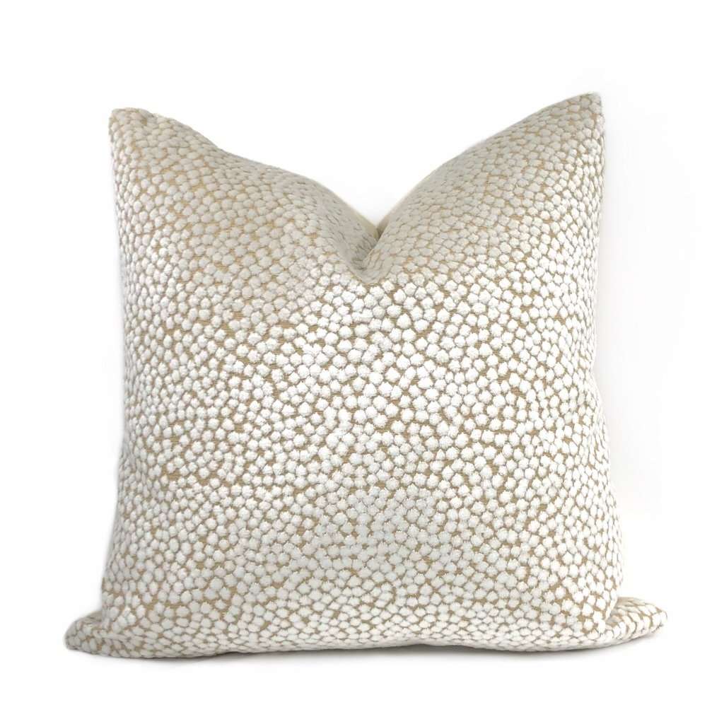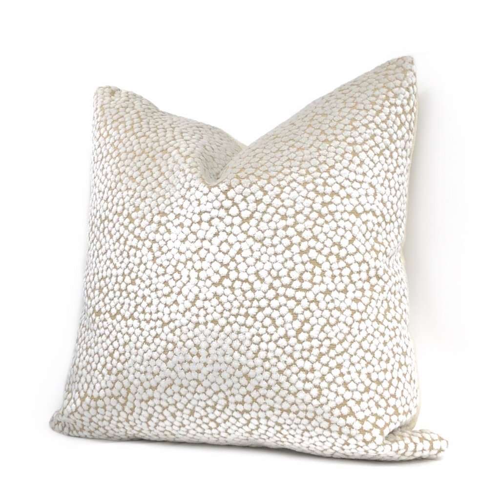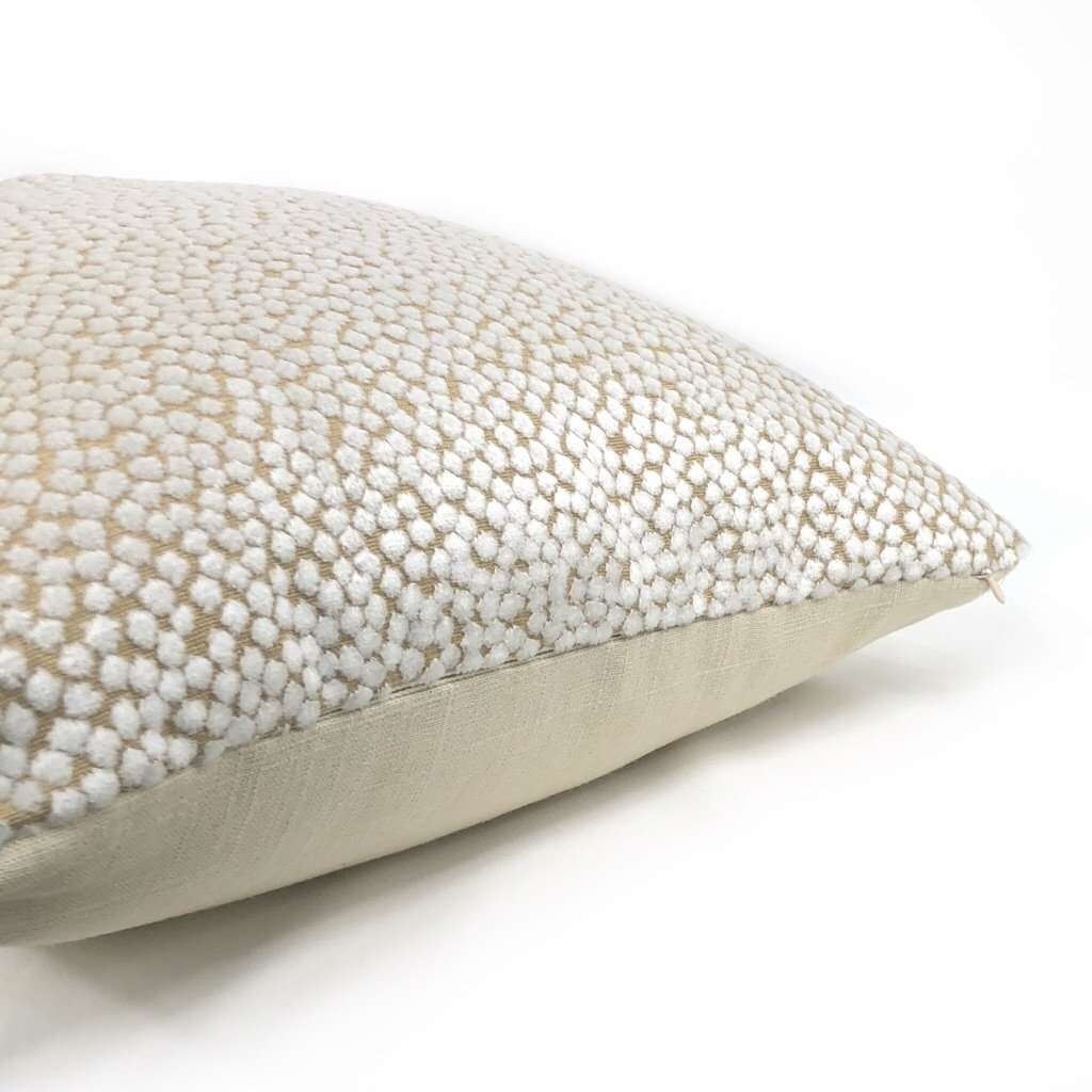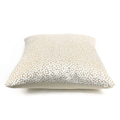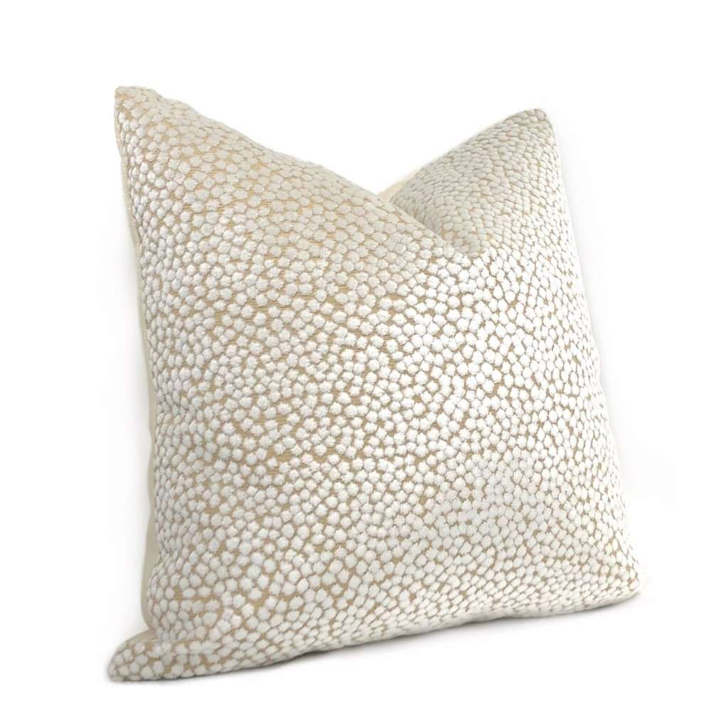 Almost sold out! The Catelyn pillow cover features soft white velvet dots woven on a sand beige background. Richly textured and gracefully sophisticated, the Catelyn pillow plays well with many other colors and patterns. Photographed on 17x17 cover (filled with 18x18 insert). Choose from the pattern fabric on both sides or with a solid natural linen backside. Catelyn is available in another color.