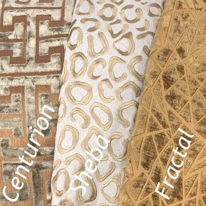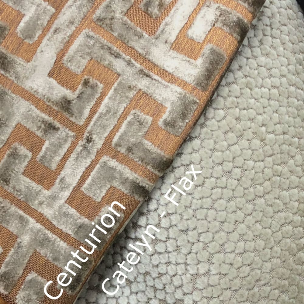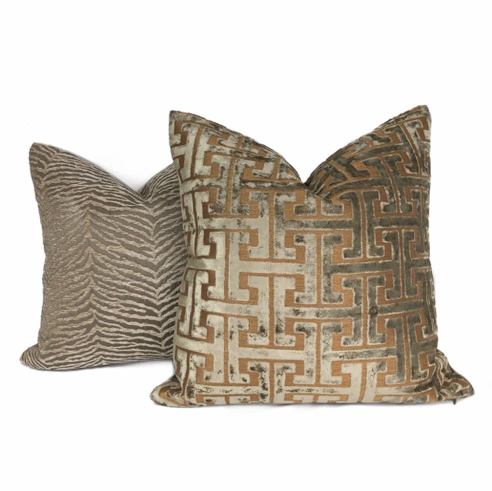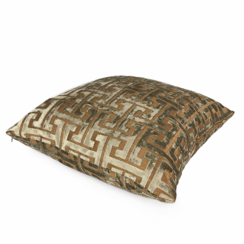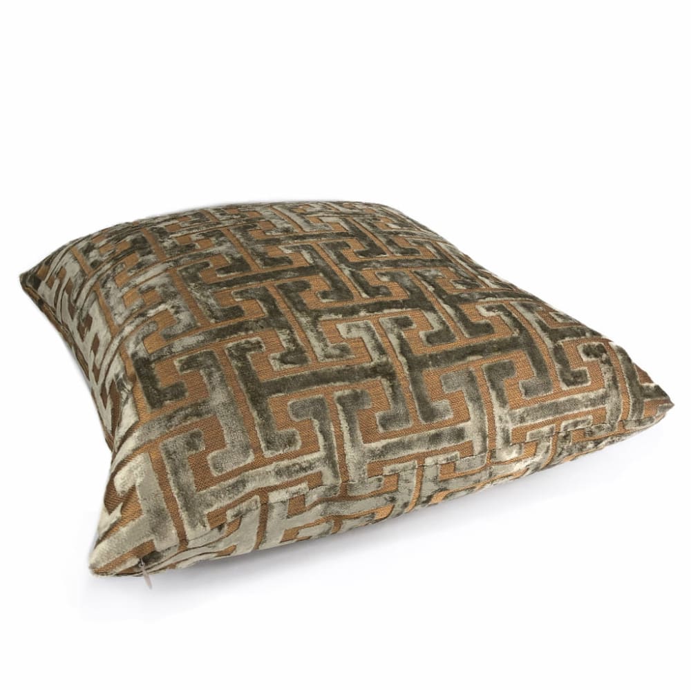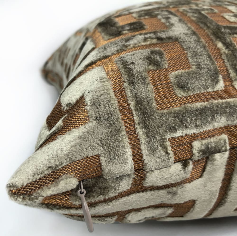 Lift your home decor to a whole new level with the Centurion pillow. Classic greek key fretwork design woven in a taupe-gray-bronze cut velvet on a coppery brown base. Absolutely fabulous and a must-have, especially given this fabric is a limited edition item.