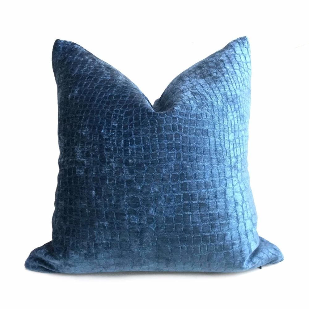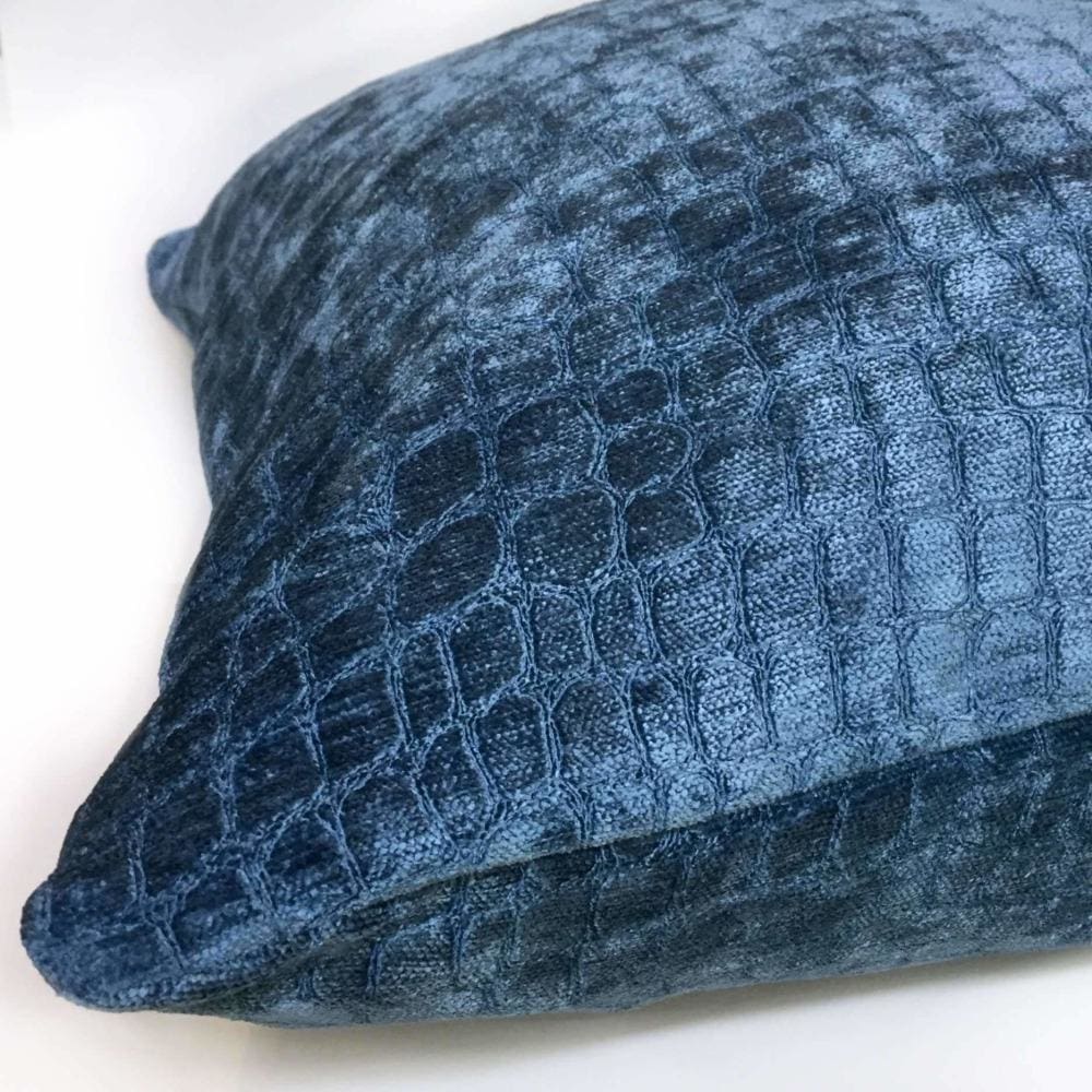 This stunning pillow cover is made from an embossed shiny chenille velvet fabric with a crocodile alligator skin design. The color is a cerulean blue that shines with a beautiful metallic luster in the light. Pillows like this are commonly featured in celebrity and designer homes in magazines, now it's time to have your very own!