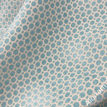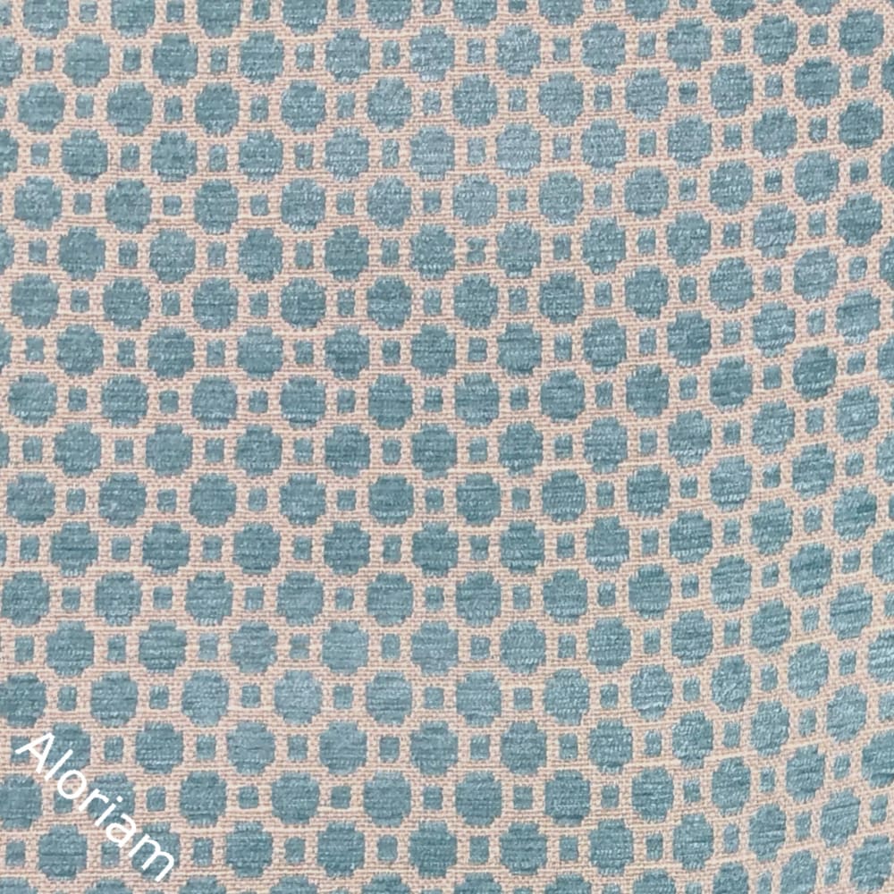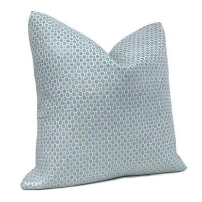 The Chelsea pillow cover features a small scale geometric design woven in a refreshing turquoise blue. The chenille upholstery weight fabric has a soft hand and would add a calming hue to any decor.