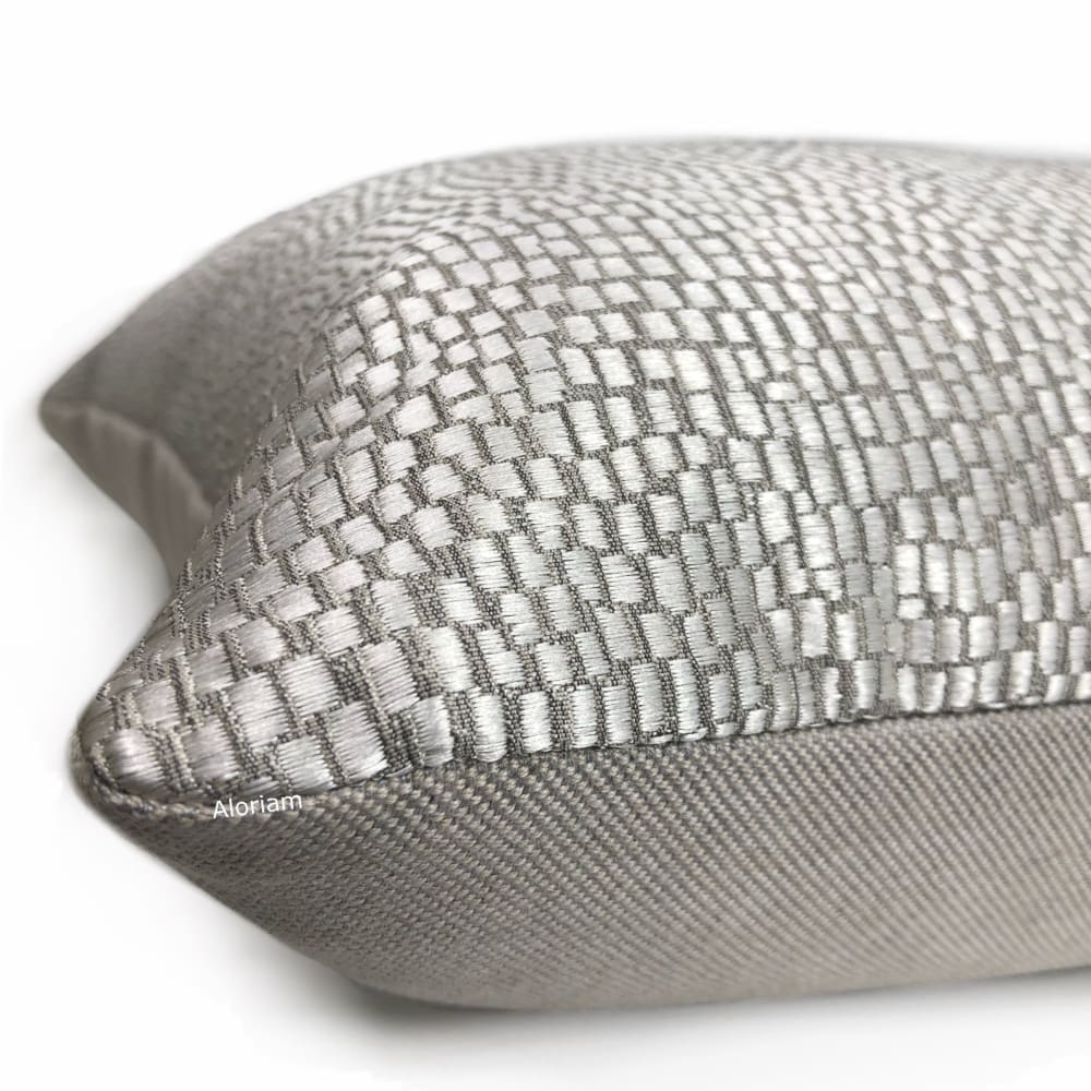 Almost sold out! The Cinna pillow cover features a small scale modern mosaic tile pattern woven in silvery gray.