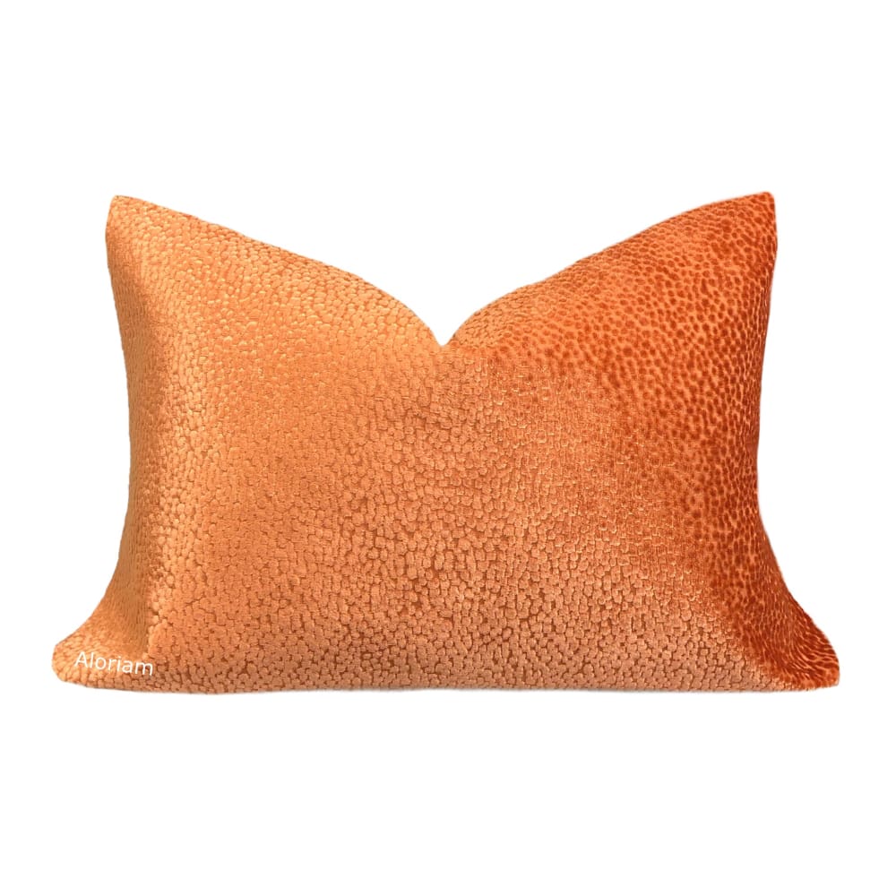 The Comtessa pillow offers small textured velvet dots woven in a dazzling tangerine orange velvet that shines so beautifully under the light.