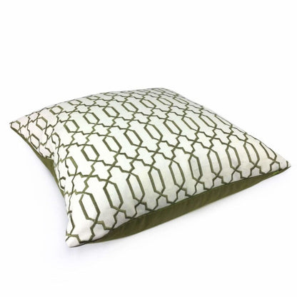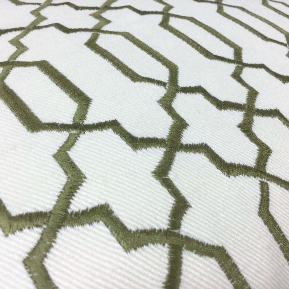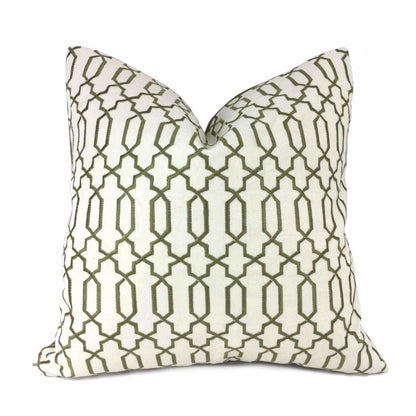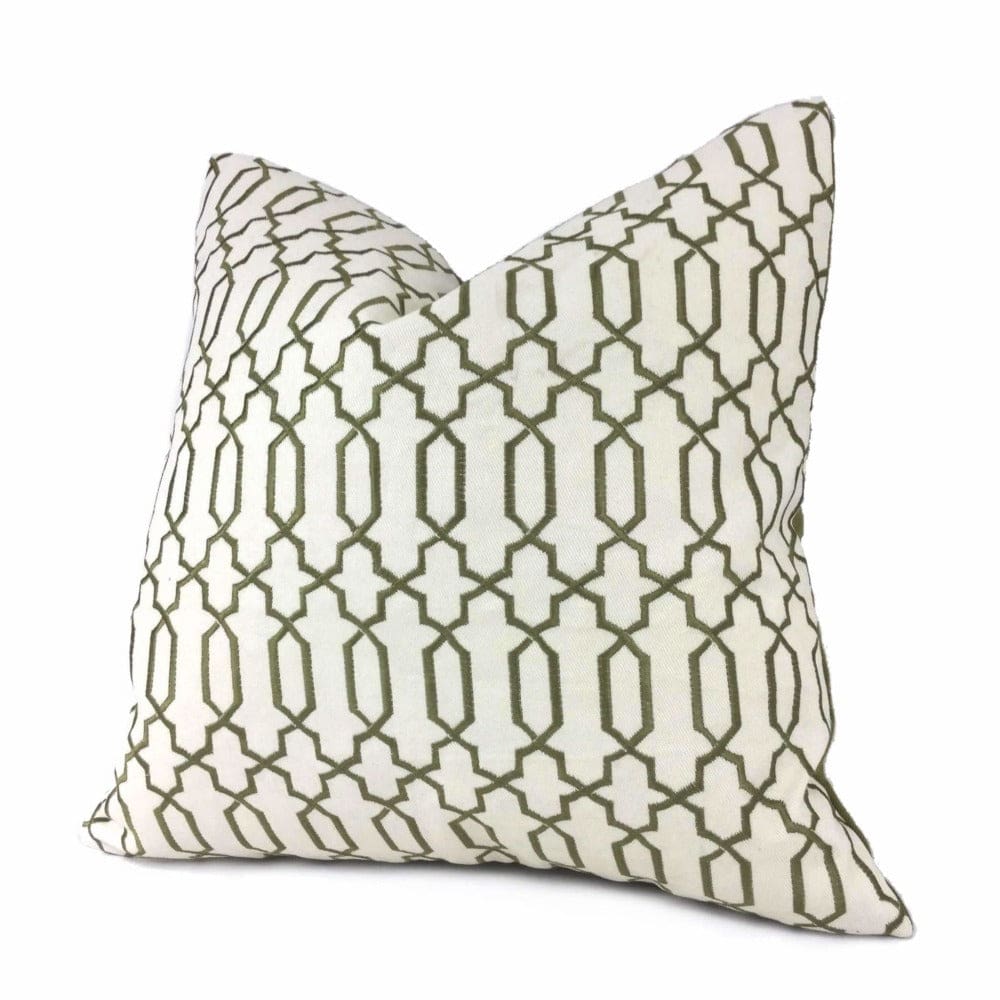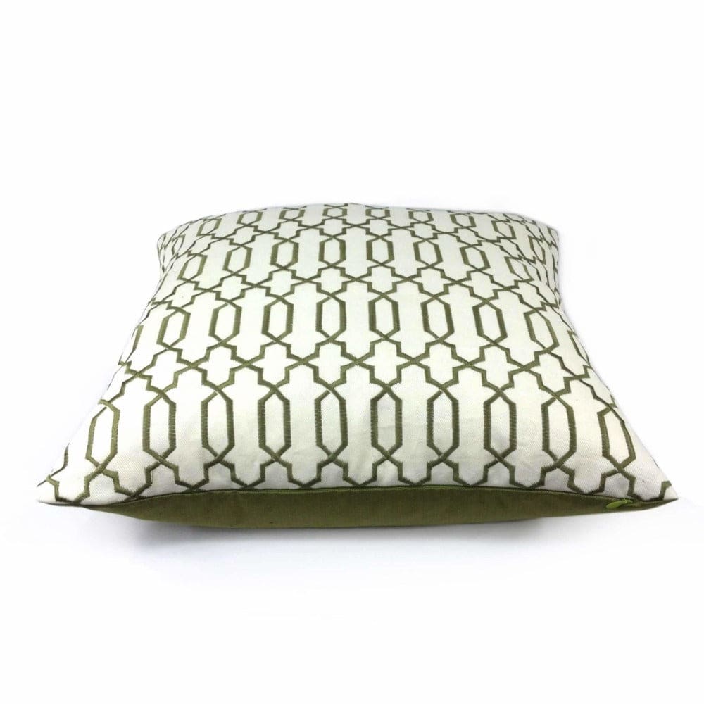 This elegant embroidered lattice fretwork pillow cover is a graceful addition to any home interior. The dense embroidery is a green olive color, offset against a cream background.