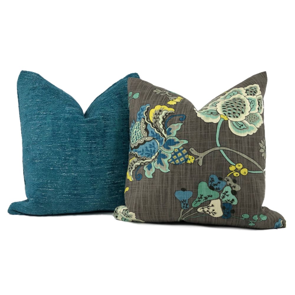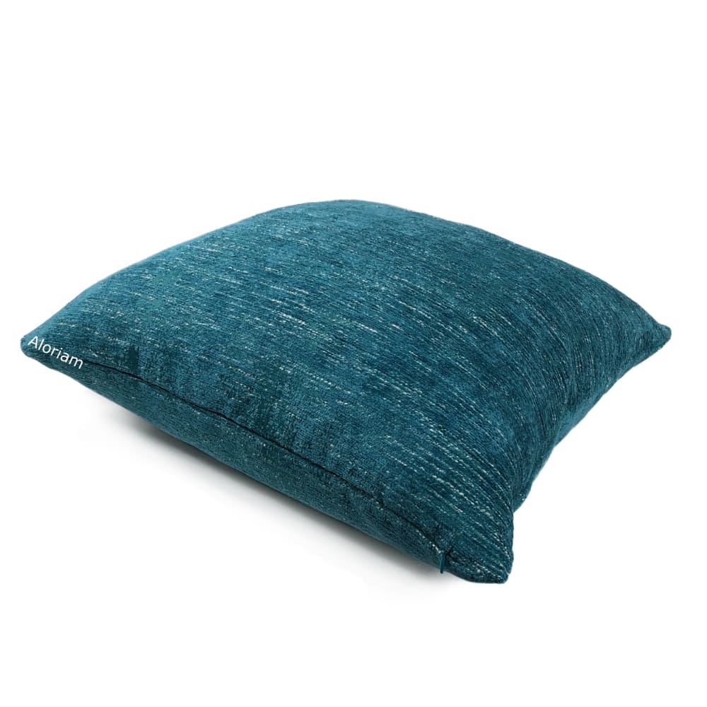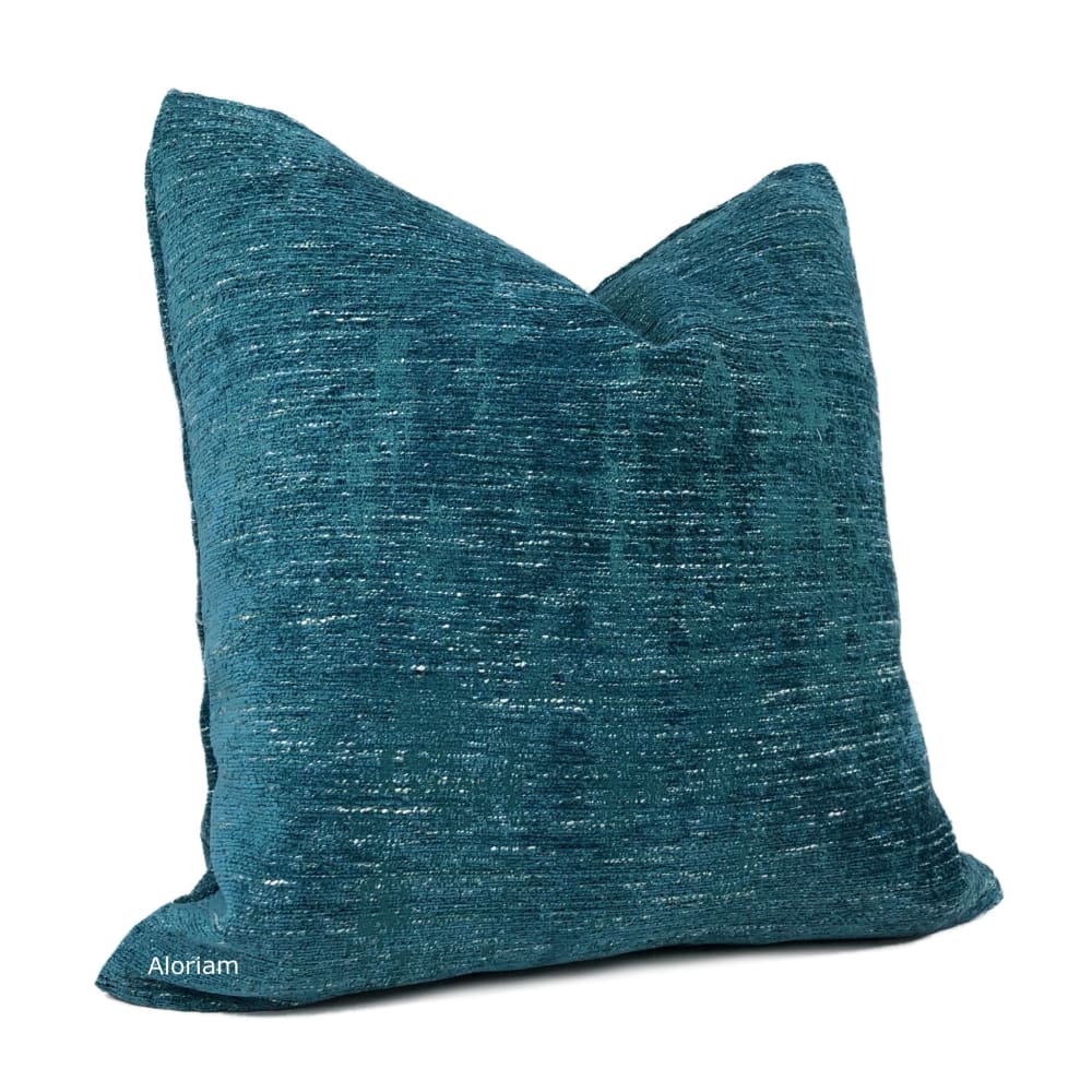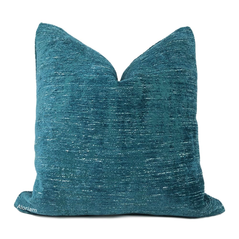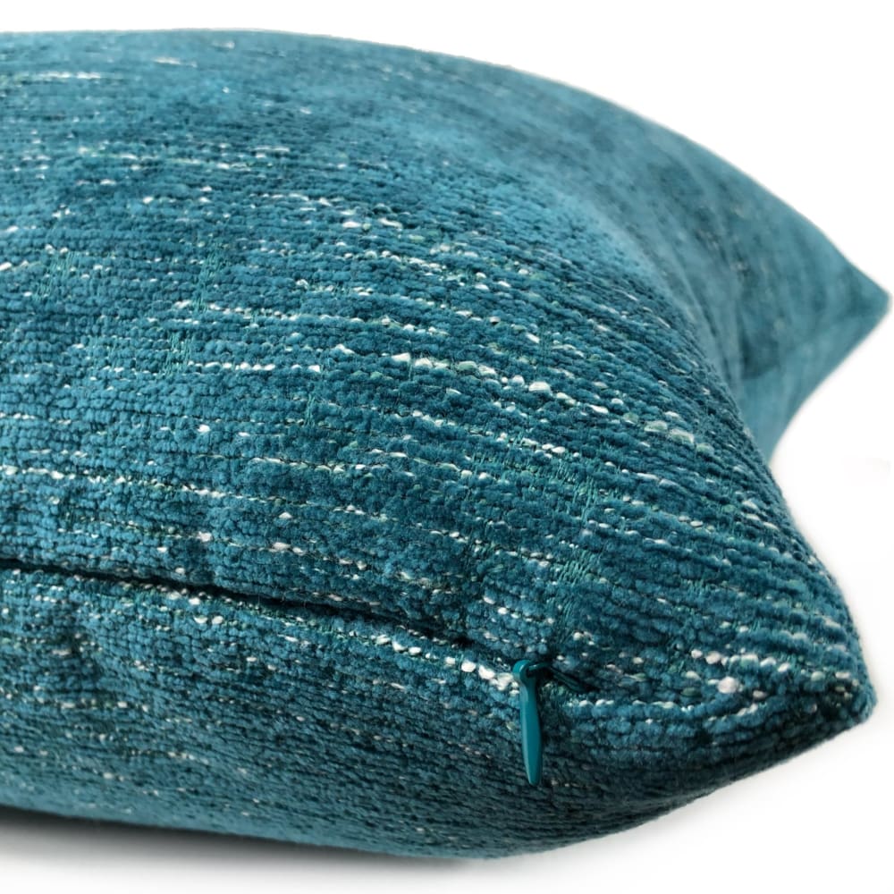 Knox is a jewel toned teal blue-green chenille pillow cover woven with off-white slubbed yarns for added texture.