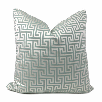 Cleo is a classical greek key pillow cover woven in seafoam green against a pearly silver gray background. Offered in your choice of the pattern fabric on both sides or with a coordinating solid backside.