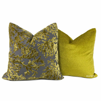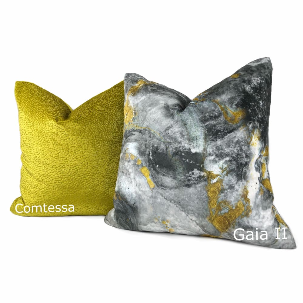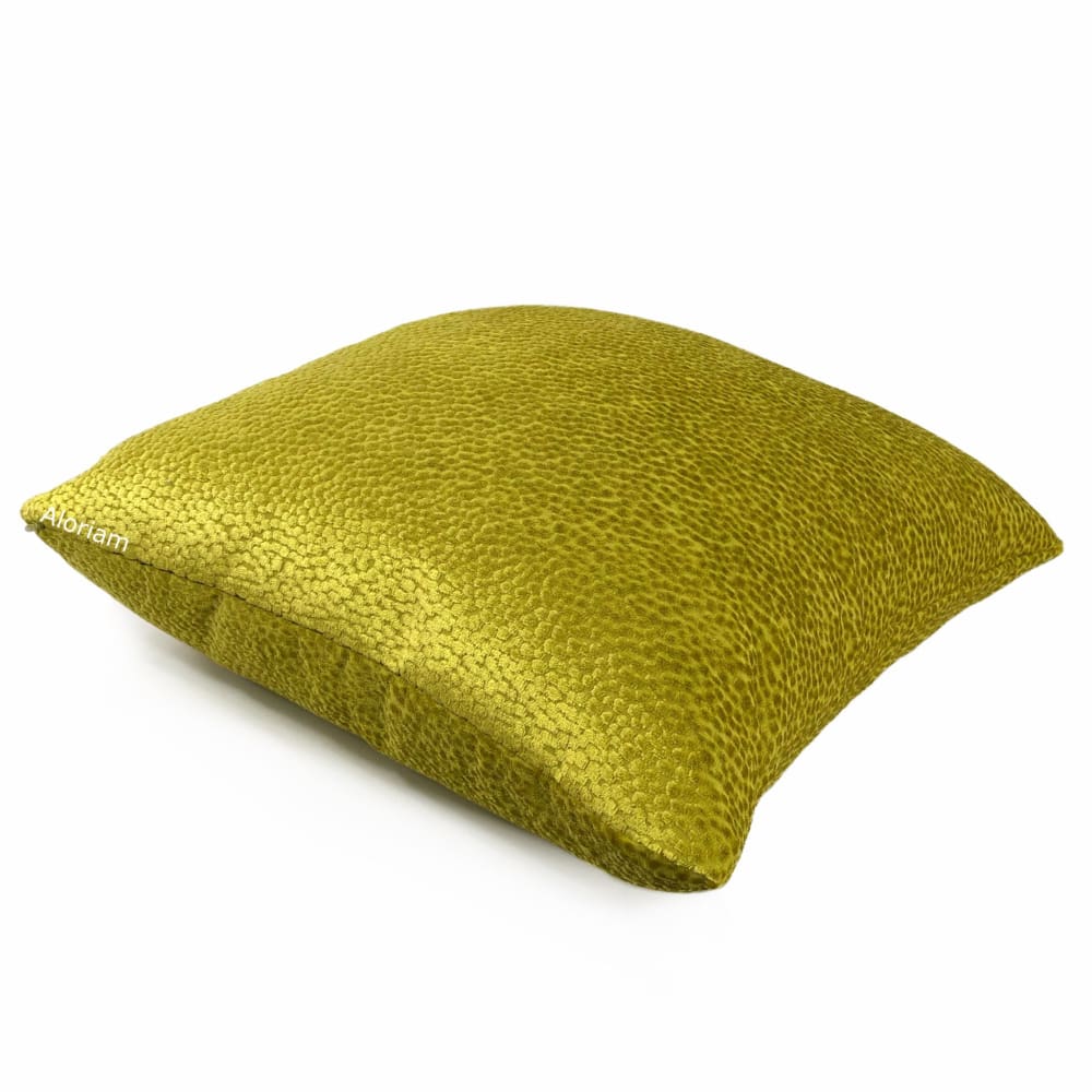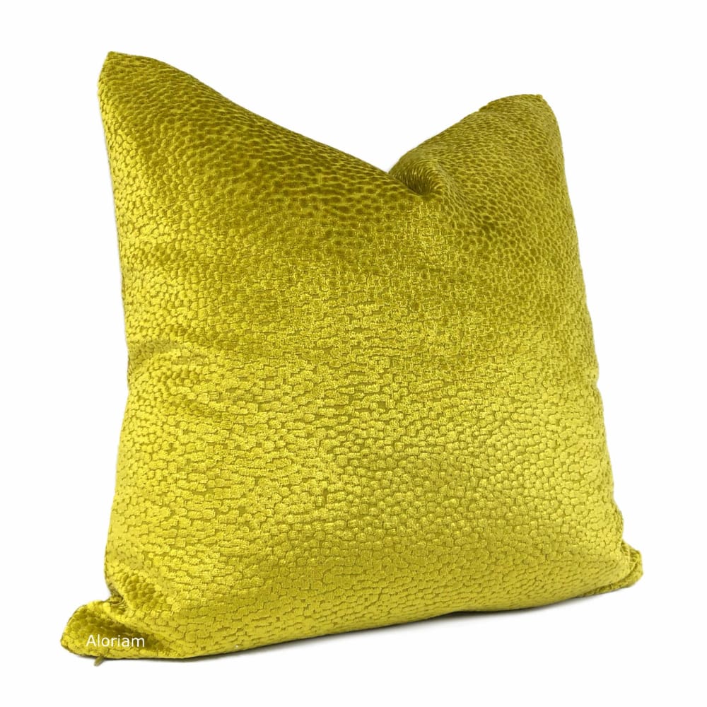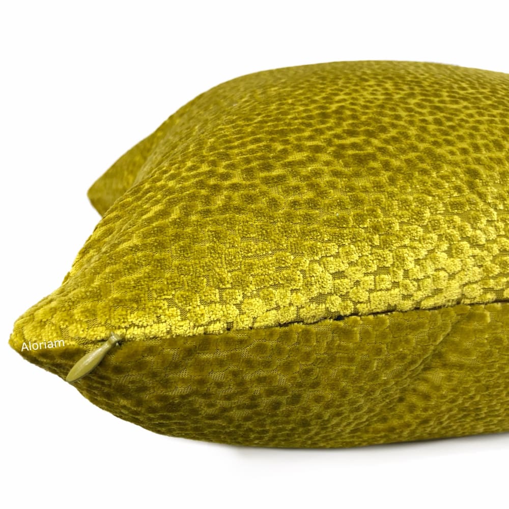 The Comtessa pillow offers small textured velvet dots woven in a dazzling acid yellow gold velvet that shines so beautifully under the light.