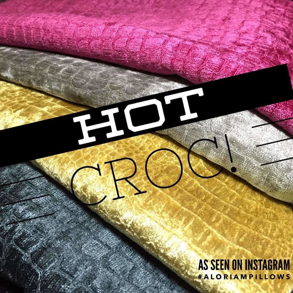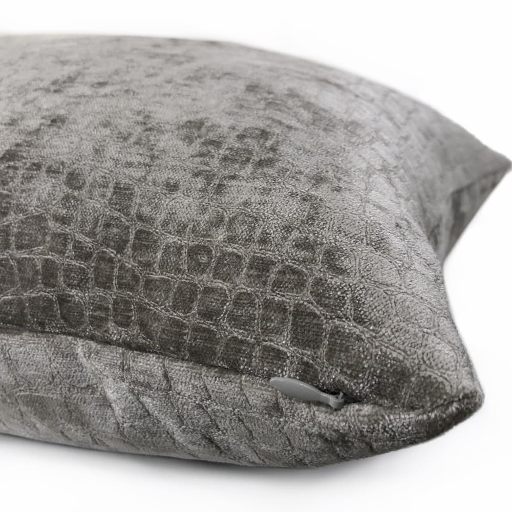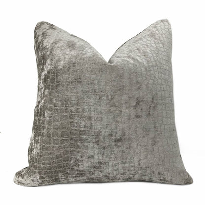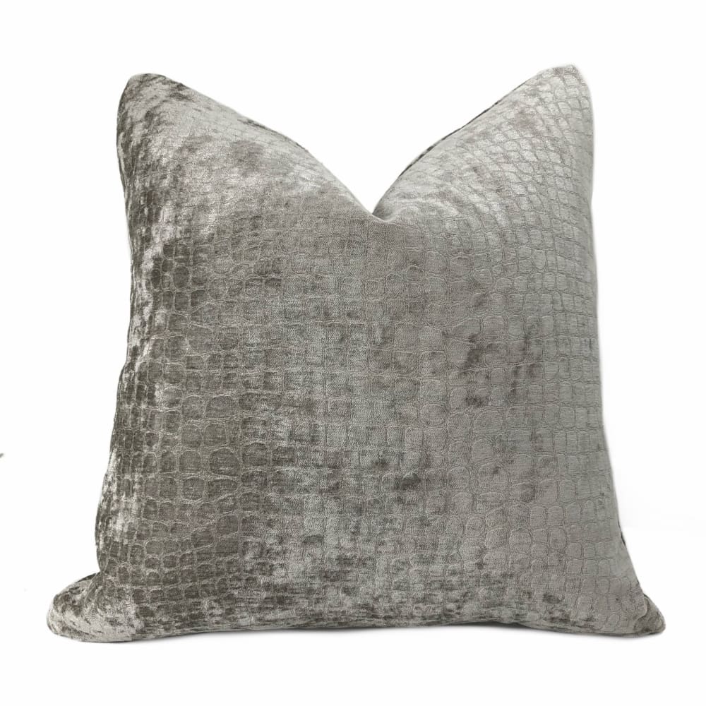 This stunning pillow cover is made from an embossed textured velvet fabric with a crocodile alligator skin design. The color is an elegant silver gray that shines with a beautiful metallic luster in the light. Pillows like this are commonly featured in celebrity and designer homes in magazines, now it's time to have your very own!