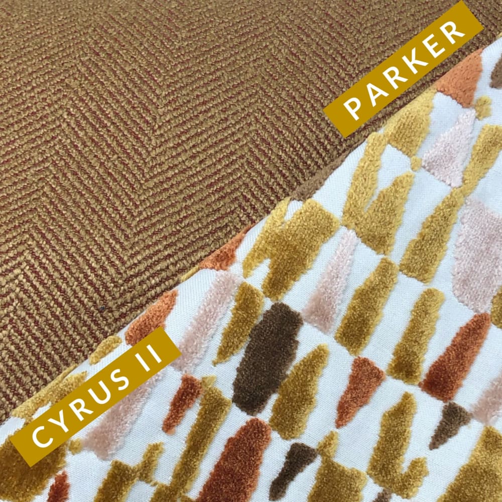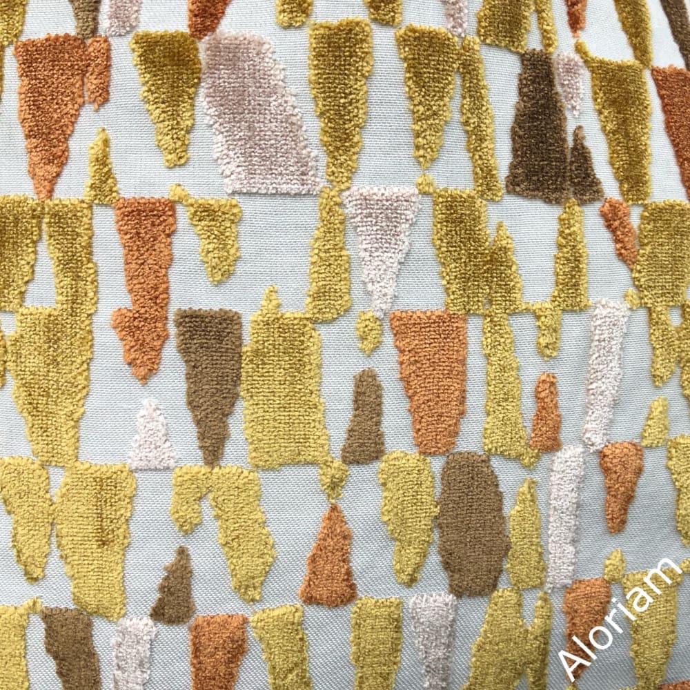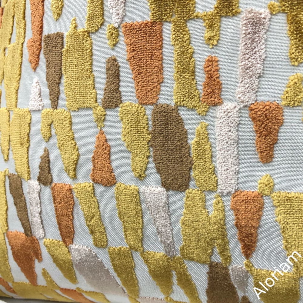 Cyrus is a modern pillow cover with an abstract pattern woven in gold, orange, brown and cream velvet.