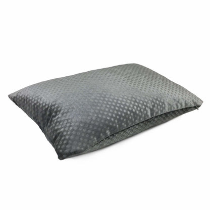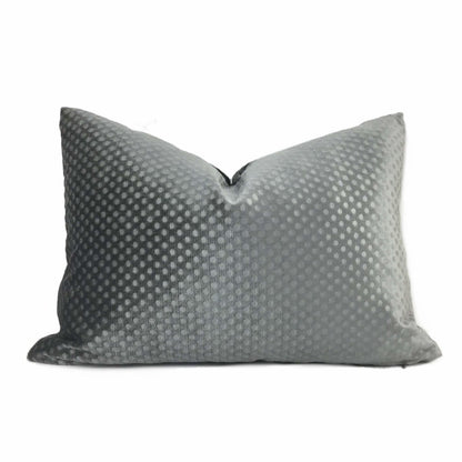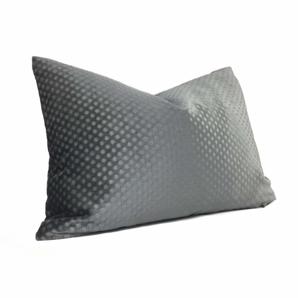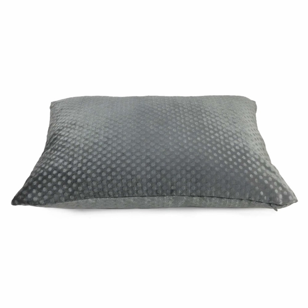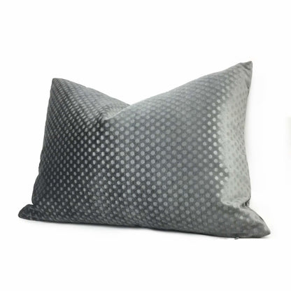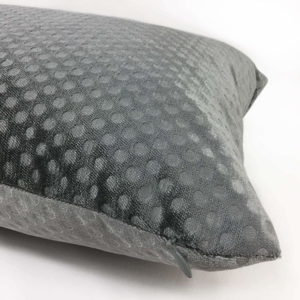 This dark gray velvet pillow cover features an all over dimple dots pattern pressed into the velvet pile, creating an attractive embossed pattern that mixes well with many other designs. Photographed on 14x20 insert. Also available in light gray and pink.