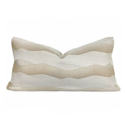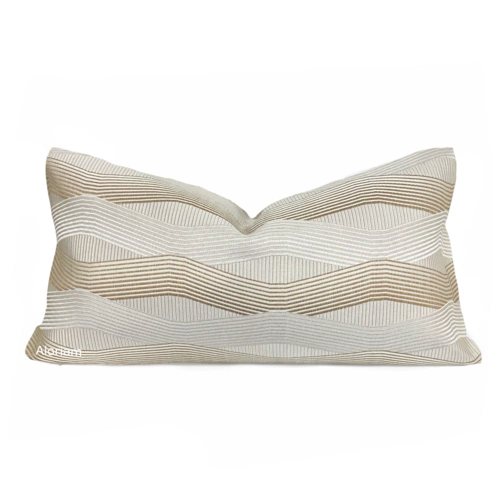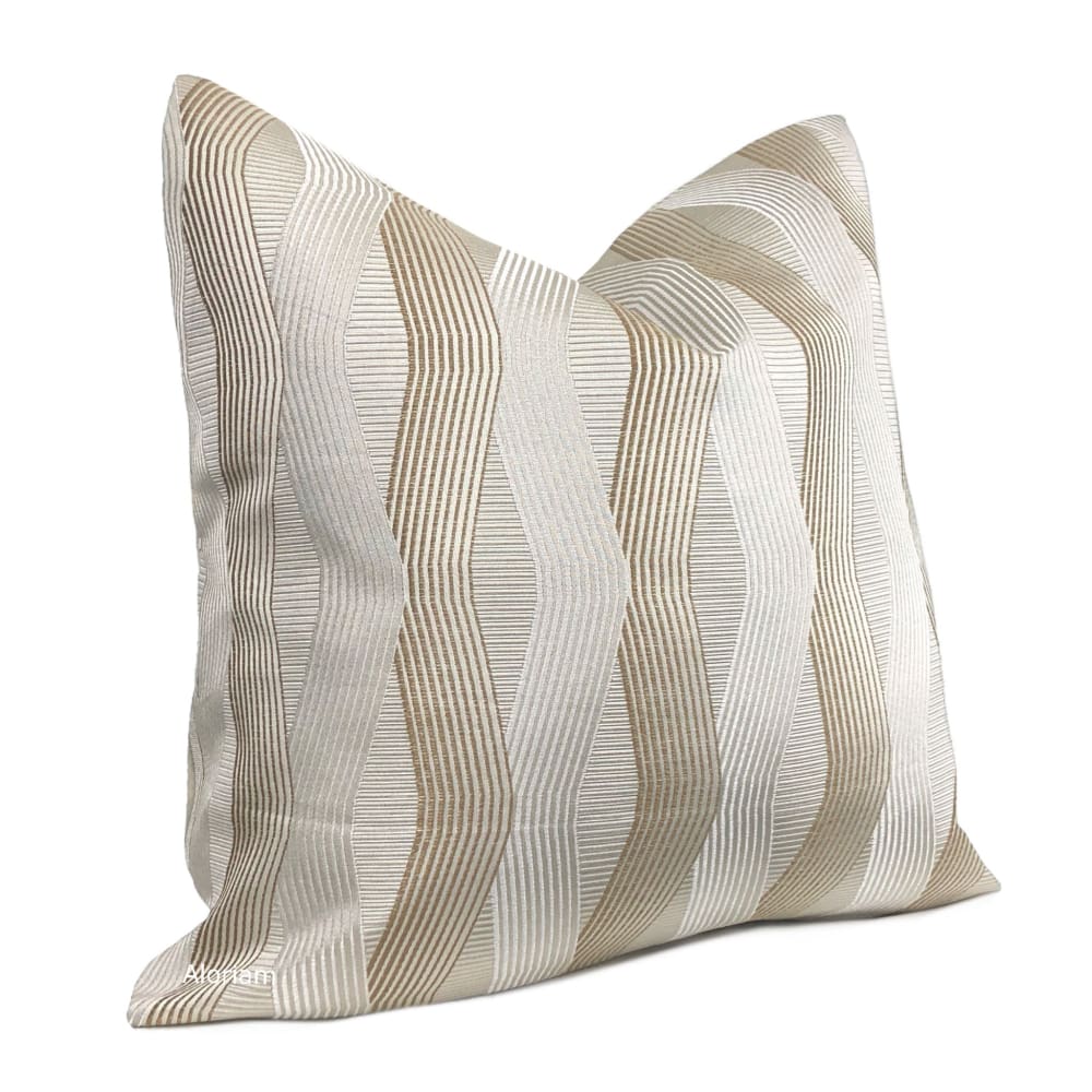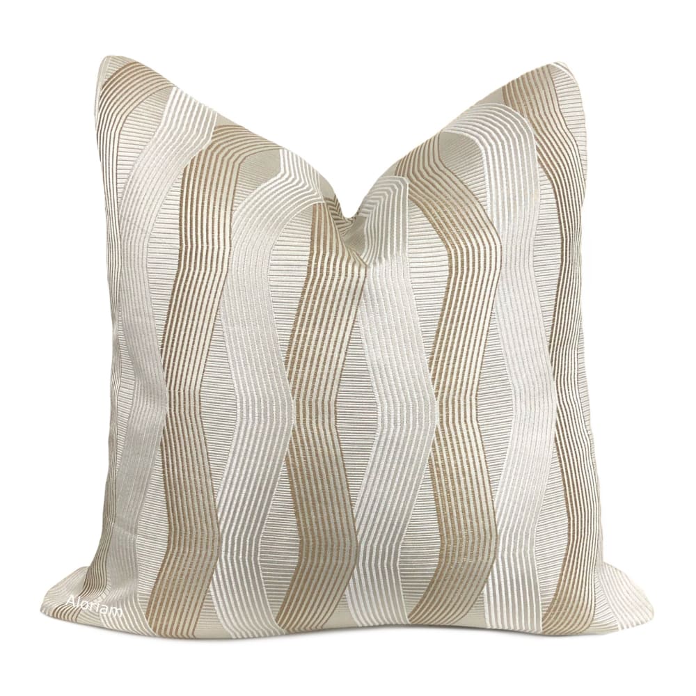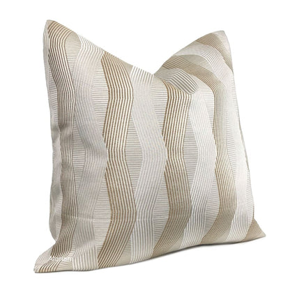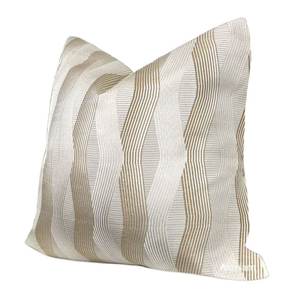 Days Grace is a pearly ivory and bronze brown pillow cover with a wavy ribbon design.