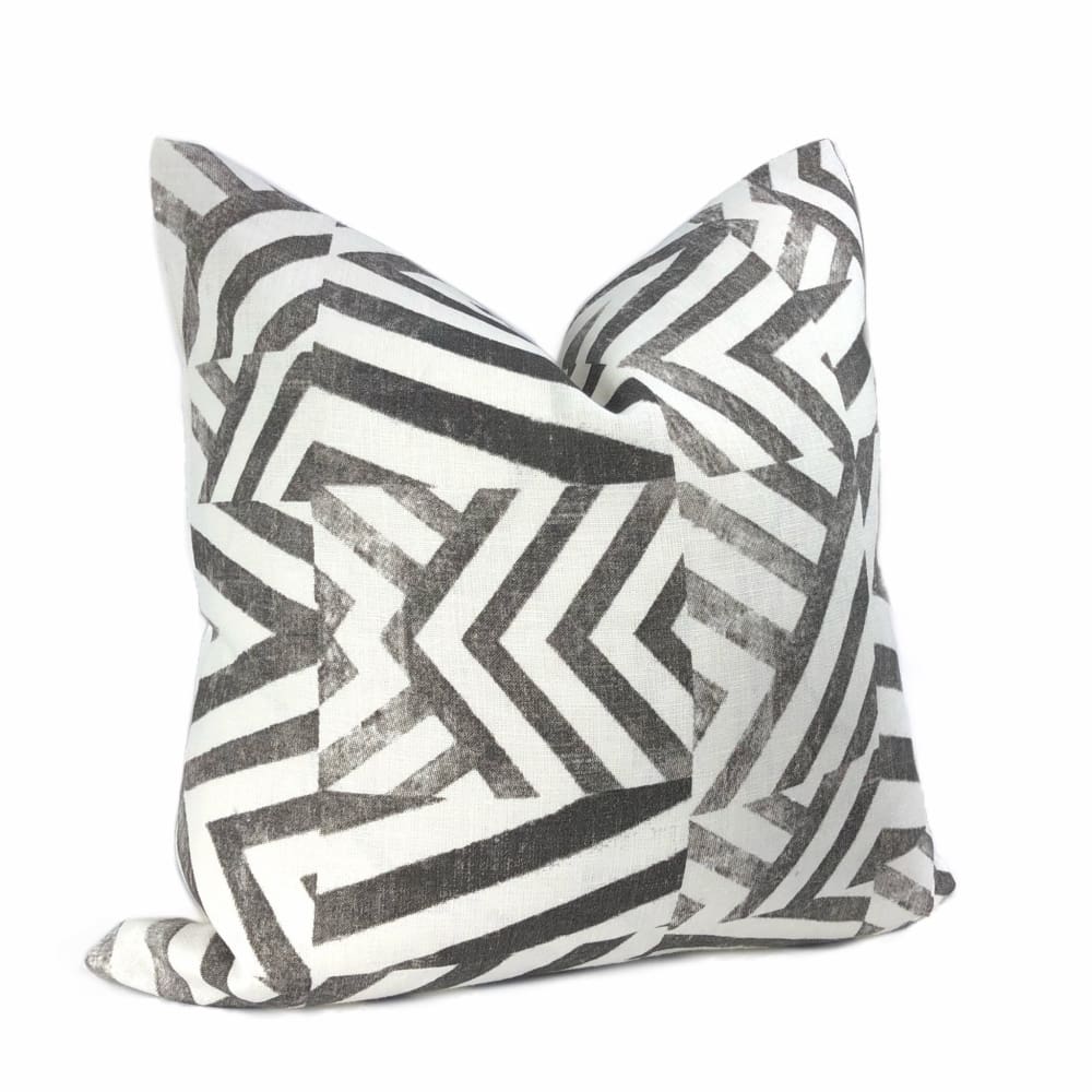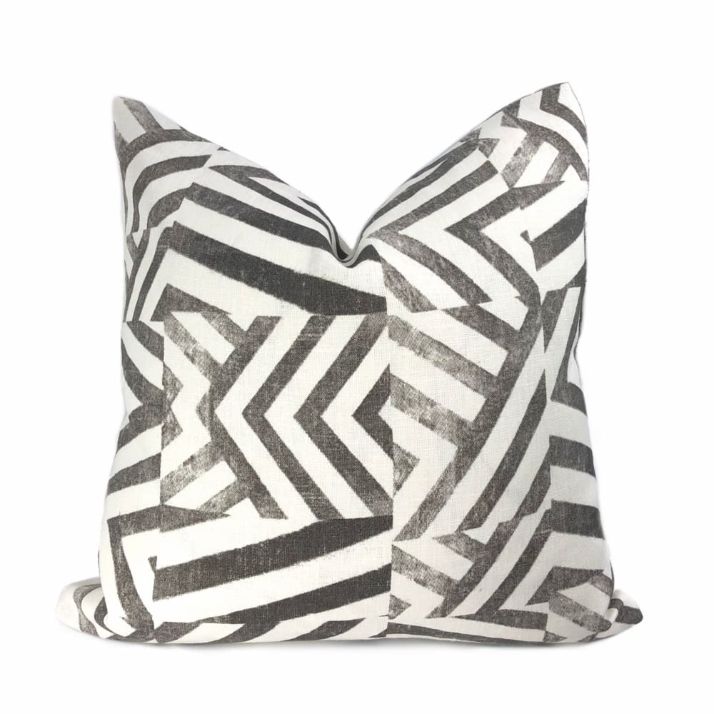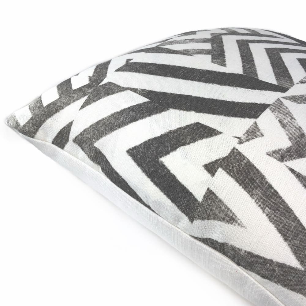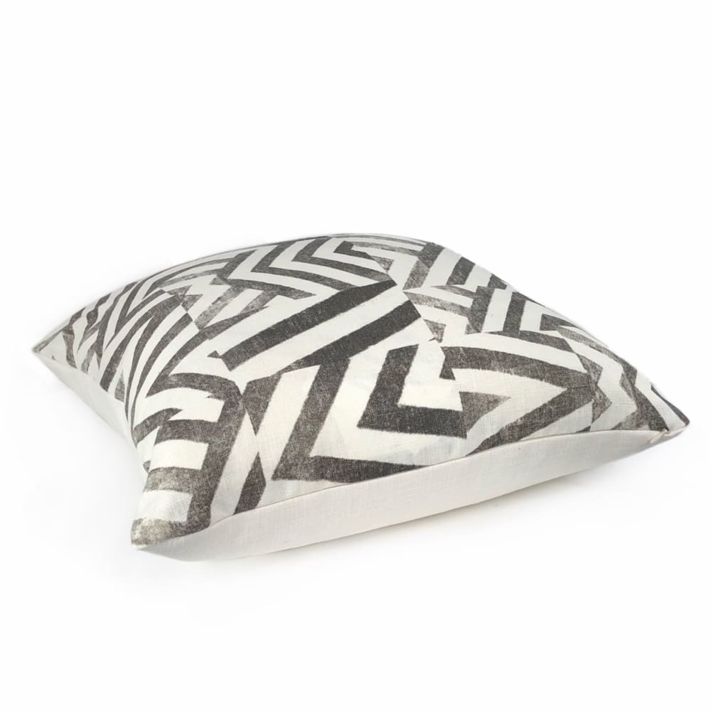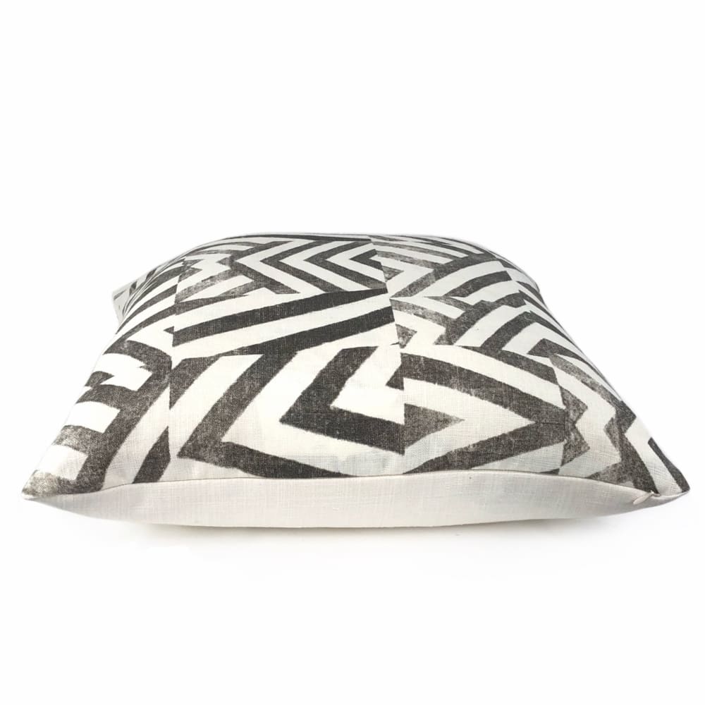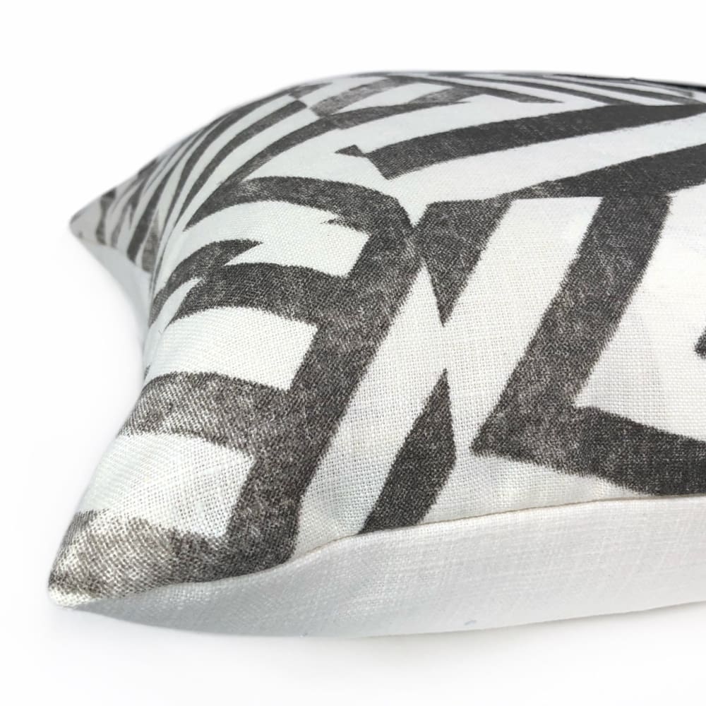 Delancey is a linen pillow cover printed with a modern crosshatch pattern in soft black and creamy white. Photographed on 19x19 cover (filled with 20x20 insert).