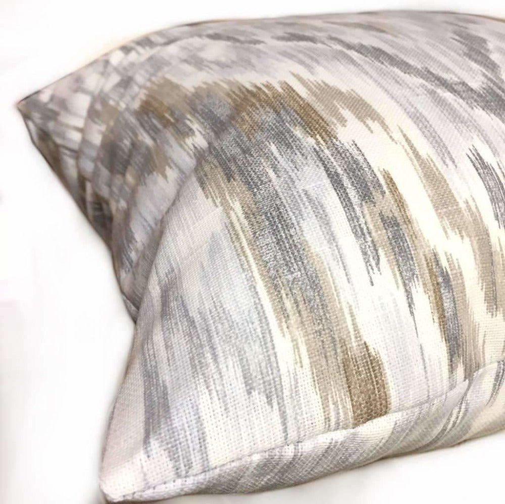 K'vali is an ikat style cotton print pillow cover with an abstract pattern of gray and brown on a cream background. This is a versatile pattern that looks great with many other designs and the neutral colors are assets in your decorating toolbox.