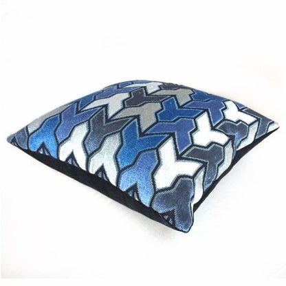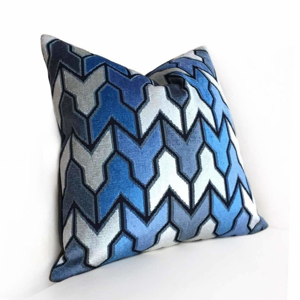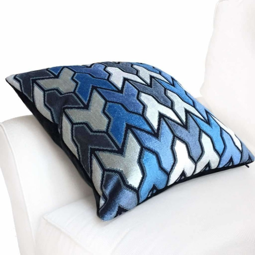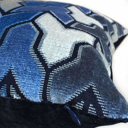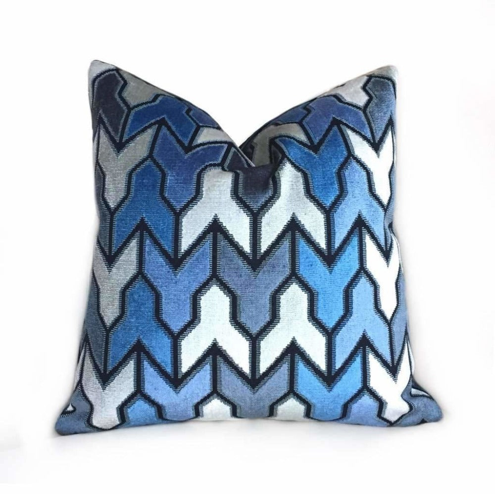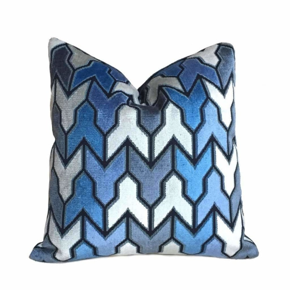 Lush velvet texture meets modern geometry in this eye catching pillow cover made from a designer textured fabric. The arrow-like geometric design is woven in navy blue, slate blue, sky blue and cream velvet. The pattern velvet fabric has a soft luxurious hand and will add style and sophistication to any space. The back of the cover is a coordinating solid navy blue velvet. Photographed on 17x17 cover (filled with 18x18 insert). Available in additional colors.