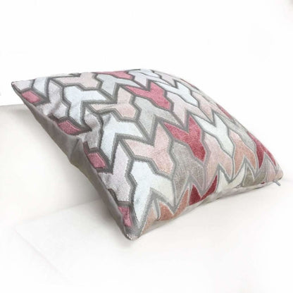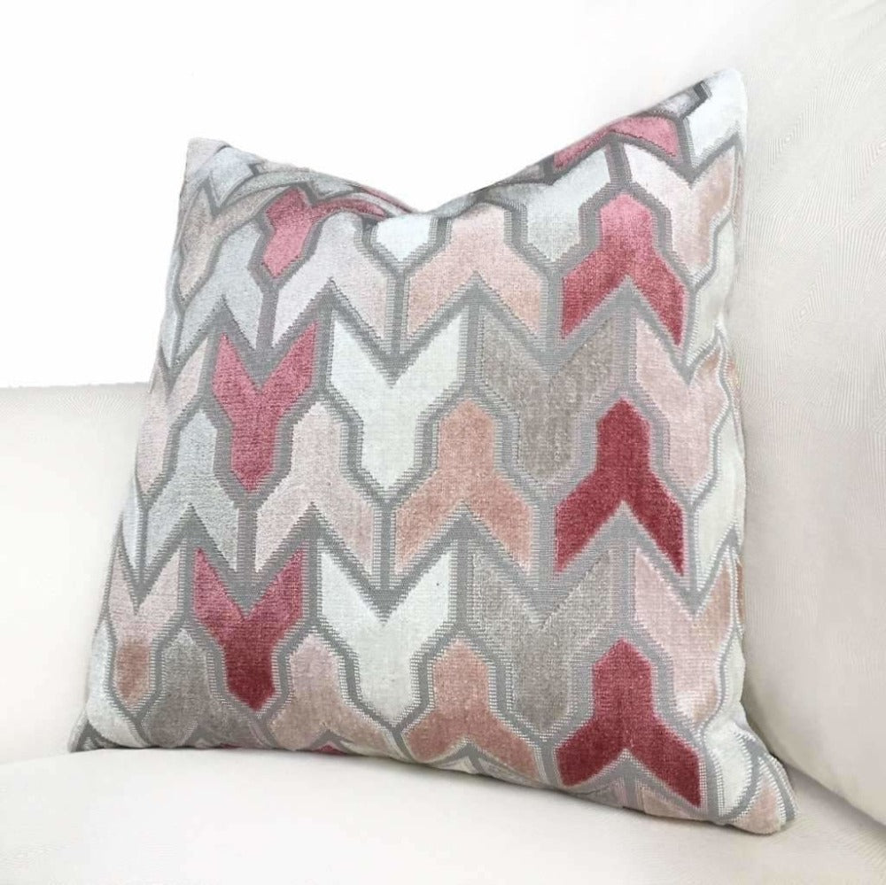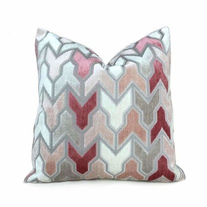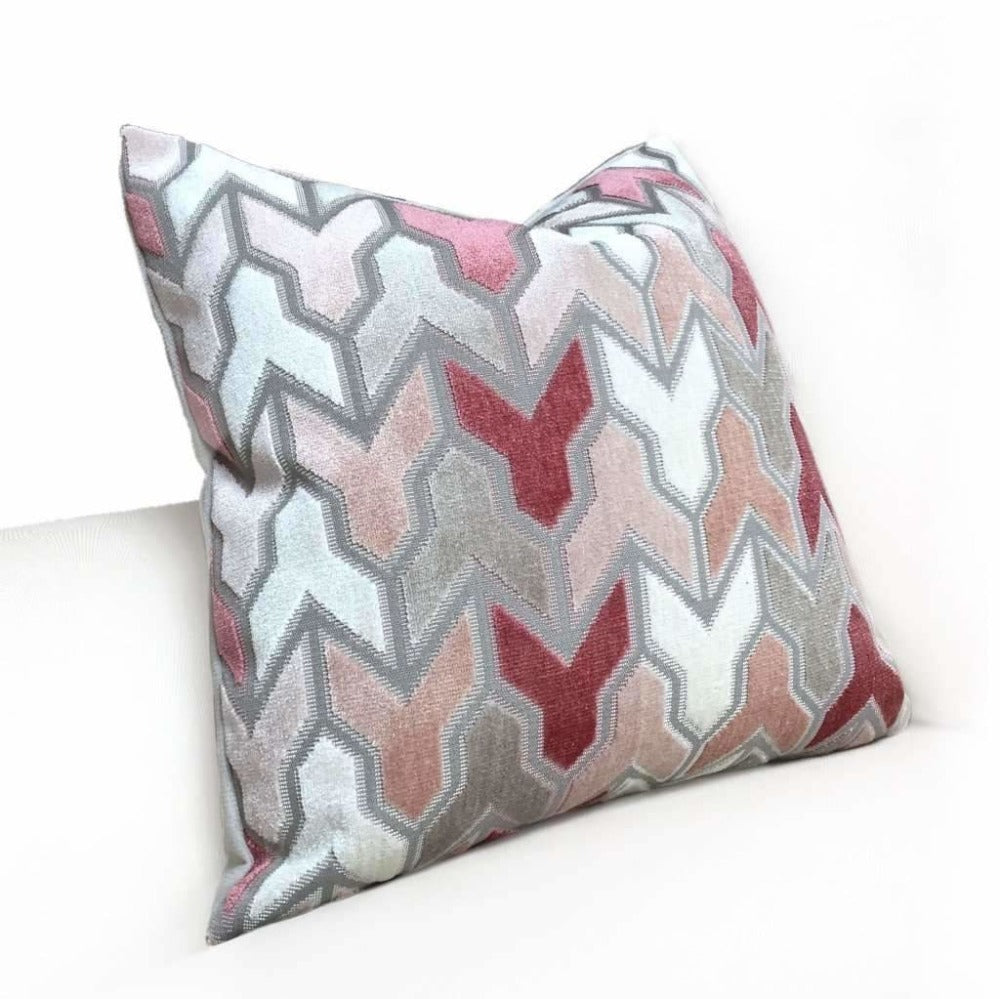 Lush velvet texture meets modern geometry in this eye catching pillow cover made from a designer textured fabric. The arrow-like geometric design is woven in pink, gray and cream velvet. The pattern velvet fabric has a soft luxurious hand and will add style and sophistication to any space. The back of the cover is a coordinating solid gray velvet. Photographed on 17x17 cover (filled with 18x18 insert). Available in additional colors.
