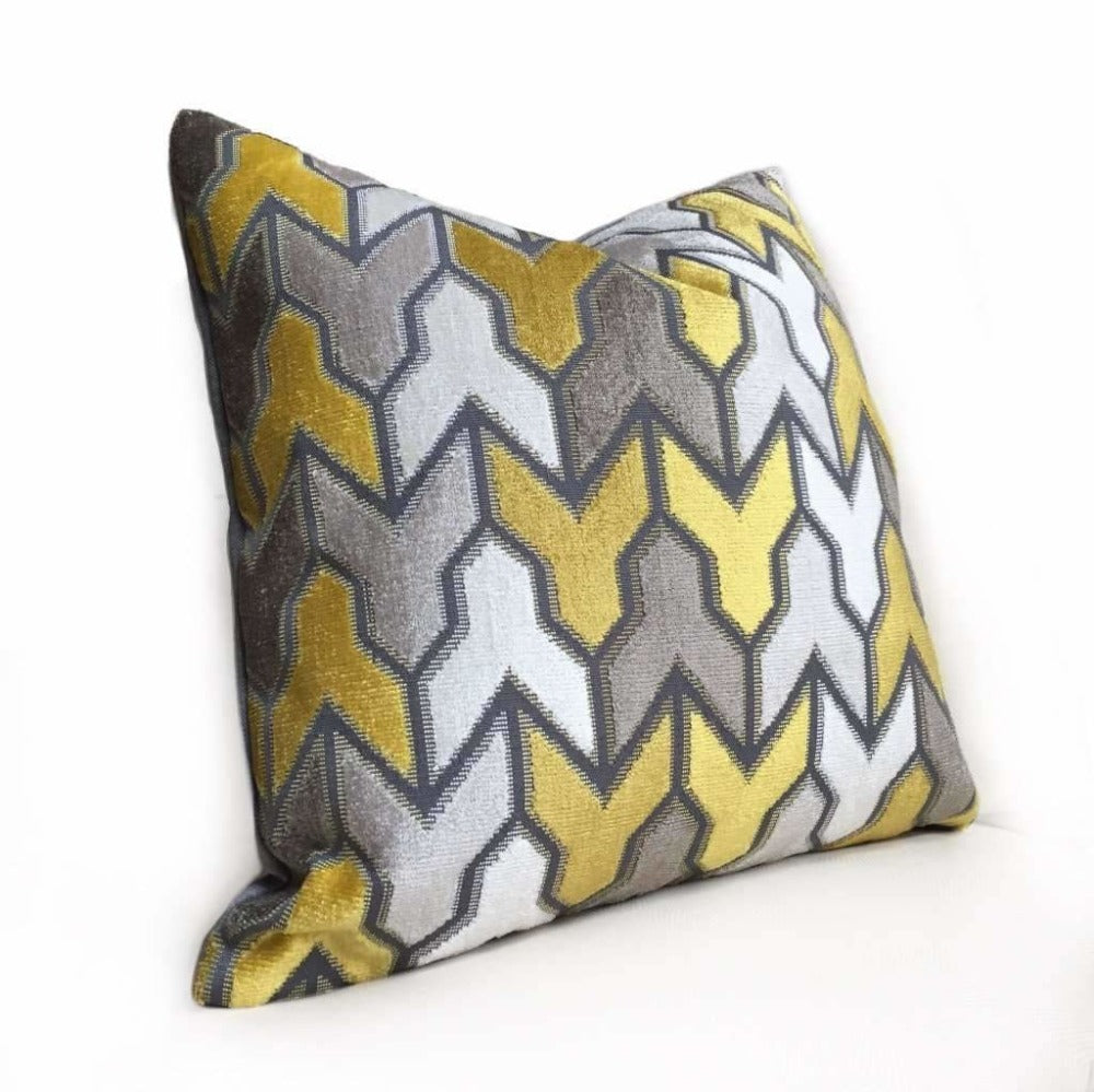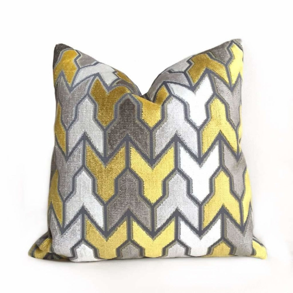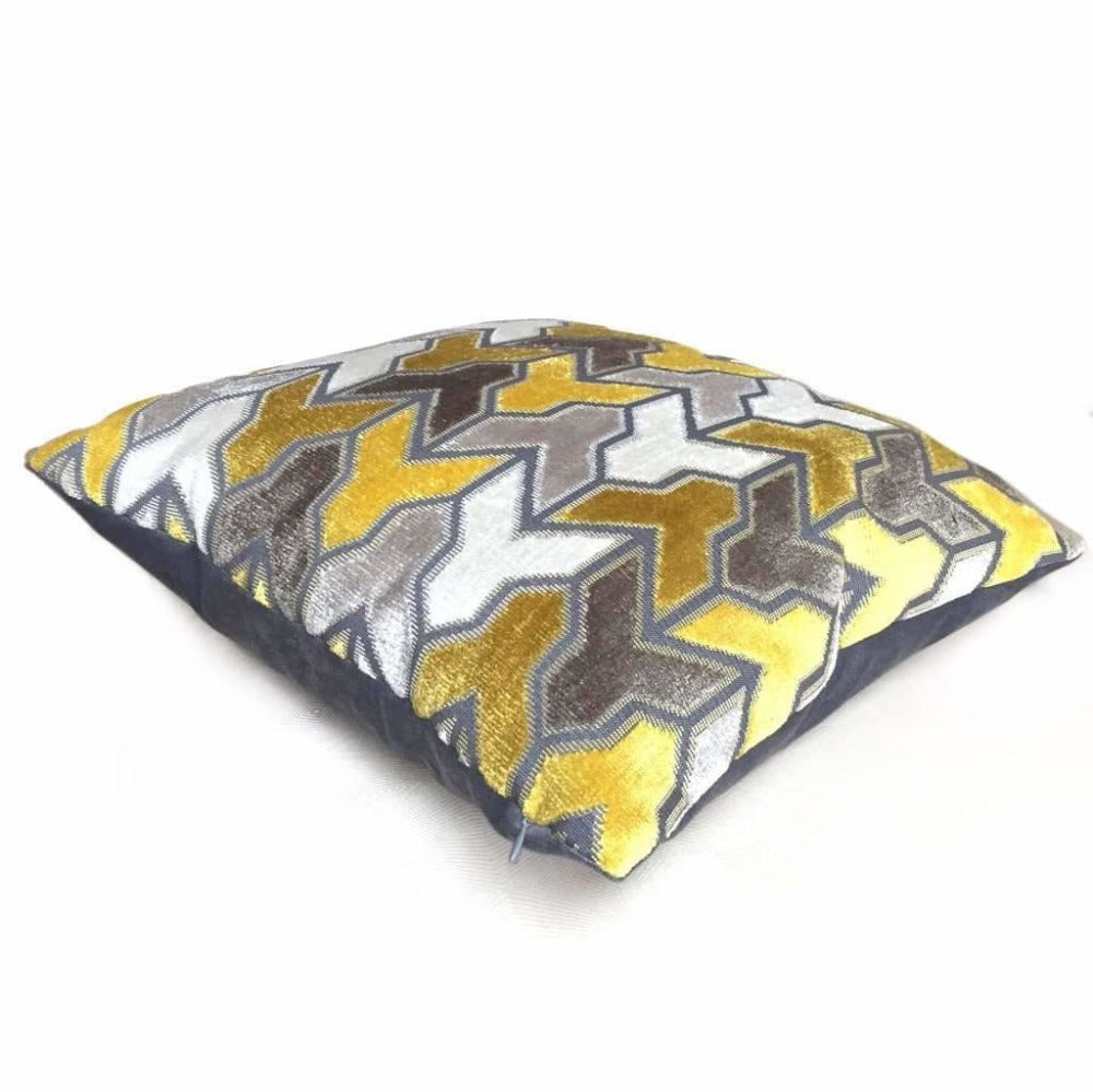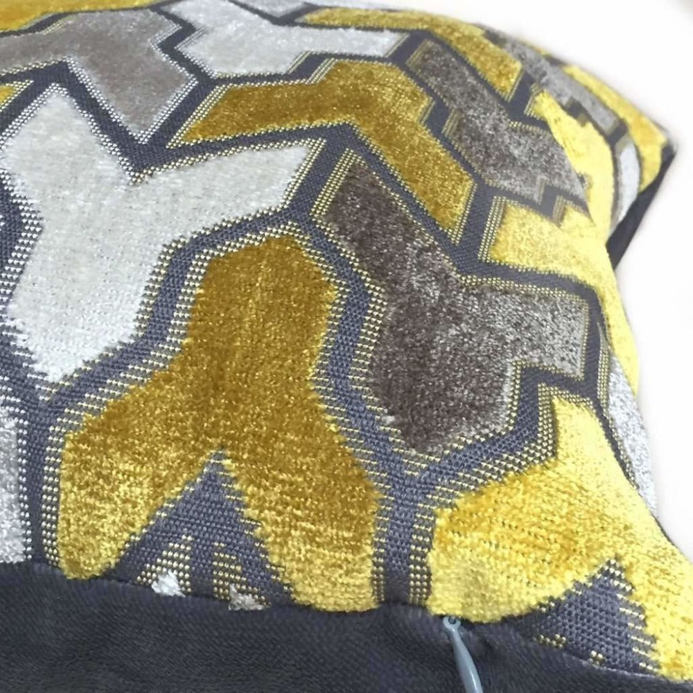 Lush velvet texture meets modern geometry in this eye catching pillow cover made from a designer textured fabric. The arrow-like geometric design is woven in mustard yellow, gray and cream velvet. The pattern velvet fabric has a soft luxurious hand and will add style and sophistication to any space. The back of the cover is a coordinating solid gray velvet.