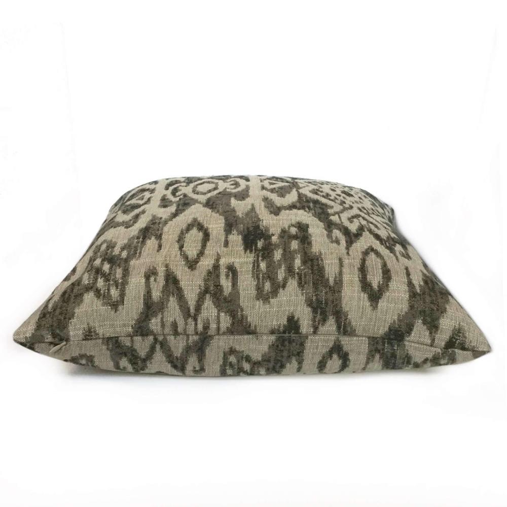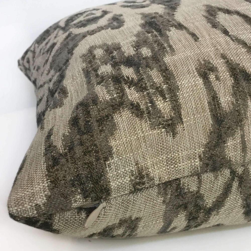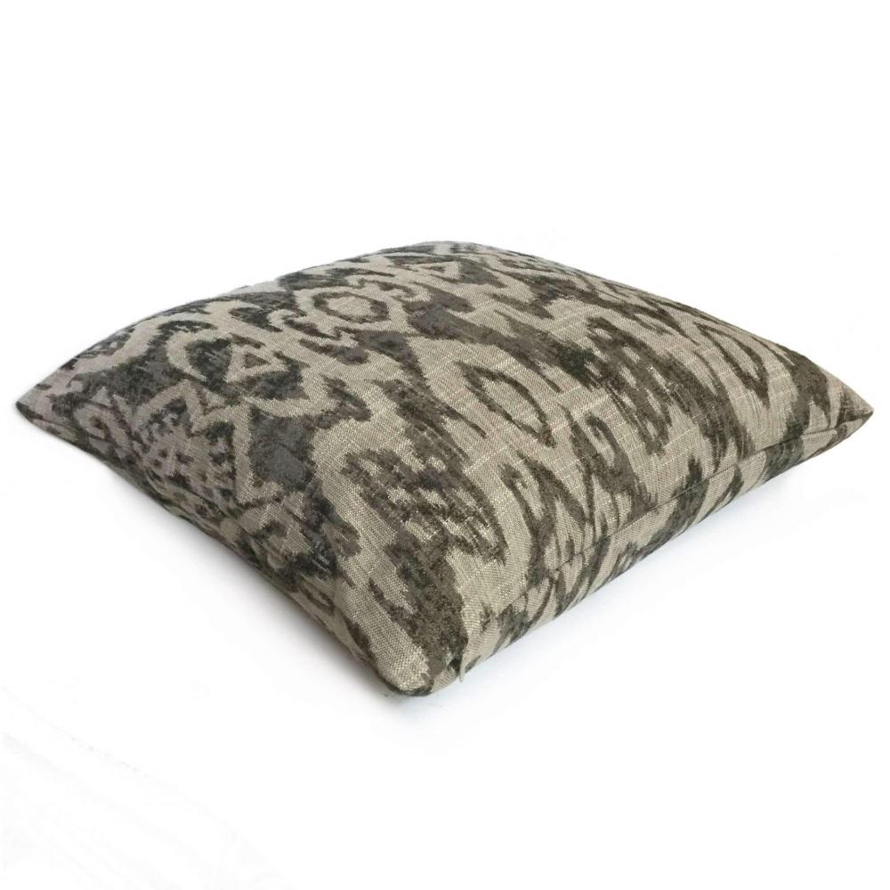 This pillow cover is made from a designer ikat-style upholstery fabric woven in multiple shades of gray and tan.