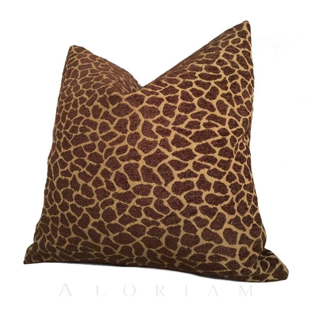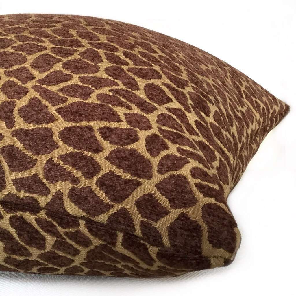 Last one! This stunning pillow cover is made from a giraffe pattern designer chenille fabric woven in rich brown and ochre tan. Pillows like this are commonly featured in celebrity and designer homes in magazines, now it's time to have your very own! Photographed on 17x17 cover (filled with 18x18 insert).