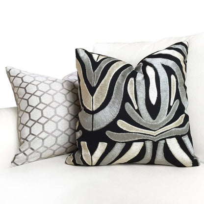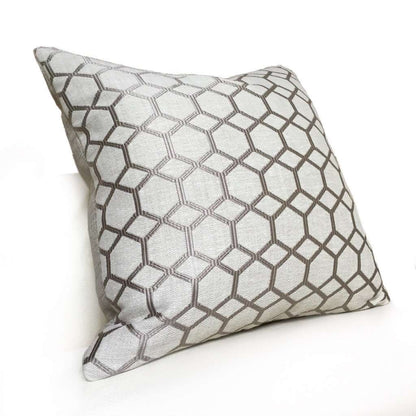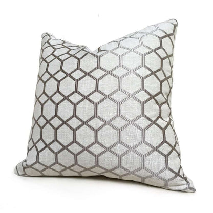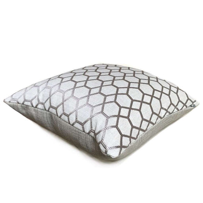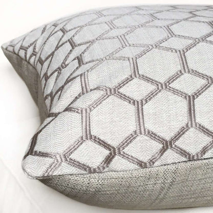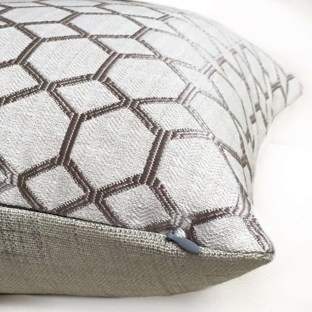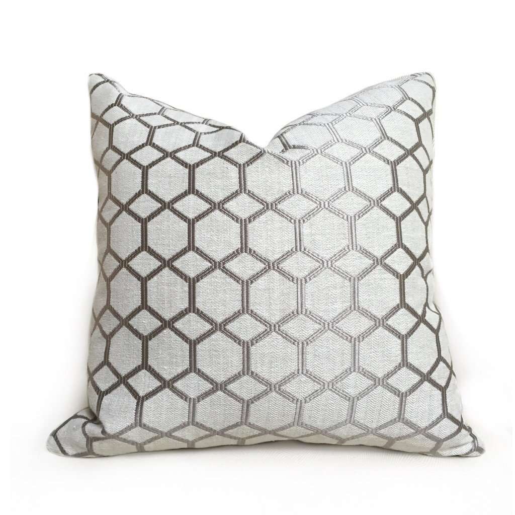 The Brooke pillow cover features a classic interlocked hexagon lattice pattern. The geometric pattern is woven in lustrous gray on a gray-tinted off-white background. Pattern fabric front with a coordinating solid light gray backside. Amazing with florals, ikats, and other bold patterns. Photographed on 17x17 cover (filled with 18x18 insert).