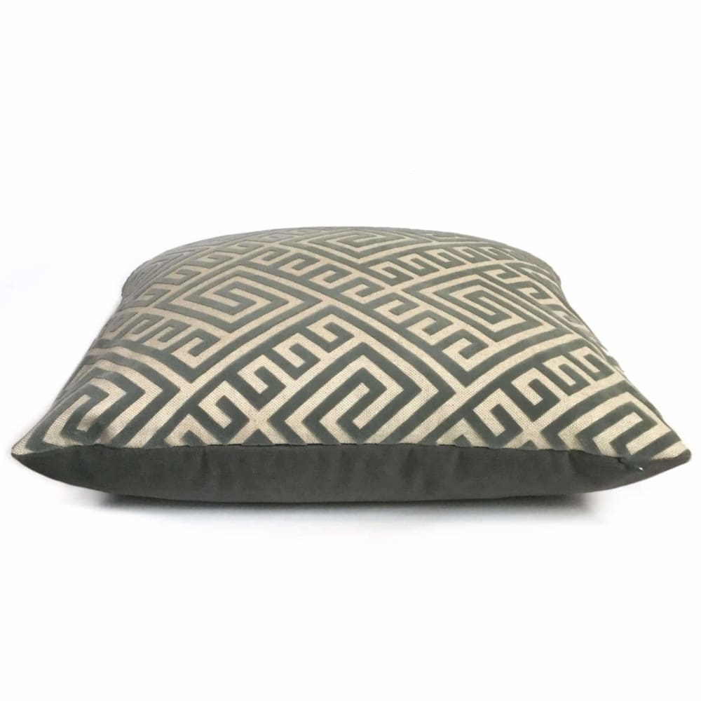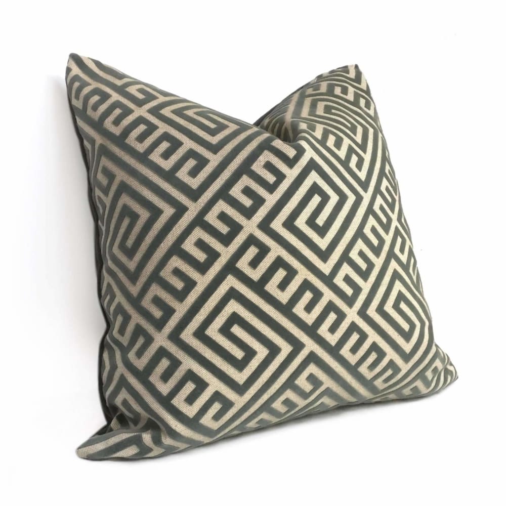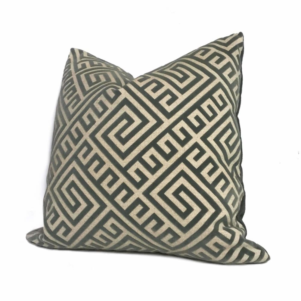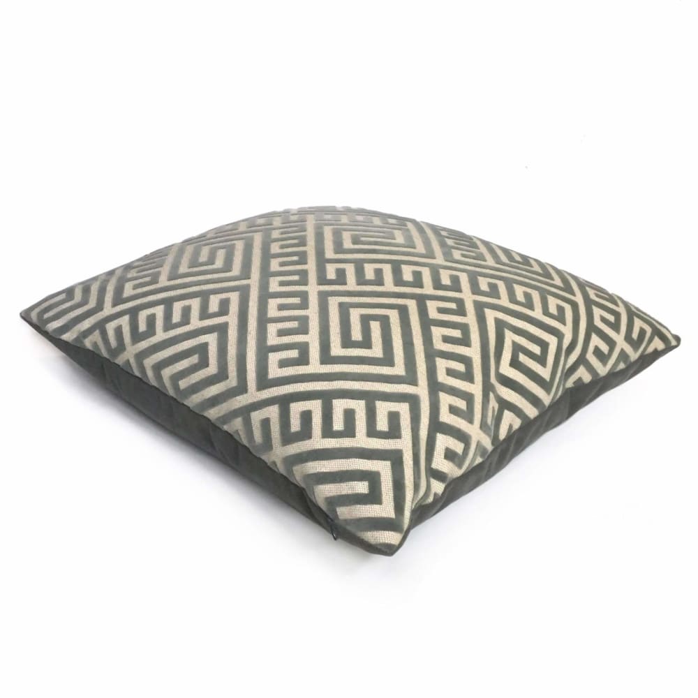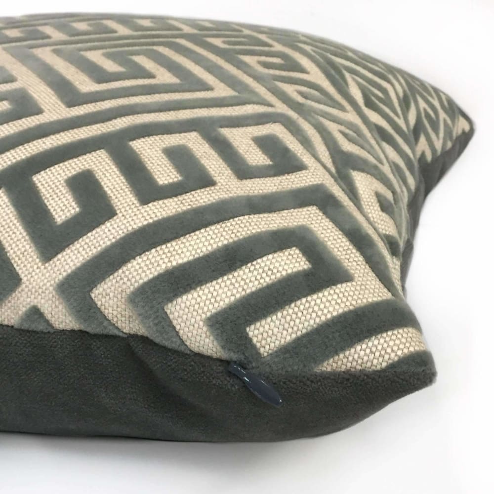 This gray velvet pillow cover features a classic Greek key geometric pattern woven in thunder gray flocked velvet on a beige woven background. The neutral colors will blend into many different decors!