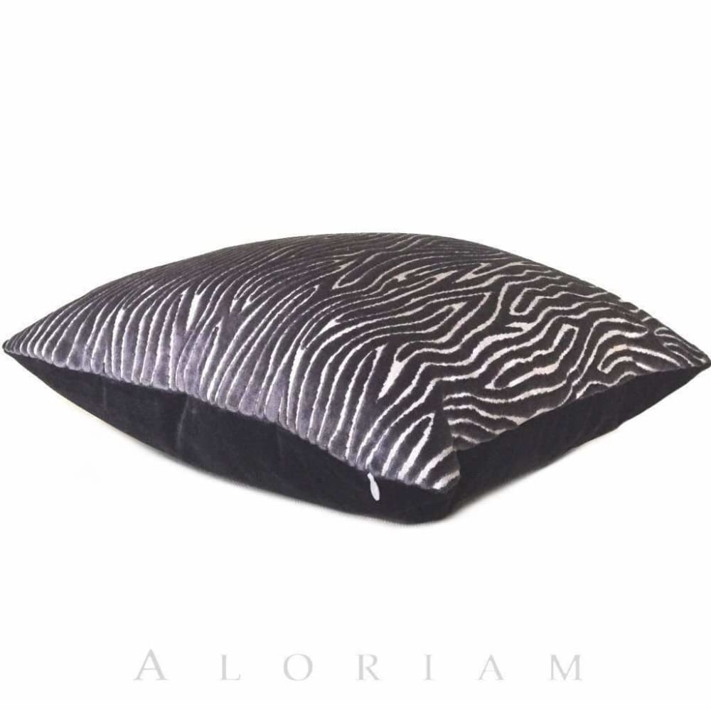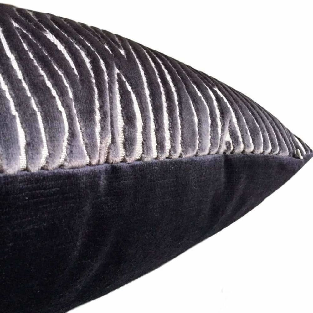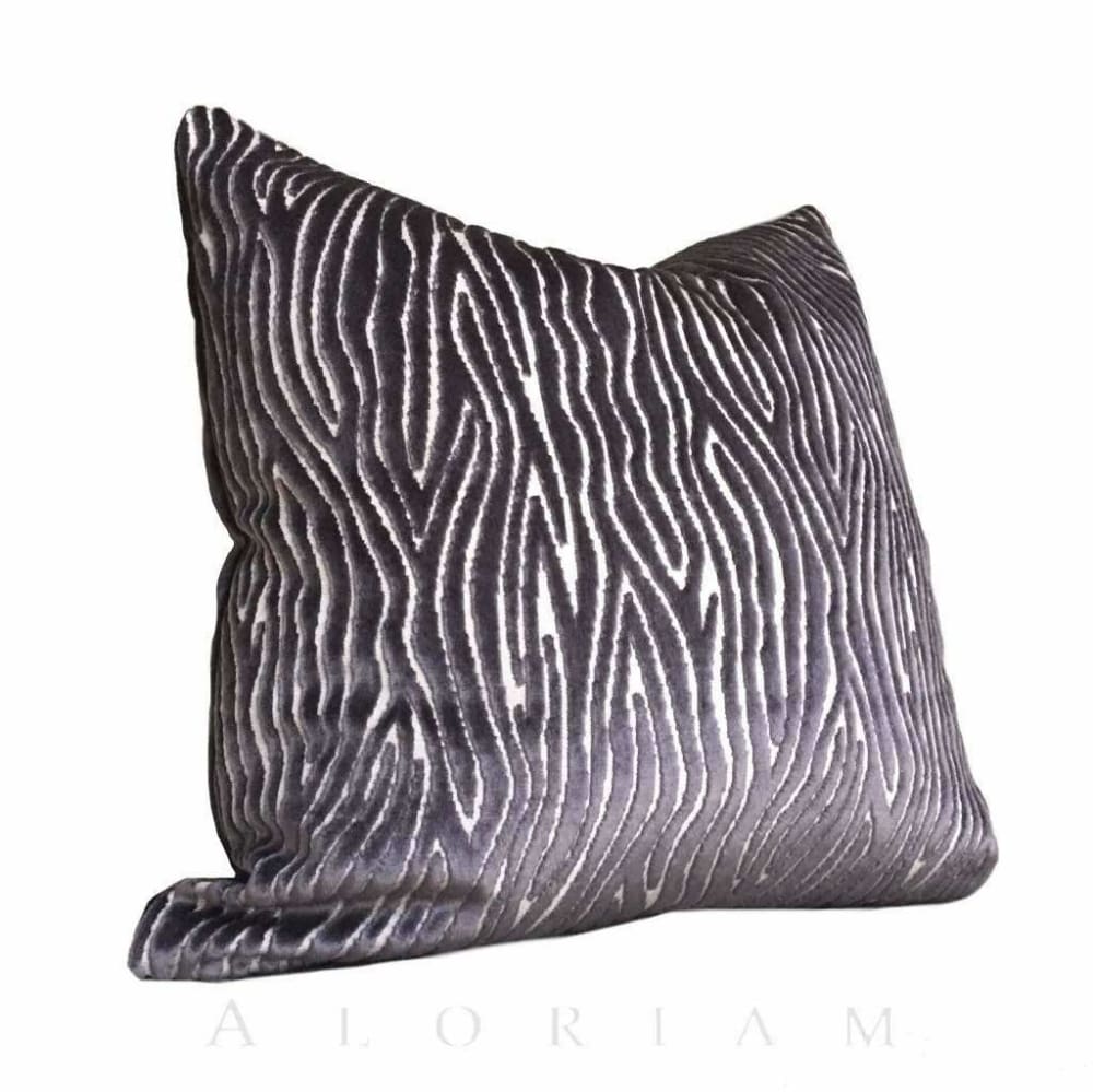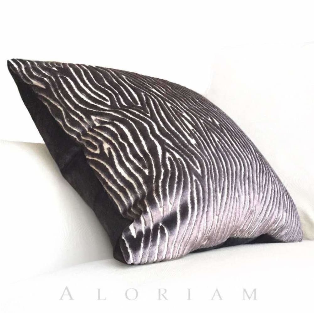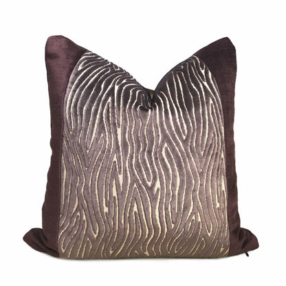 This designer cut velvet fabric pillow cover features an abstract faux bois like pattern woven in smoky brown with purple undertones. The cover reverses to a coordinating solid color velvet on the backside. So gorgeous! Limited availability. Note: The rectangular sizes will have the pattern positioned horizontally. Photographed on 17x17 cover (filled with 18x18 insert). Almost sold out!