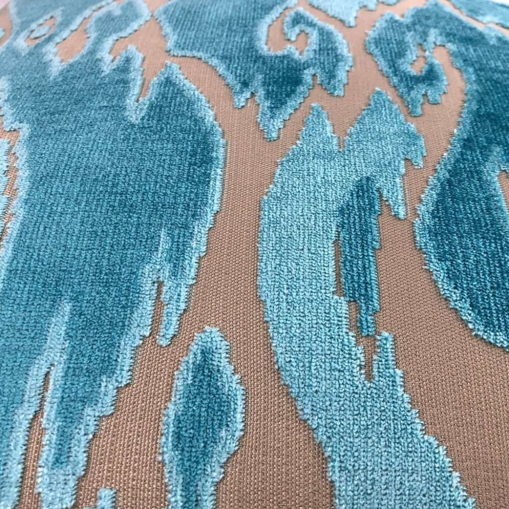 The Xanadu pillow combines a bold ethnic motif woven in lustrous turquoise blue velvet on a matte beige background.