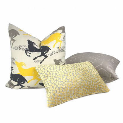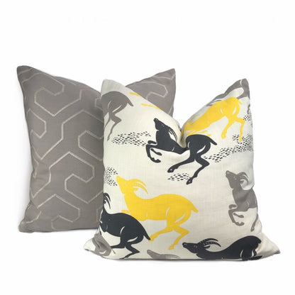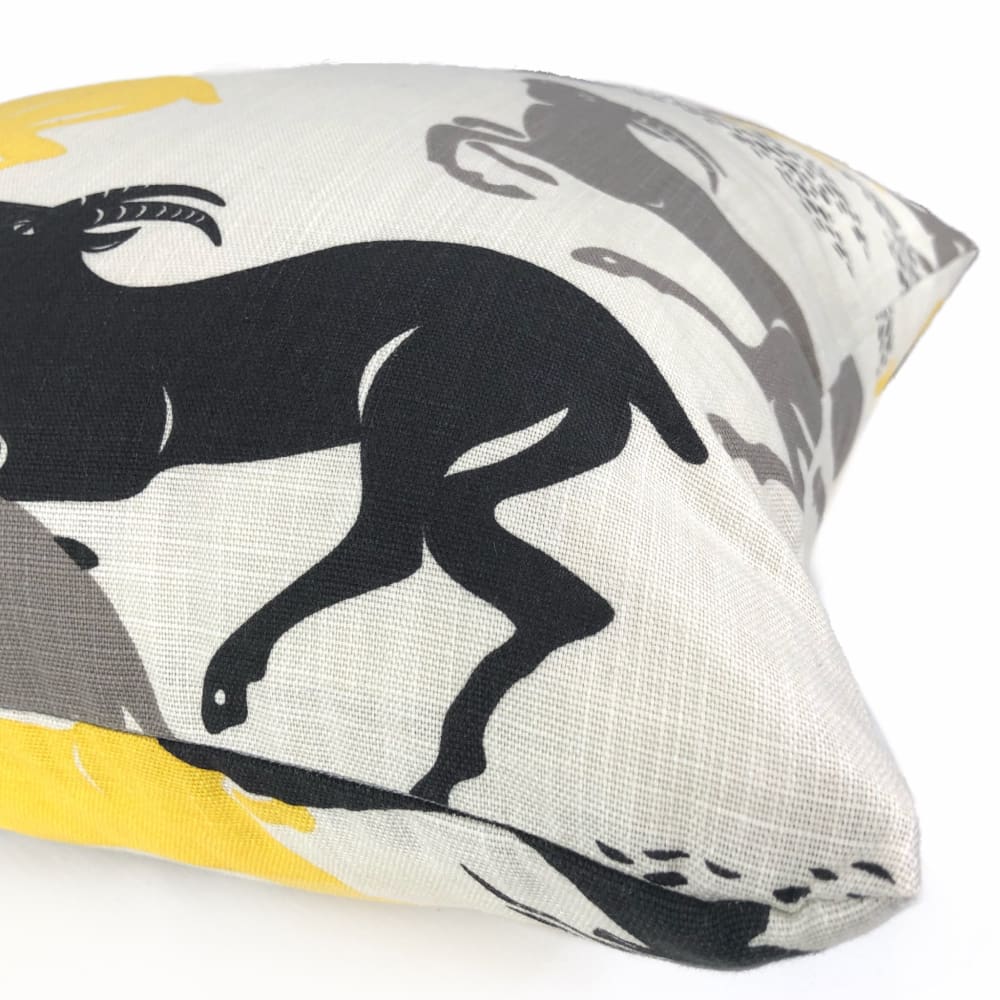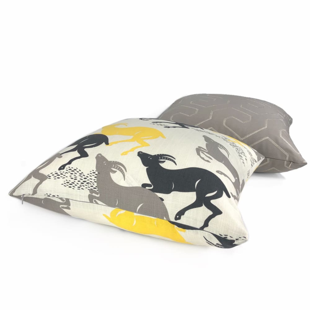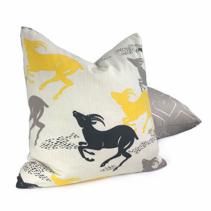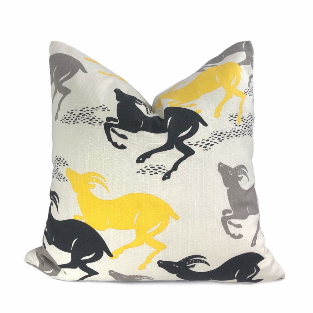 Sewn in a gorgeous Robert Allen Dwell Studio designer fabric of running antelopes in colors of yellow, gray, black and off-white, this pillow cover will breathe new life into your decor! Pattern fabric is used on both sides of the cover. Each side of cover will feature different segments of this print.
