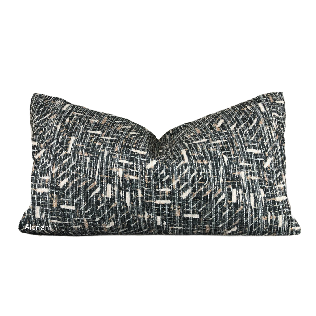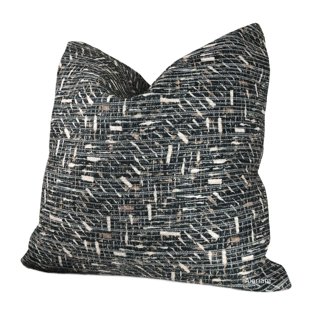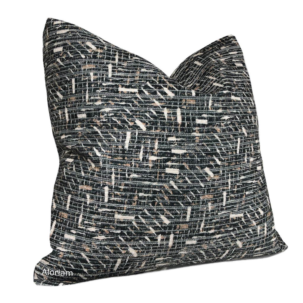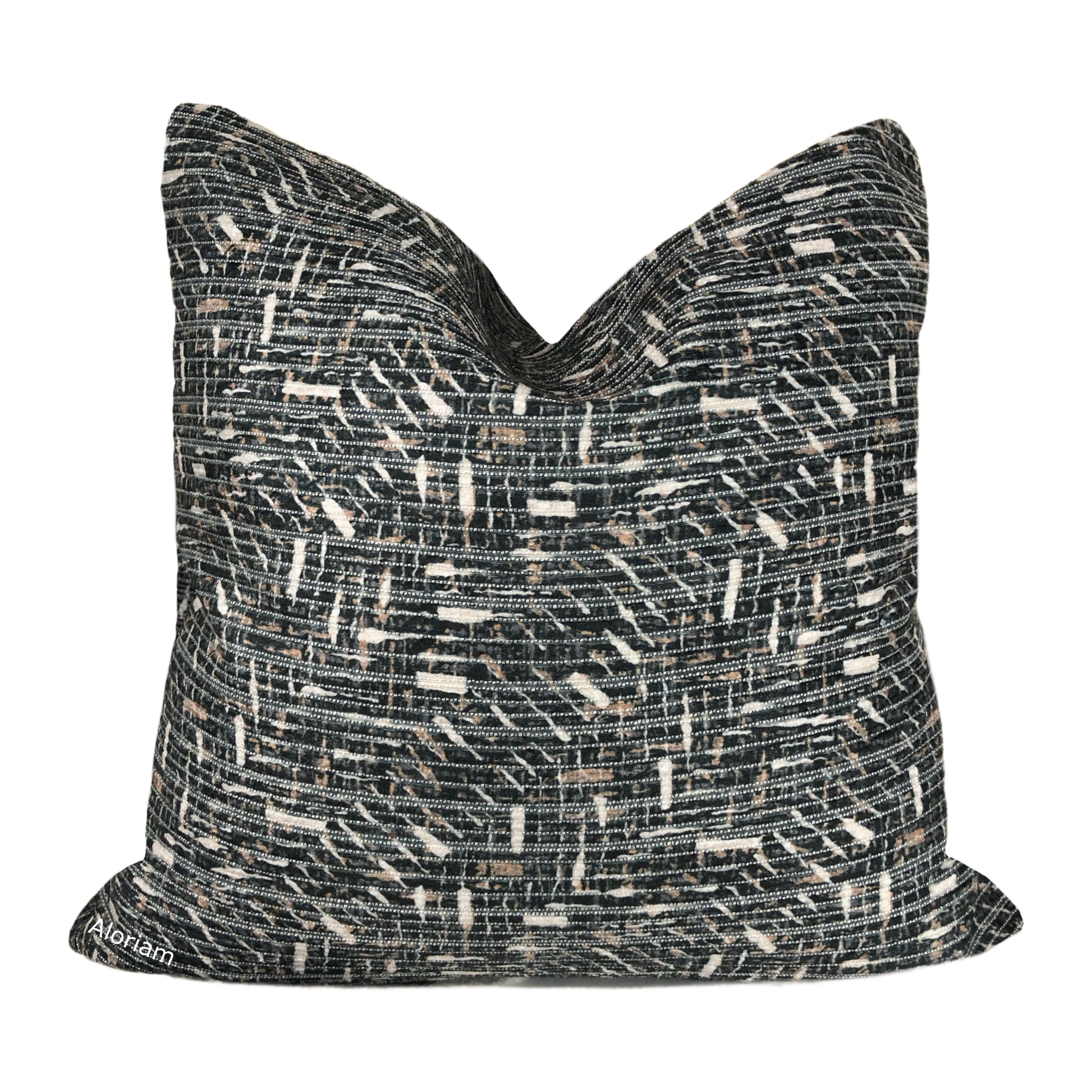 The Edwin pillow cover features a crosshatch design woven in a charcoal-black mix chenille with brown and white accents. Adding to the interesting texture are thin beaded-weave lines throughout.