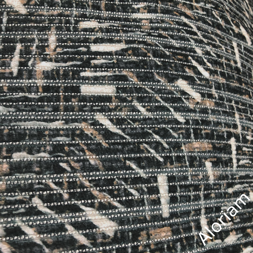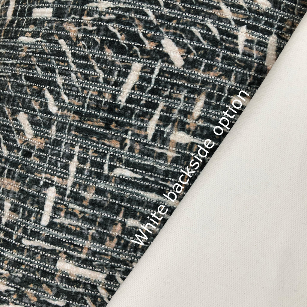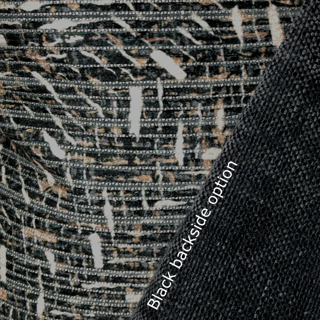 Offered in your choice of a coordinating solid black or white backside. Pattern fabric is an upholstery weight chenille in a rayon polyester cotton blend.