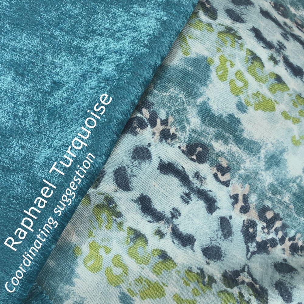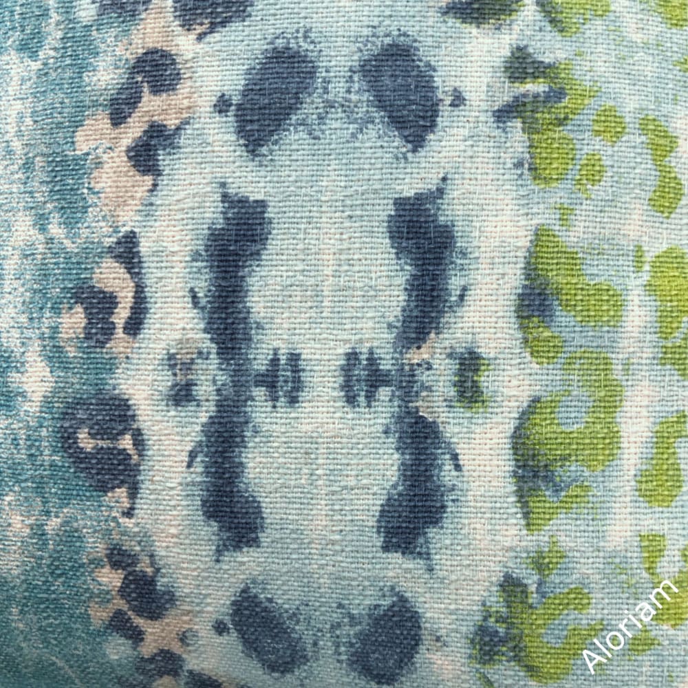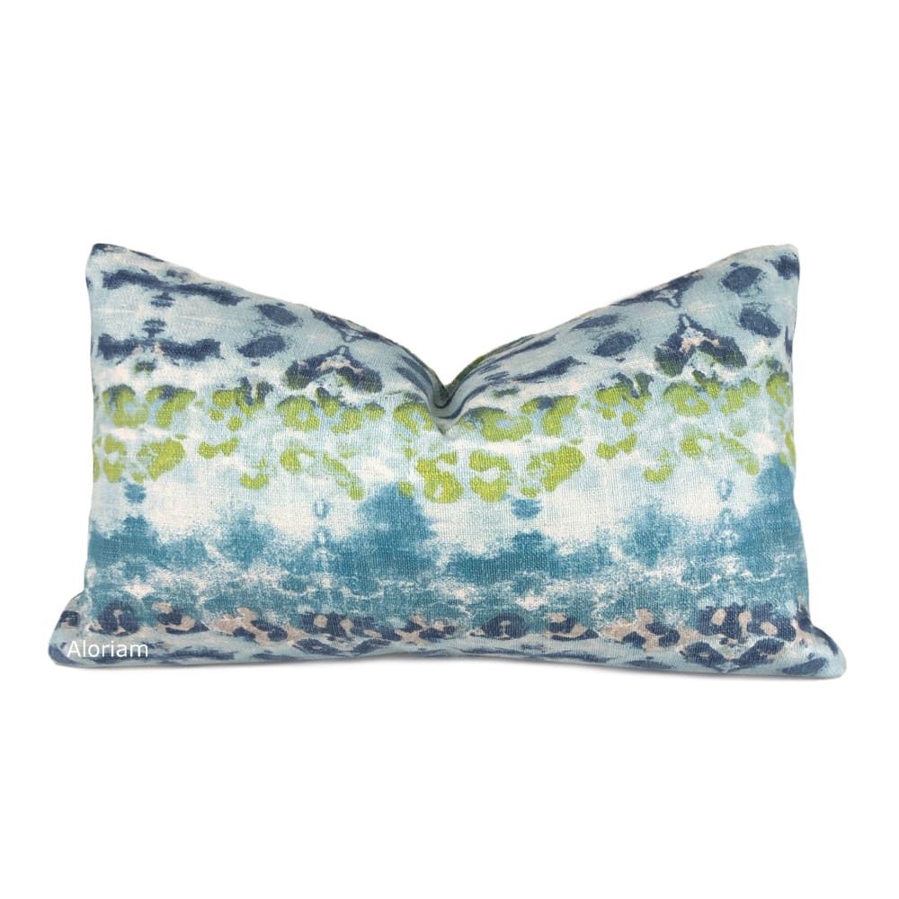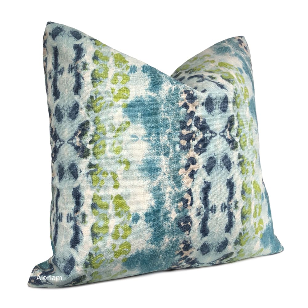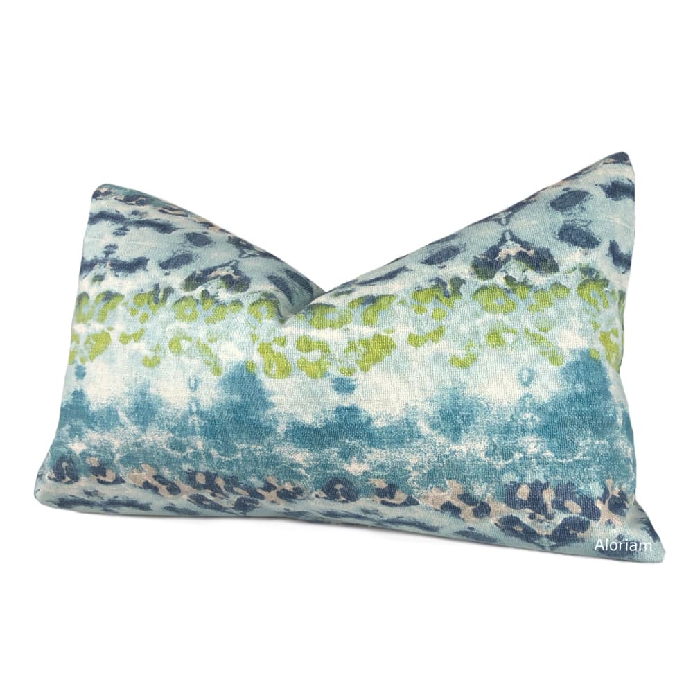 The Eidele pillow cover features an aquatic color palette of blues, greens, aqua and teal and an abstract animal spotted design. Pattern cotton print fabric on both sides.